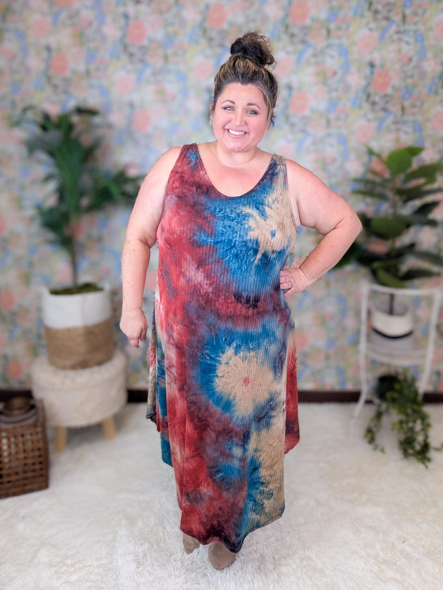 Nico Ribbed Midi Tank Dress in Red, Teal + Taupe Tiedye