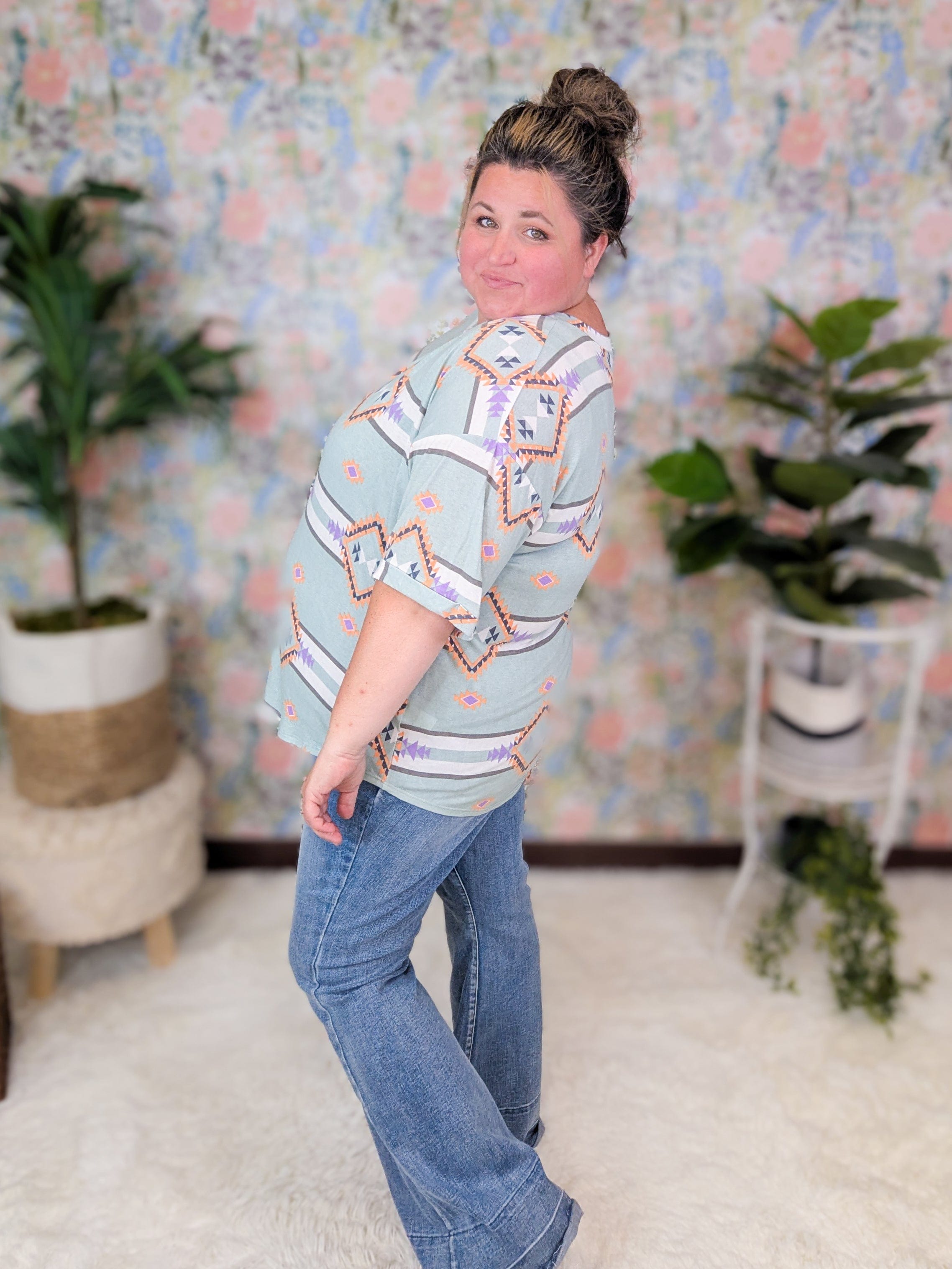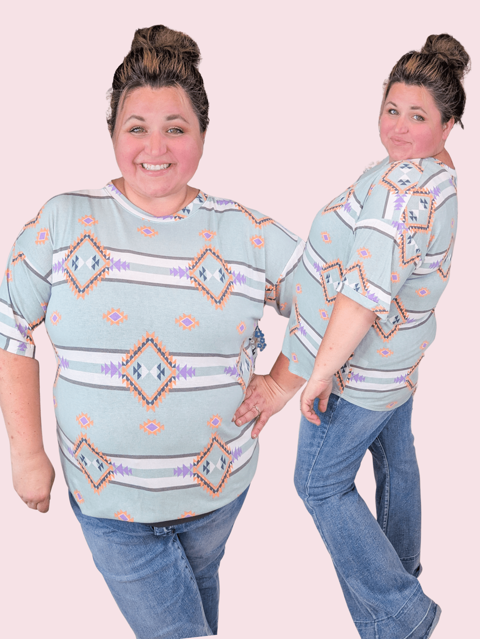 The Susie proves that some prints work in every season. The seafoam base with its subtle Aztec design pulls in charcoal, orange, ivory, and purple — colors that shift easily from spring to summer to fall. Pair it with bright layers when it’s warm or deeper tones as the weather cools, and you’ll find yourself reaching for it all year long.
