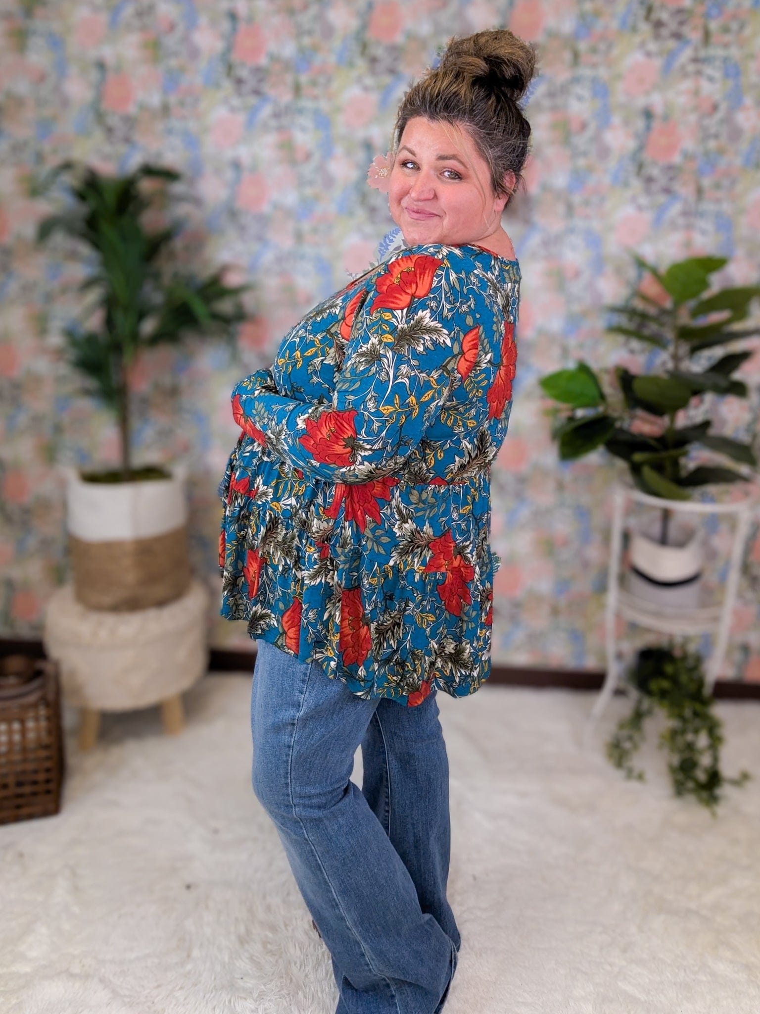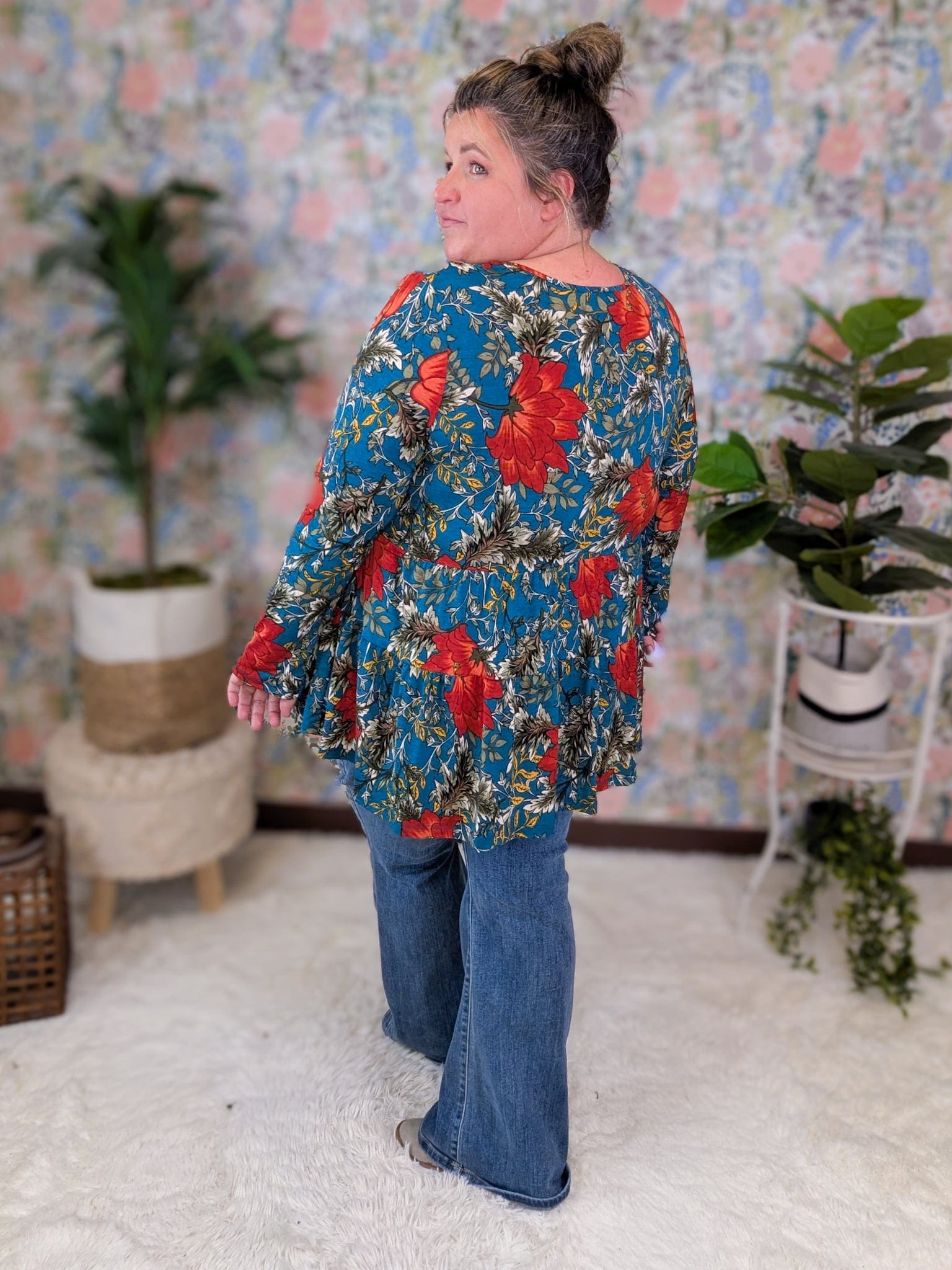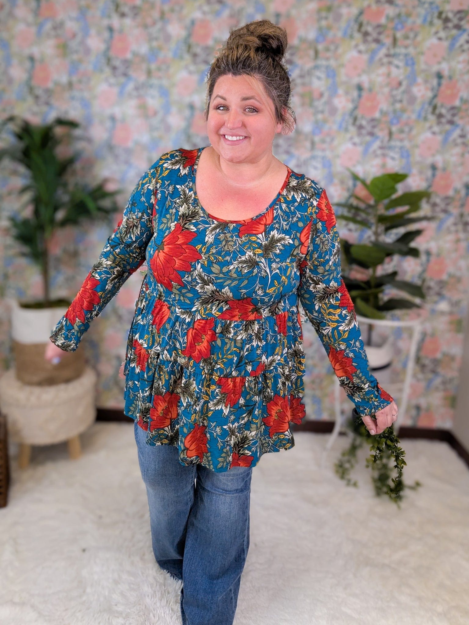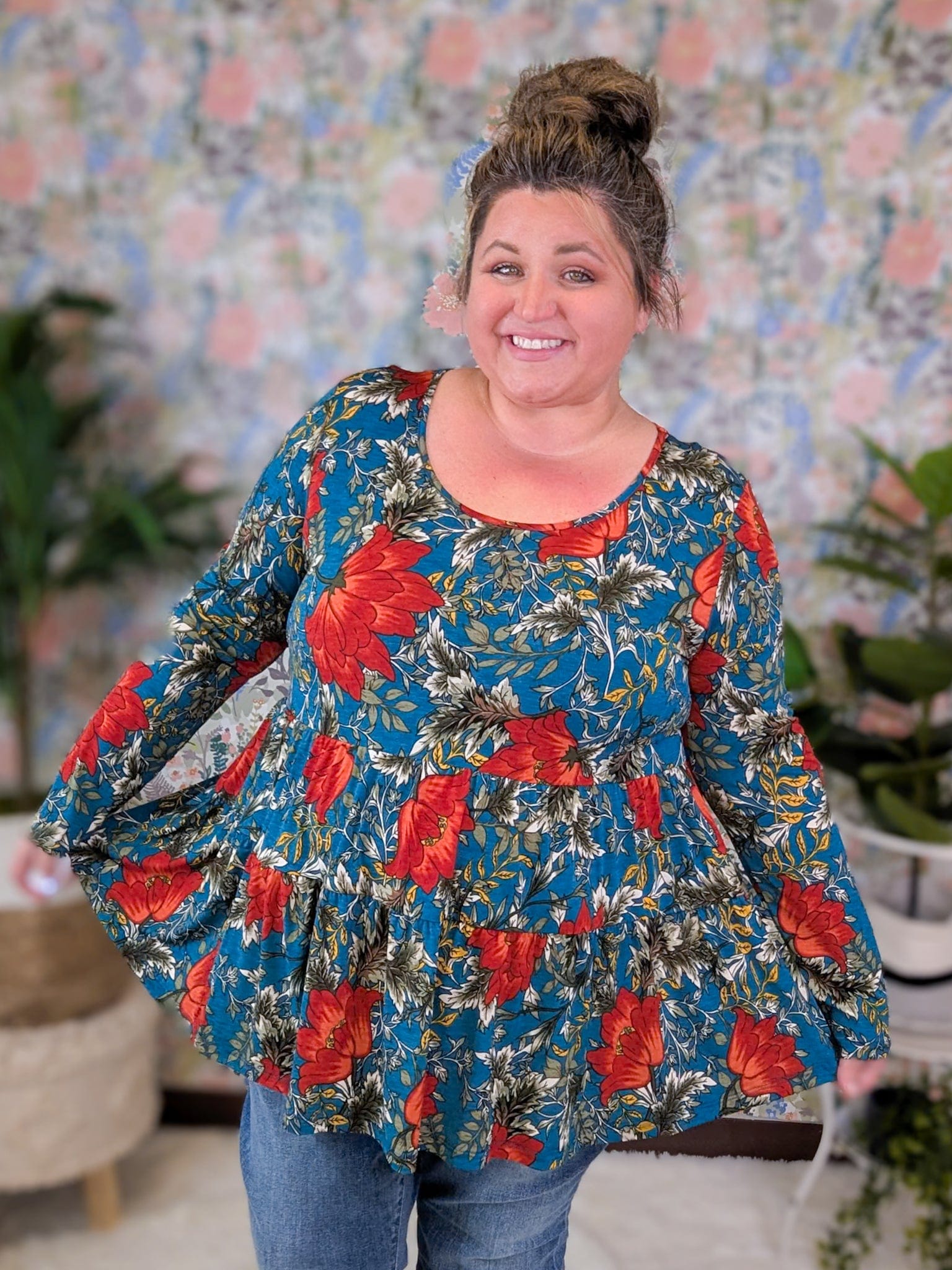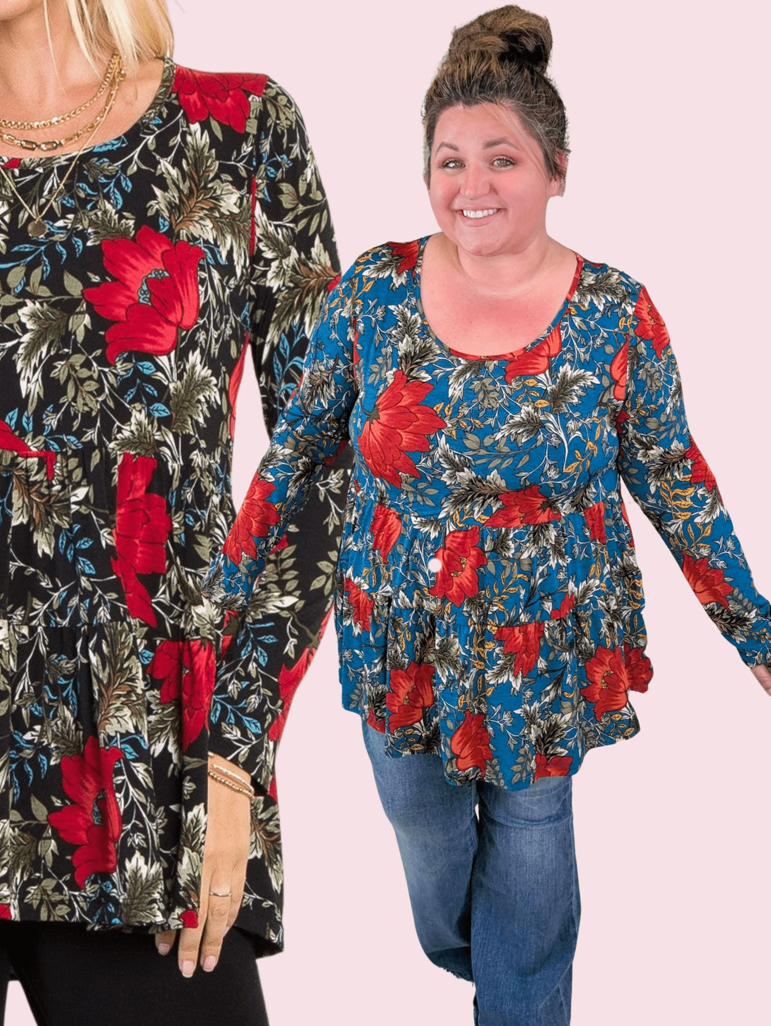 Looking for a top that actually creates shape while still giving you plenty of room to breathe? This double-tiered scoopneck is the perfect blend of flattering and comfortable. The elastic waist hits right at your natural waistline to define without squeezing, while the tiers add flow through the belly and hips. Long fitted sleeves make it an easy layering piece, and the wrinkle-free Bulgari fabric means it’s as low-maintenance as it is stylish. Choose black or teal with floral prints that transition effortlessly from work to weekend.