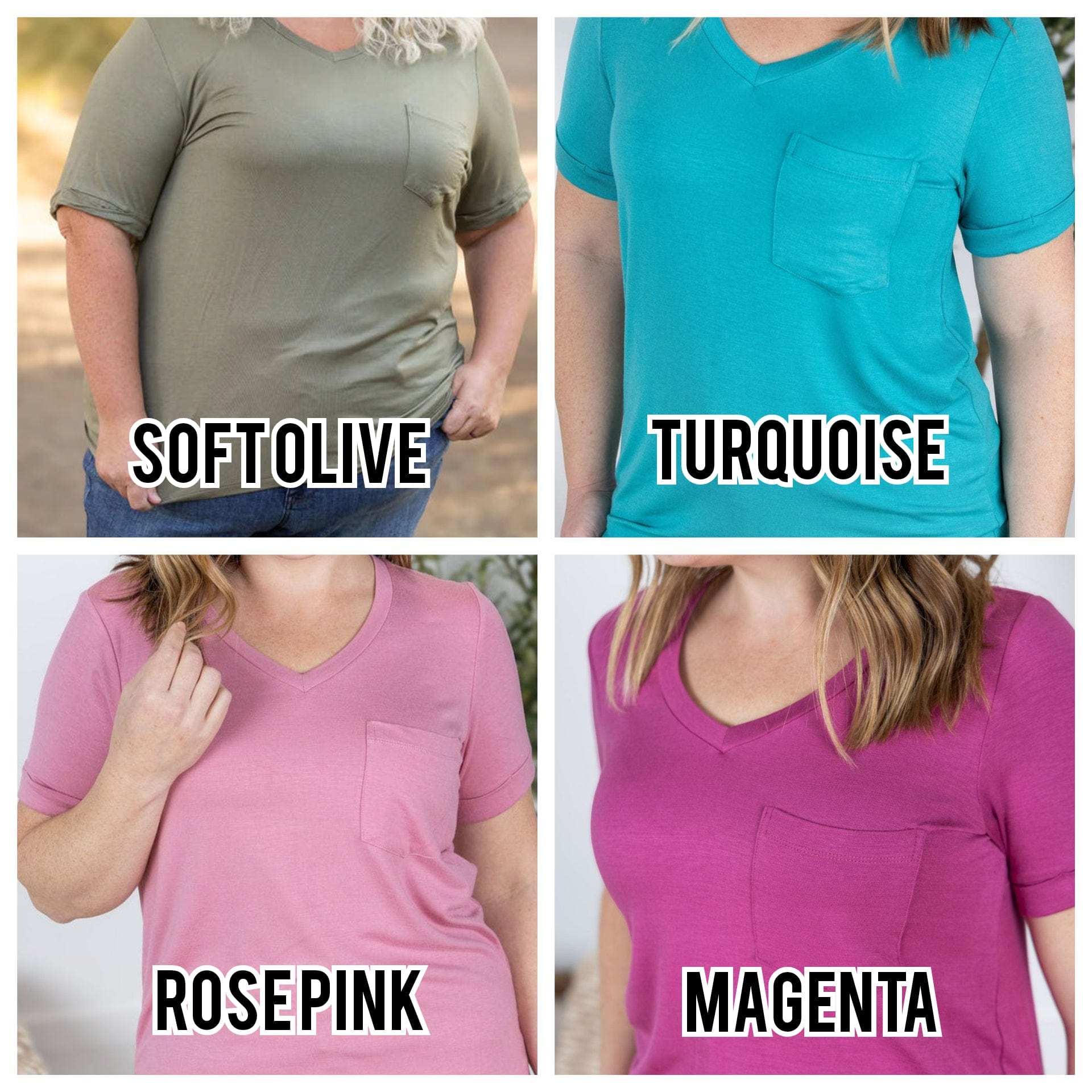 We don’t like to play favorites… but if you twisted our arms, this tee would win every time. That almost-elbow sleeve with the pinned cuff (never unrolls!), the perfectly placed chest pocket, and the modest v-neck with a flattering cut — it’s just fitted enough up top, with that relaxed room through the belly where you actually want it. One of those pieces you grab once, then come back for in every color. Seriously, you’ll fall in love.