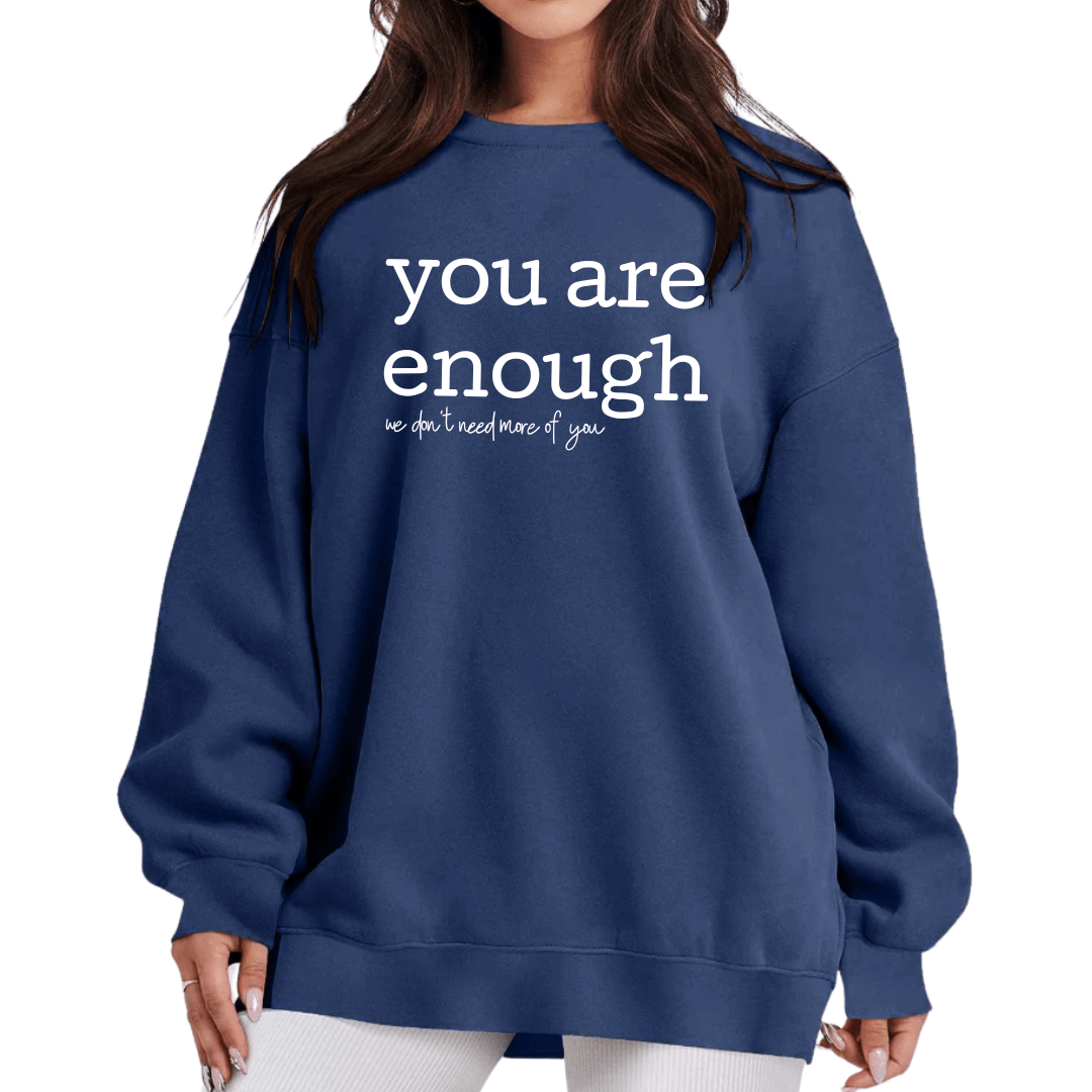 Sometimes you just need a sweatshirt that says what everyone’s thinking — and this one nails it. The “You Are Enough (We Don’t Need More of You)” graphic brings that perfectly sarcastic energy while still feeling soft, comfy, and totally wearable. It’s the kind of humor that makes people laugh twice — first at the “aww,” then at the “oh wait, that’s hilarious.” Easy to throw on, easy to love, and just the right mix of cozy and cheeky.