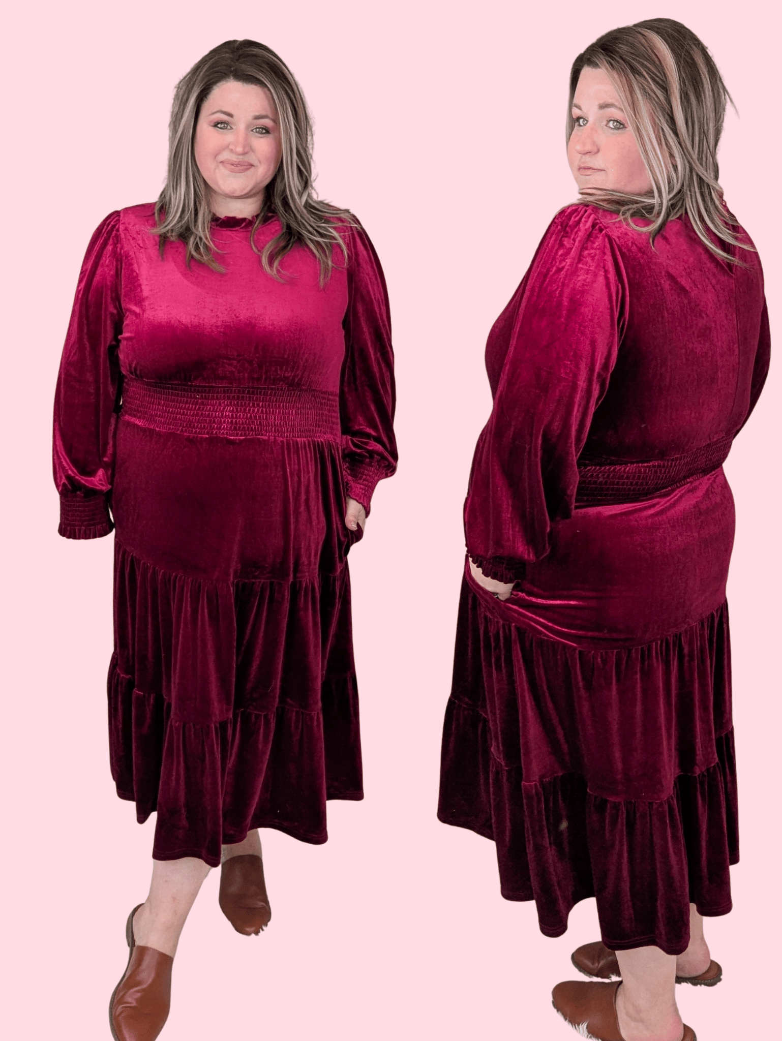 If your idea of holiday magic is all about that classic Christmas elegance, this dress is it. The deep cherry burgundy velour gives total vintage glam while still feeling modern and effortless. The smocked waist and sleeve cuffs add shape without squeeze, and that soft velvety shine is made for candlelight, Christmas music, and a little sparkle. It’s timeless, stunning, and the definition of holiday perfection.