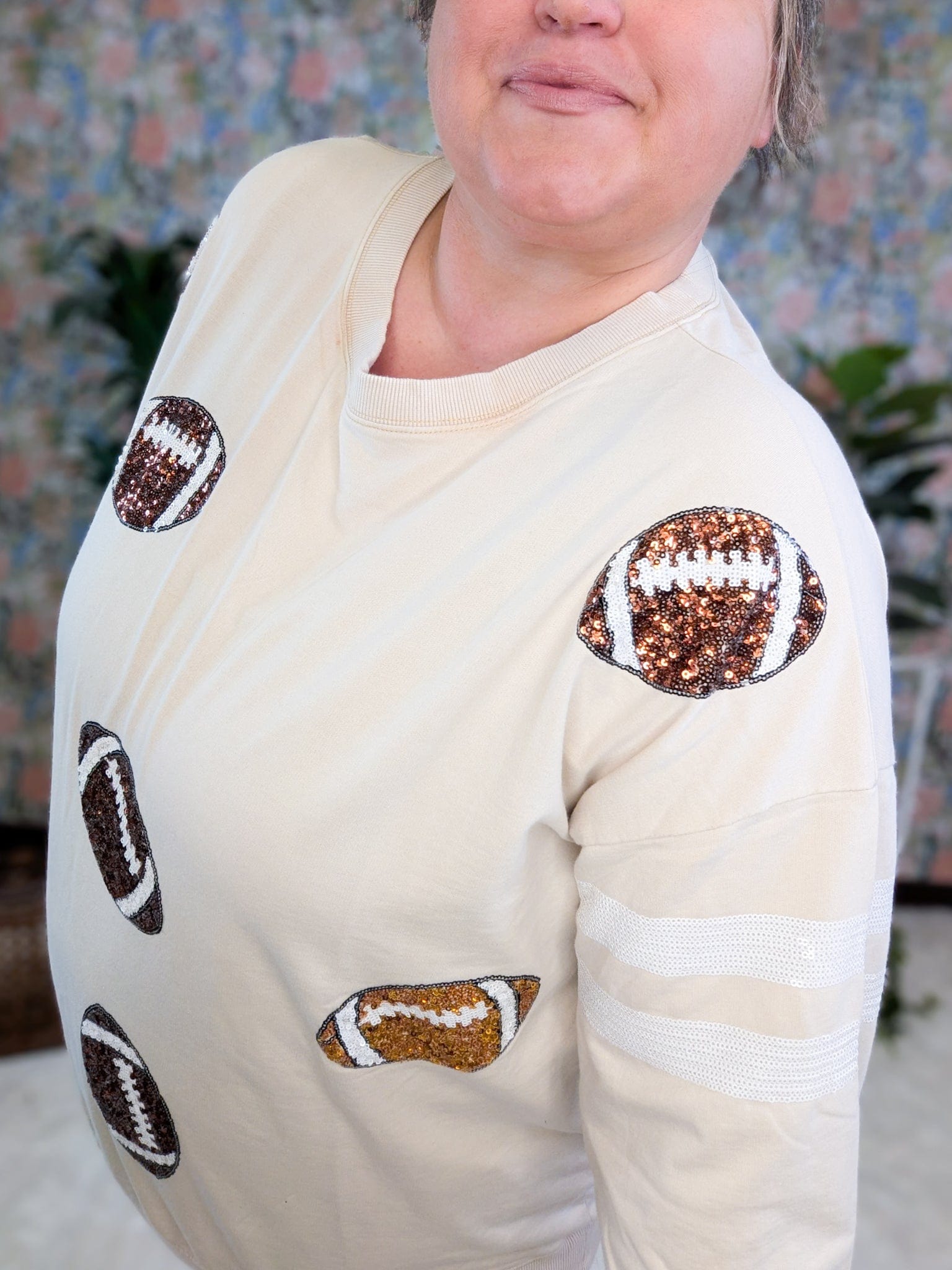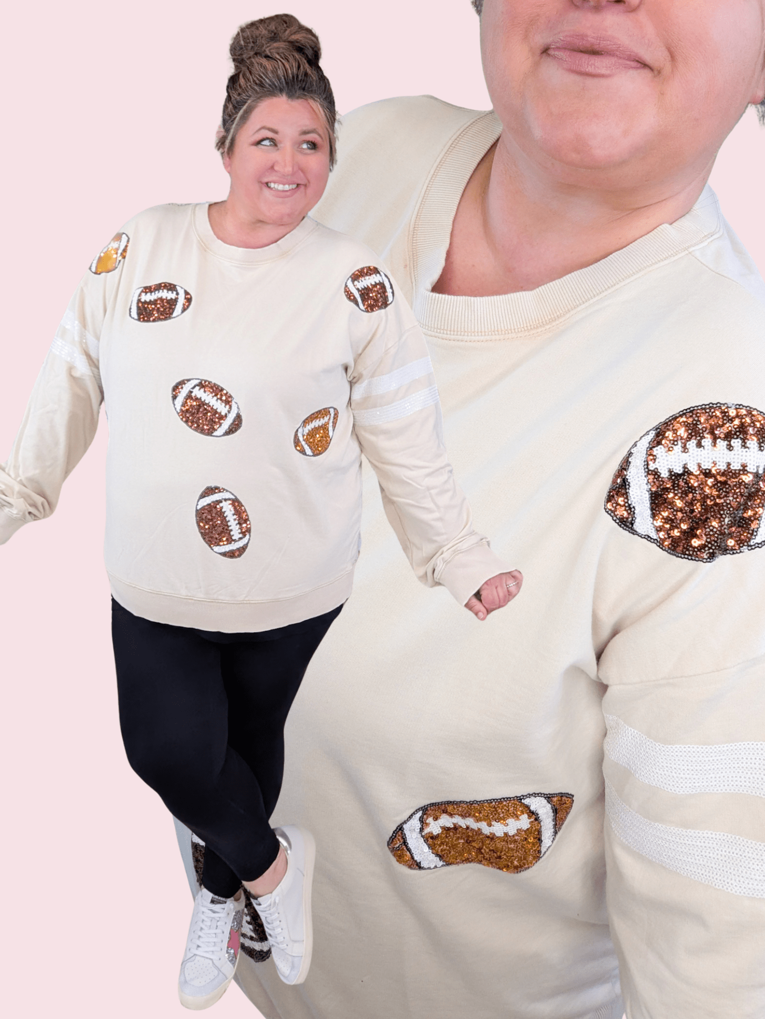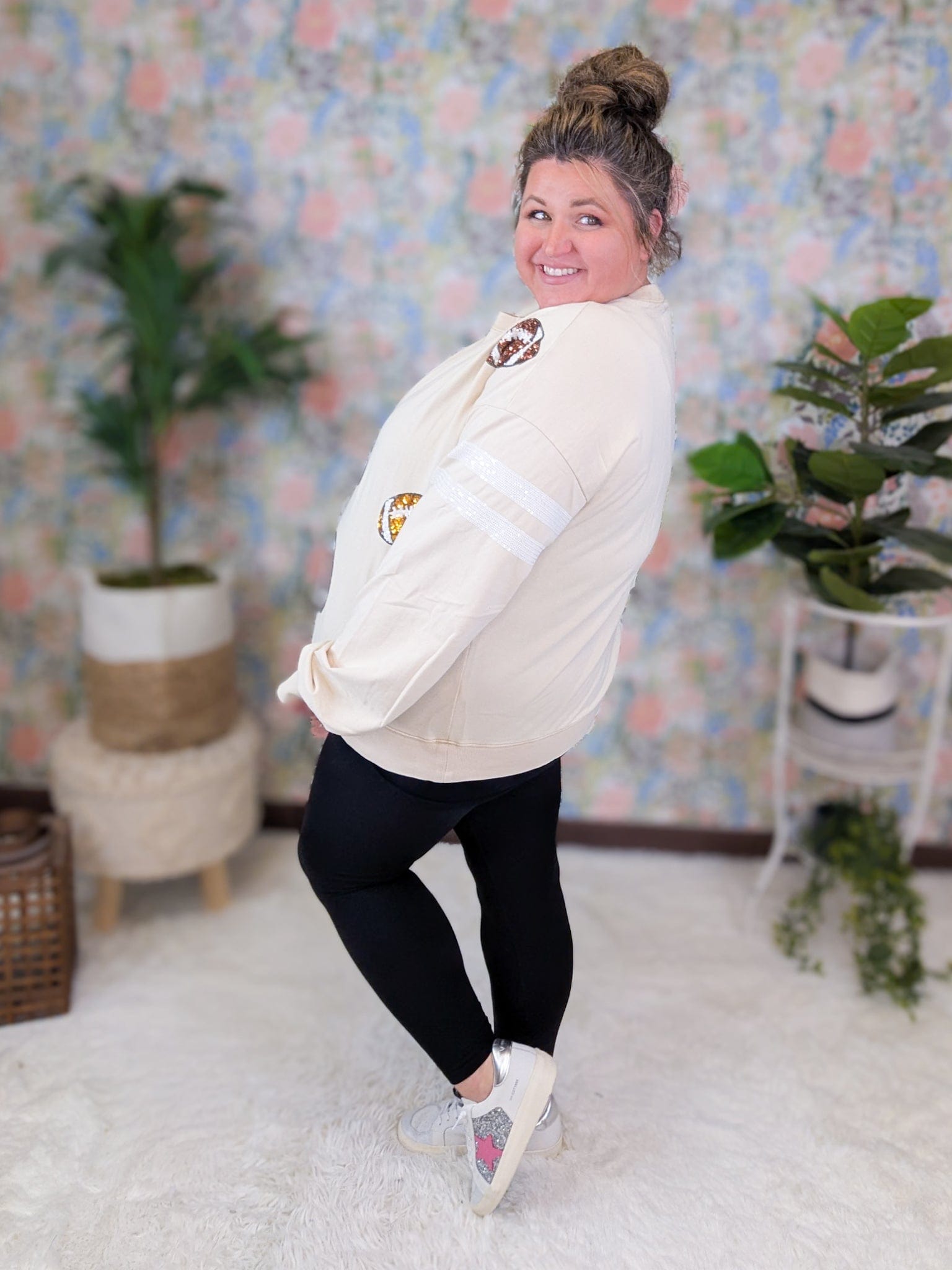 Cheer on your team in style with the perfect gameday pullover that sparkles just as much as your team spirit. This beige sweatshirt-style top has sequin patch footballs across the front, varsity-inspired white sequin sleeve stripes, and just the right relaxed fit for comfort. Lightweight cotton makes it easy to wear all season, while the drop shoulder gives you a touch of extra room. Whether layered up with a vest or worn solo, this pullover is the winning play for your gameday lineup.