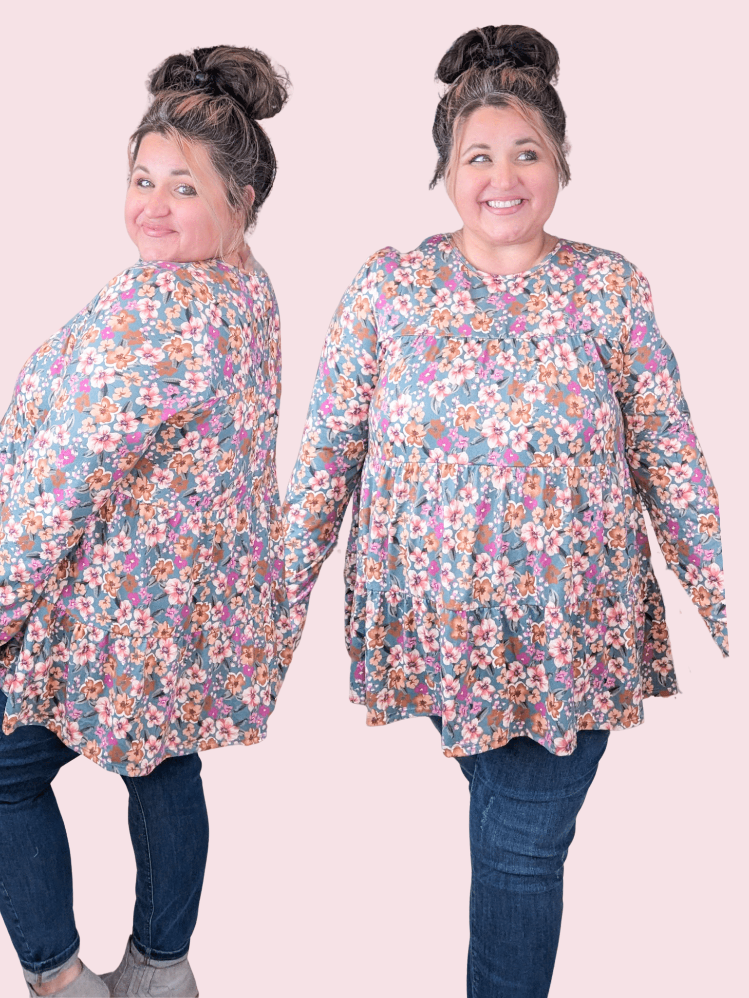 It’s rare to find a top that feels flowy and roomy but still gives you shape — and that’s exactly why this one’s a win. The tiered seams create a flattering waistline while the soft, stretchy fabric drapes beautifully through the midsection, giving you comfort without losing definition. With its gorgeous faded teal base and pop floral print, it’s a piece you’ll wear on repeat through every season.