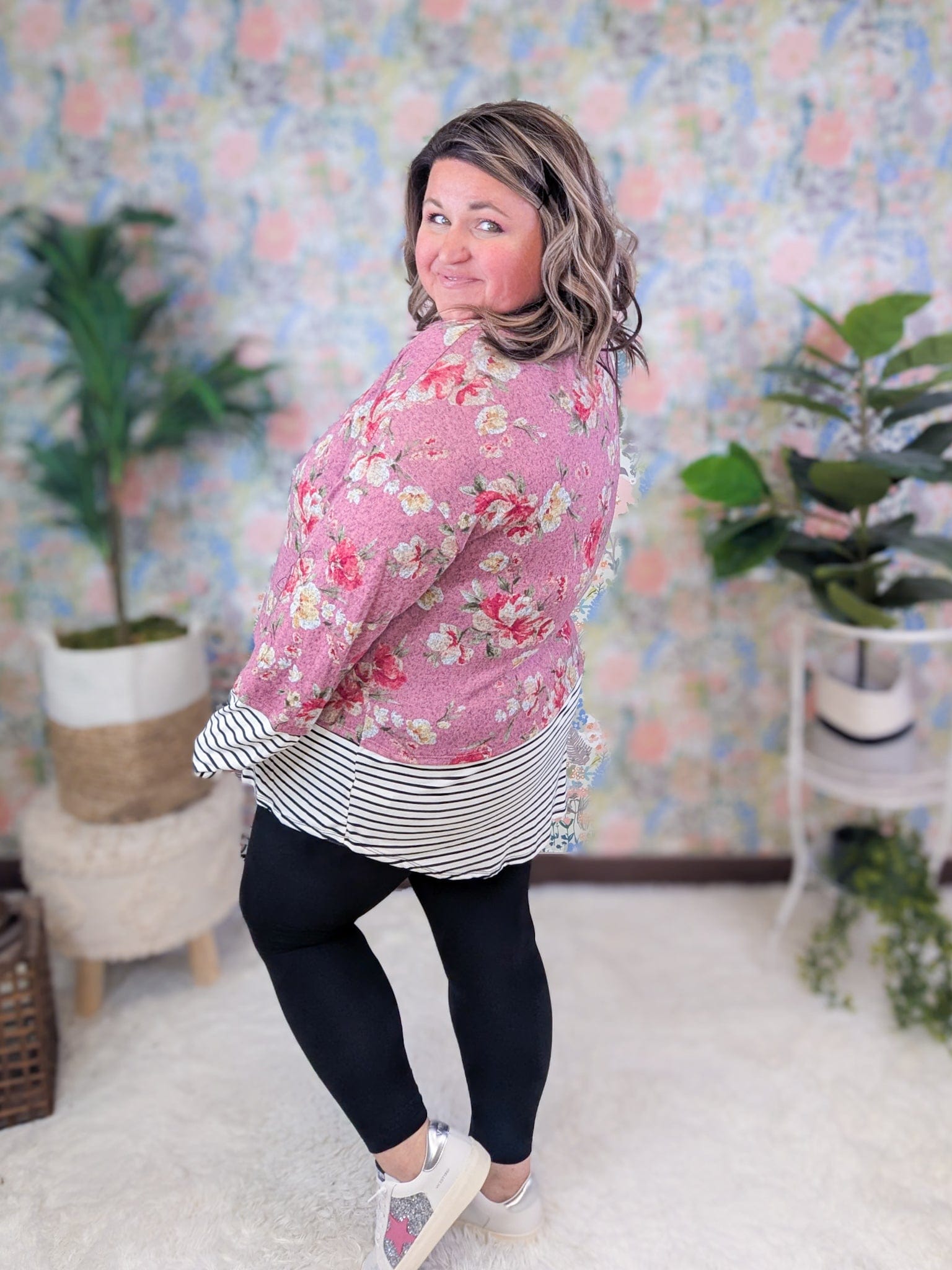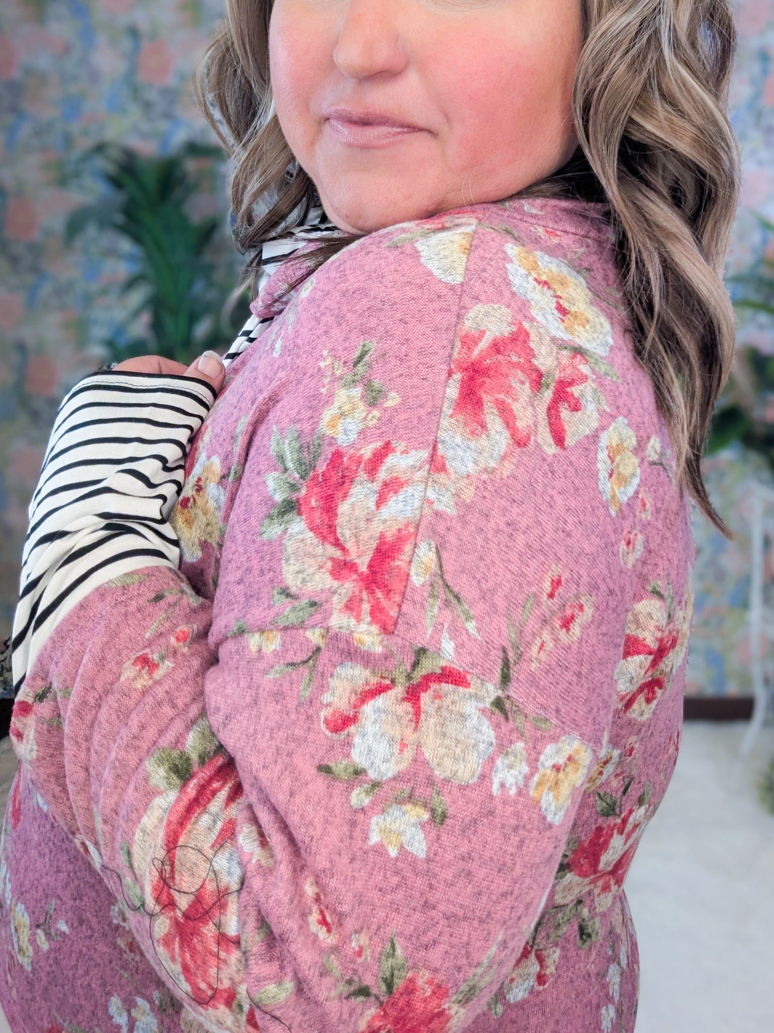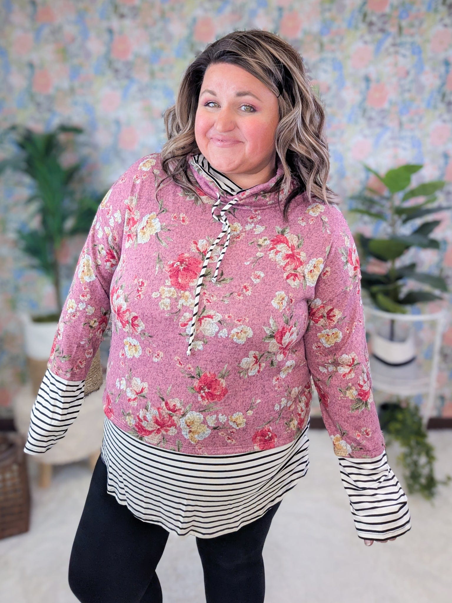 Love a funnelneck that’s cozy without the bulk? The Sheila checks every box with its soft fleecy feel, stretchy comfort, and flattering mauve floral base. The striped accents on the cuffs, hem, drawstrings, and funnel lining give it that playful layered vibe — and you can show more or less of the lining depending on your look. Long enough for leggings, polished enough for denim, and even office-ready, this one goes everywhere.