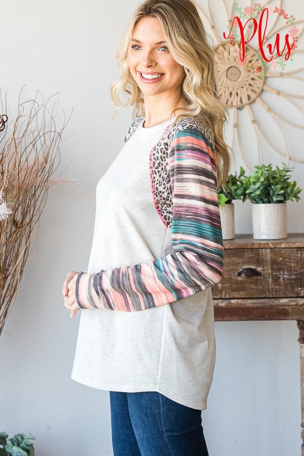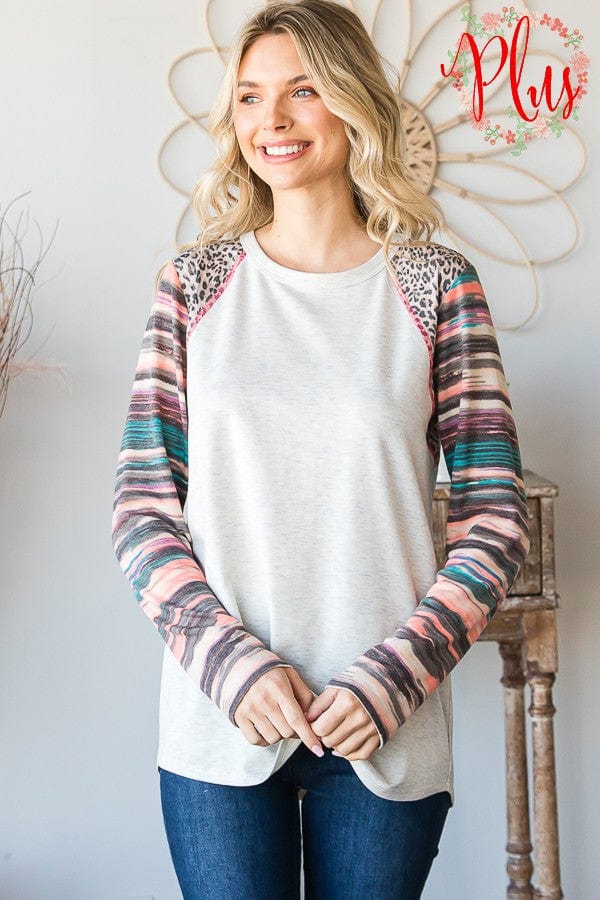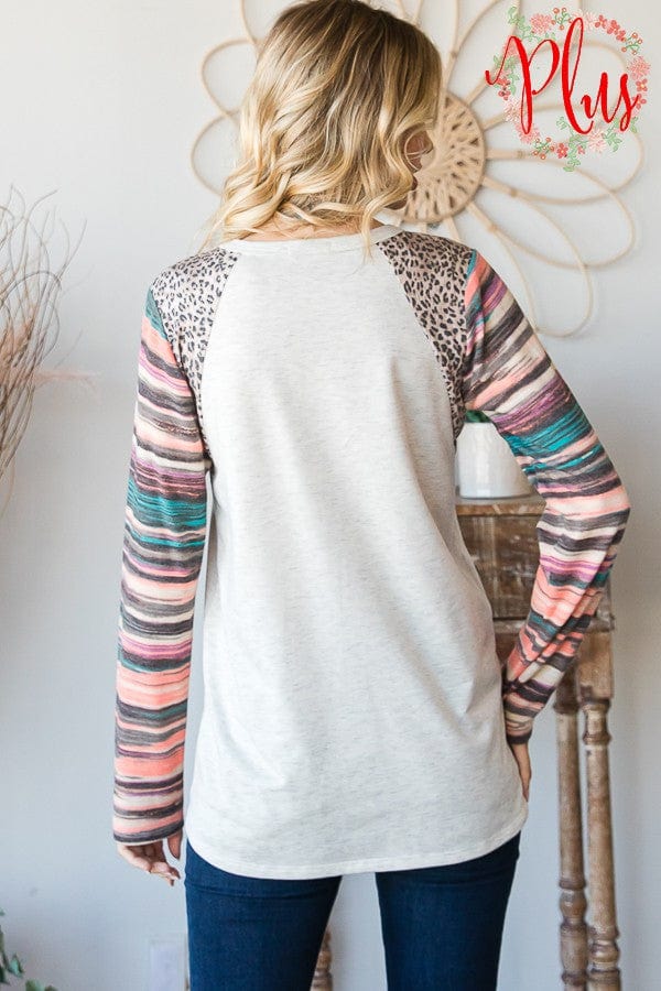 Not ready to choose between stripes or animal print? Why pick when you can have both. This top keeps things easy with a soft oatmeal base, then gives you that fun mix of bright stripes and a little hint of animal print on the sleeve. And the hot-pink seam stitching? It's that subtle little pop that makes people think you actually planned your outfit… even when you got dressed in 30 seconds and ran out the door. Cute, comfy, and zero styling stress. Yes please.