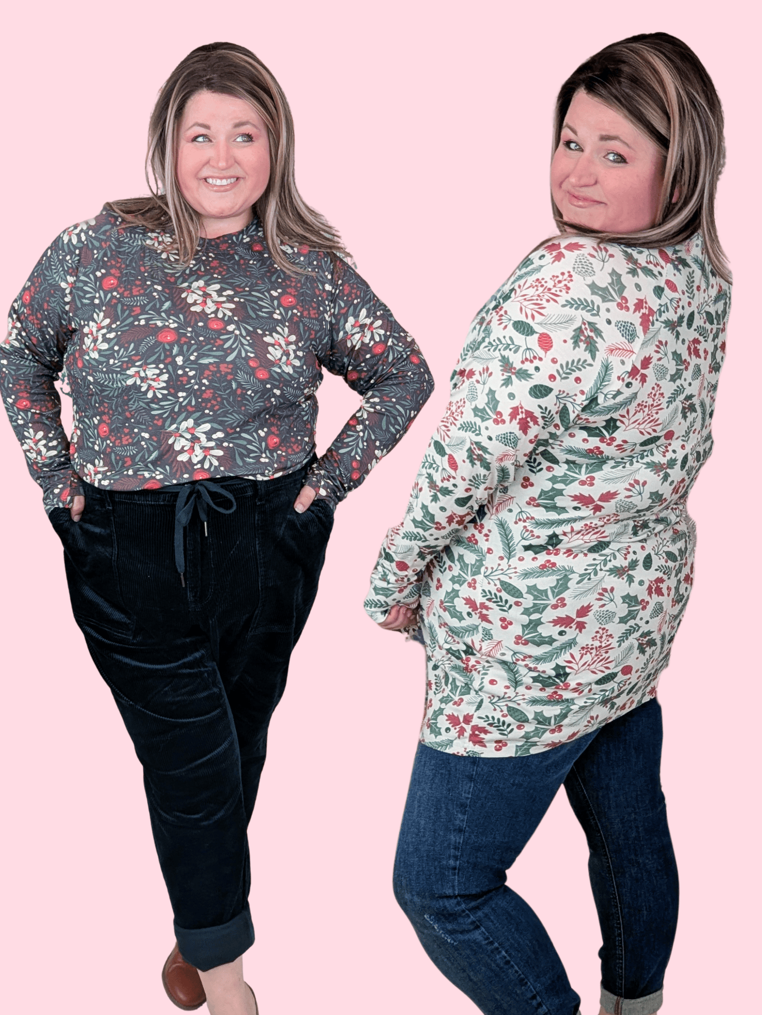 Looking for that perfect long sleeve that layers like a dream but still stands on its own? Meet your new holiday go-to. The Blair mockneck gives you that sleek, fitted look without the squeeze — soft, stretchy, and easy to tuck or scrunch depending on your vibe. With thumbholes (because we love a good thumbhole moment) and a lightly faded holiberry palette, it’s festive but wearable all winter long. Dress it up, layer it down, or pair it with your comfiest denim — it’s seriously that versatile.