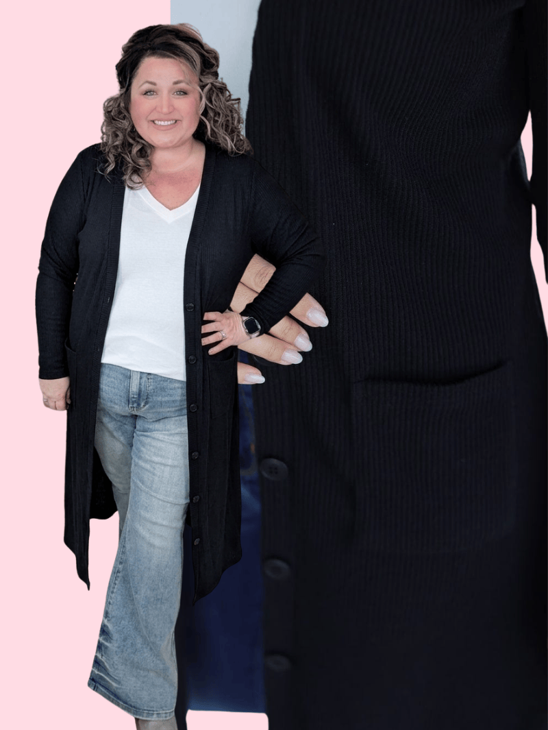 Looking for that perfect layer that works from fall through spring and makes every outfit feel pulled together? The Colbie Duster is lightweight, stretchy, and soft — never heavy — with the versatility to dress up or down in seconds. Wear it open for a laid-back vibe, or button it up with the oversized black buttons for a more polished look. With thumbholes, pockets, and an elevated rib knit texture, this one’s got all the cozy details without feeling bulky.