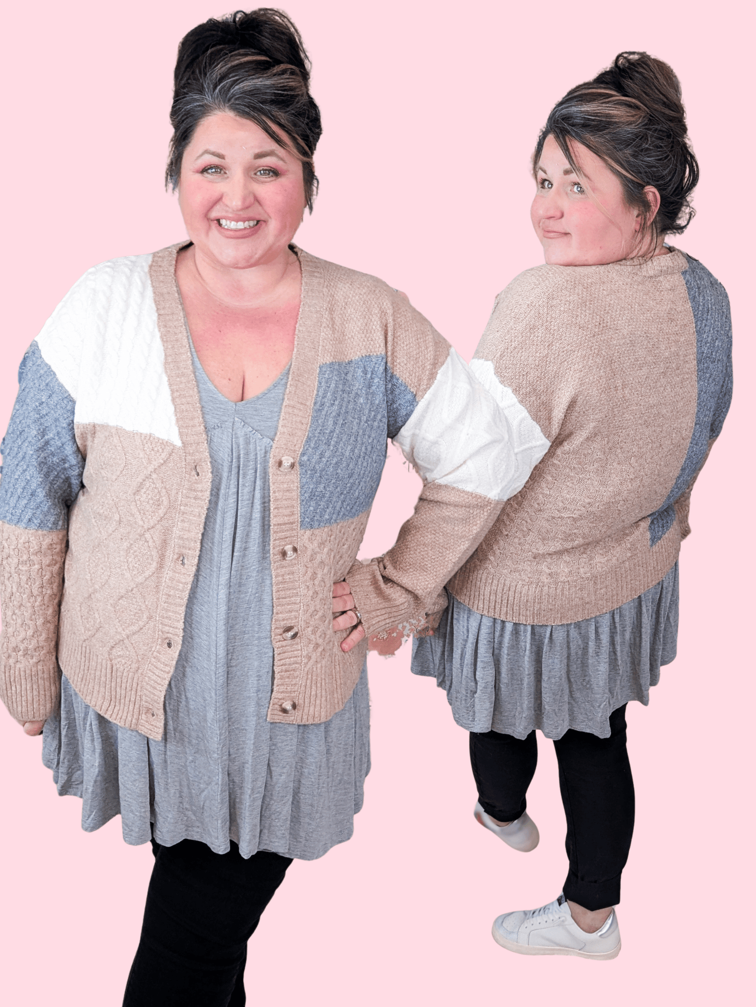 This is one of those cardigans that quietly steals the show. At first glance it’s all about the neutral color blocking, but once you see it in person you realize it’s the mix of textures that makes it feel so elevated. It’s soft, polished, and easy in that throw-on-and-go way, but still looks like you actually tried. Neutral lovers, this one is a must.