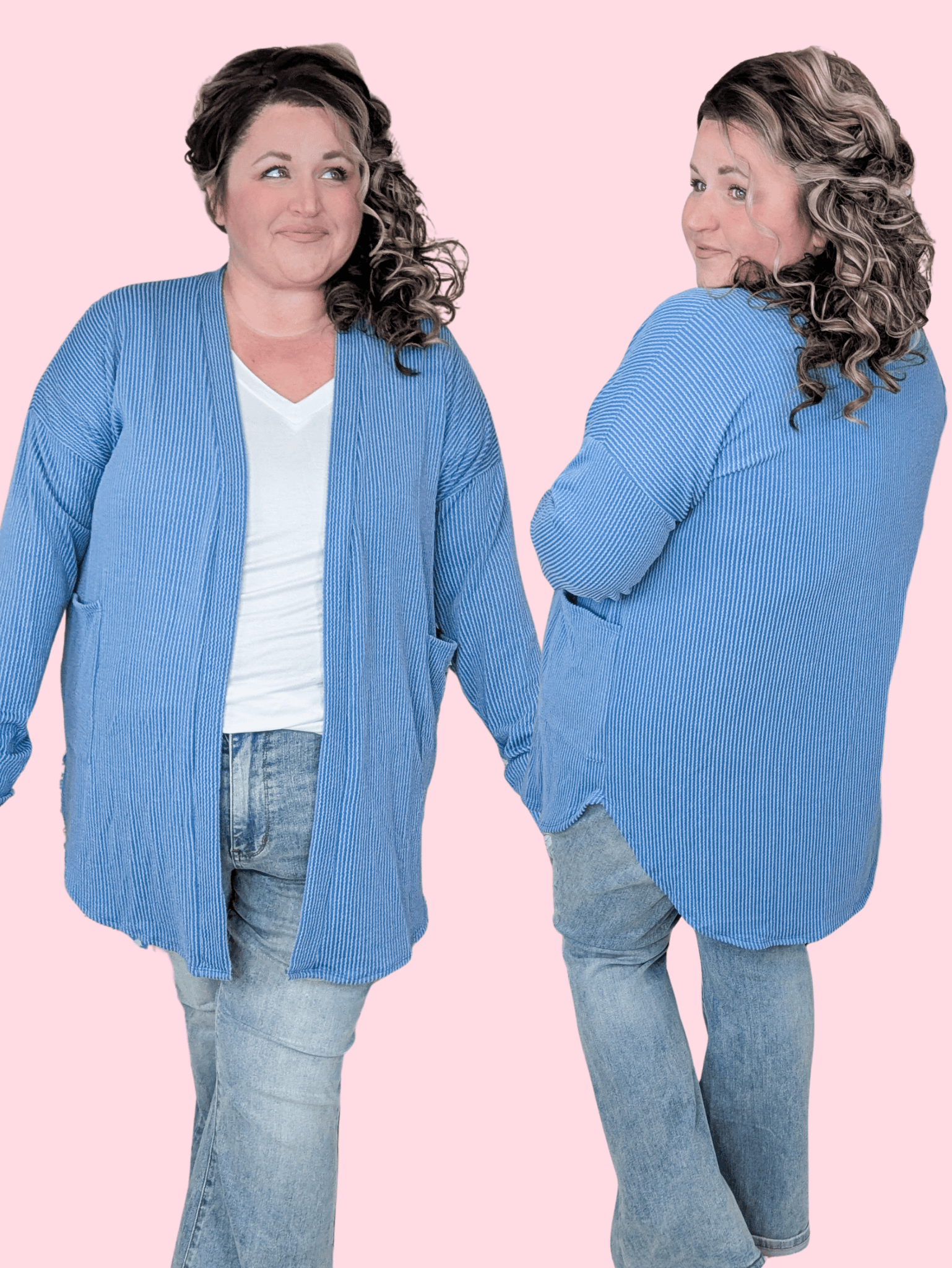 If you love the ease of a cardigan but want something that feels a little more modern and elevated, this one checks every box. The urban ribbed texture gives it that cool, styled look, while the soft denim blue keeps it easy and wearable for everyday. It’s the kind of layer you grab when a denim jacket feels too stiff and a blazer feels like too much.