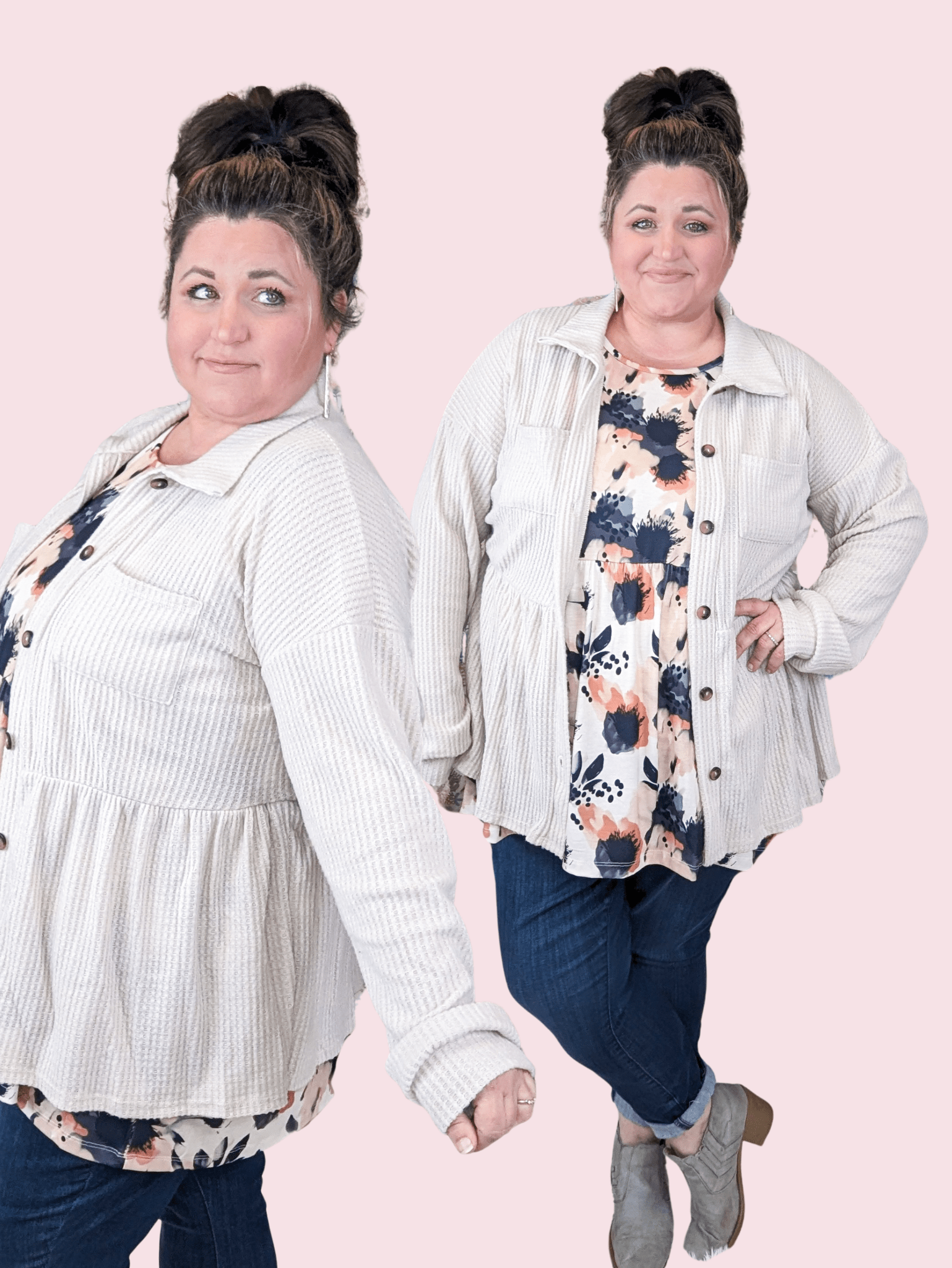 Ever wish your favorite babydoll top could double as a cute layer too? Here she is. The Toni gives you that effortless shape you love with the comfort of a brushed waffle shirket. Soft, stretchy, wearable open or buttoned… this is the piece you toss on when you want to look put-together without trying. It’s the “I have things to do and still want to look cute” solution.