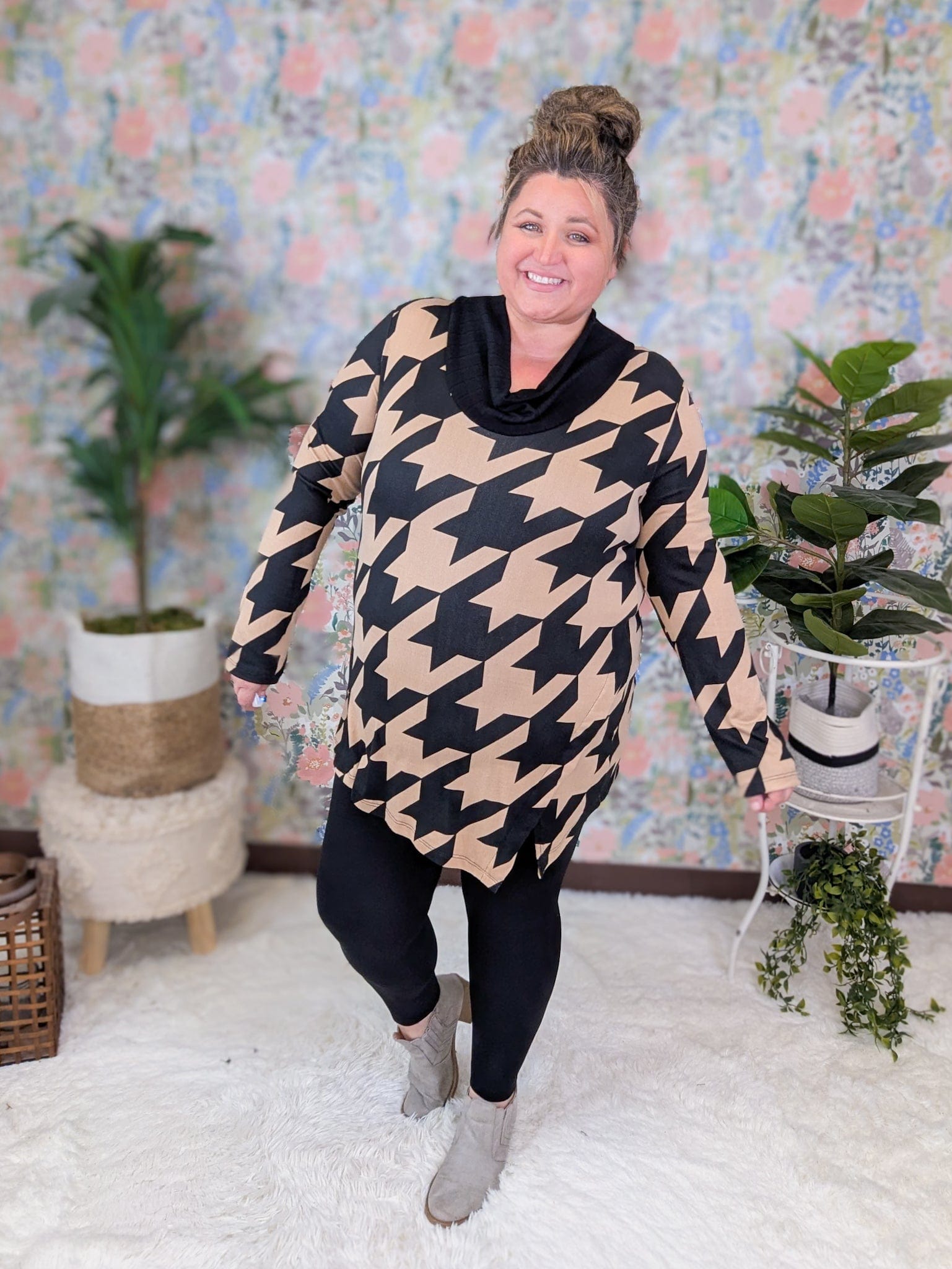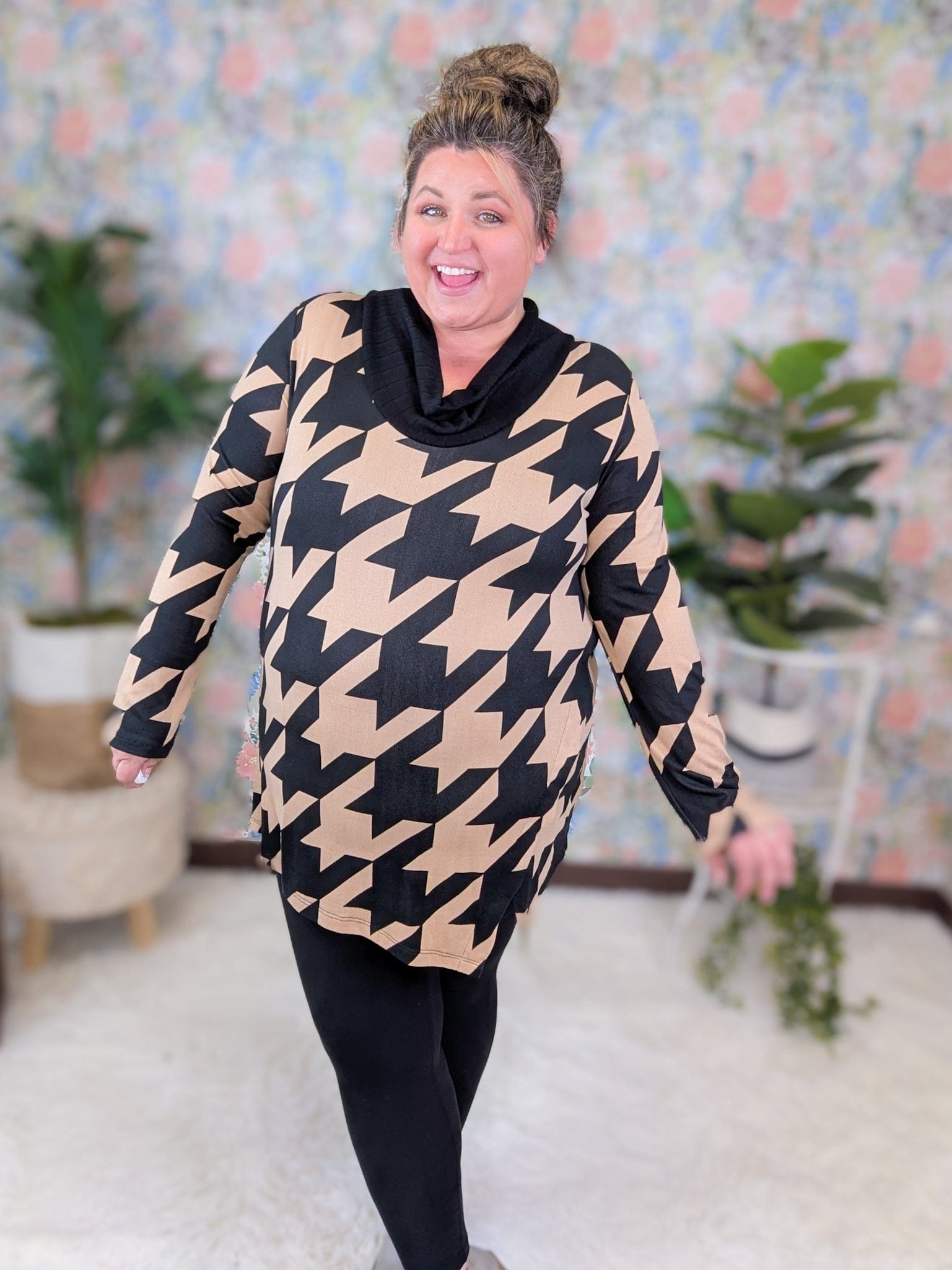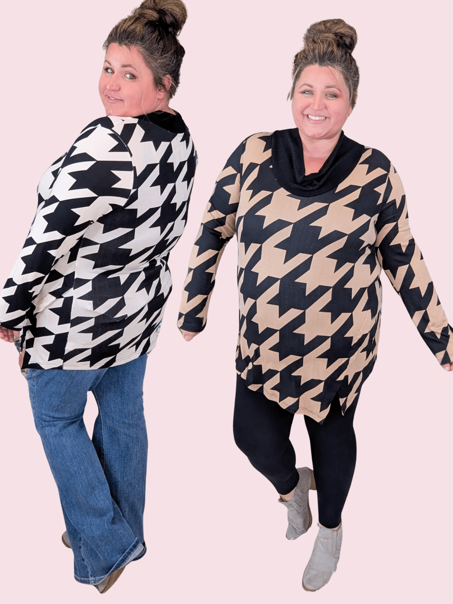 When you want a classic print with a modern twist, this houndstooth top is it. The luxe, lightweight fabric feels soft without being heavy, while the ribbed knit cowl neck adds comfort and polish. The asymmetrical crossover hem with its angular side slit gives you just enough edge to make this piece feel fresh, but still versatile enough to wear anywhere—work, weekends, or out to dinner.