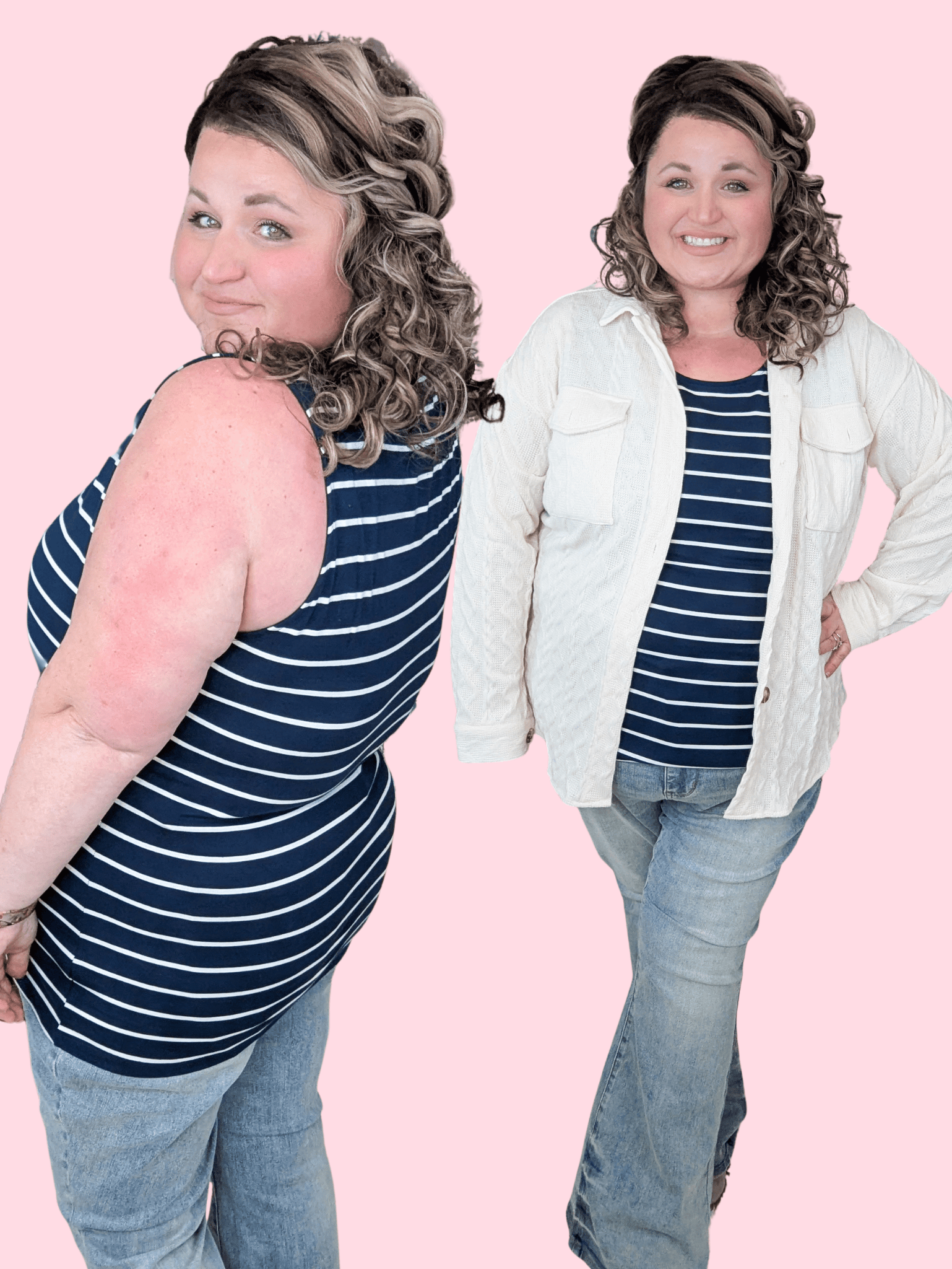 If there’s one color combo that never takes a season off, it’s navy and white. This striped scoop neck tank is a true year-round classic that works just as well on its own in warm weather as it does layered up the rest of the year. It’s clean, timeless, and one of those pieces that quietly goes with everything in your closet.