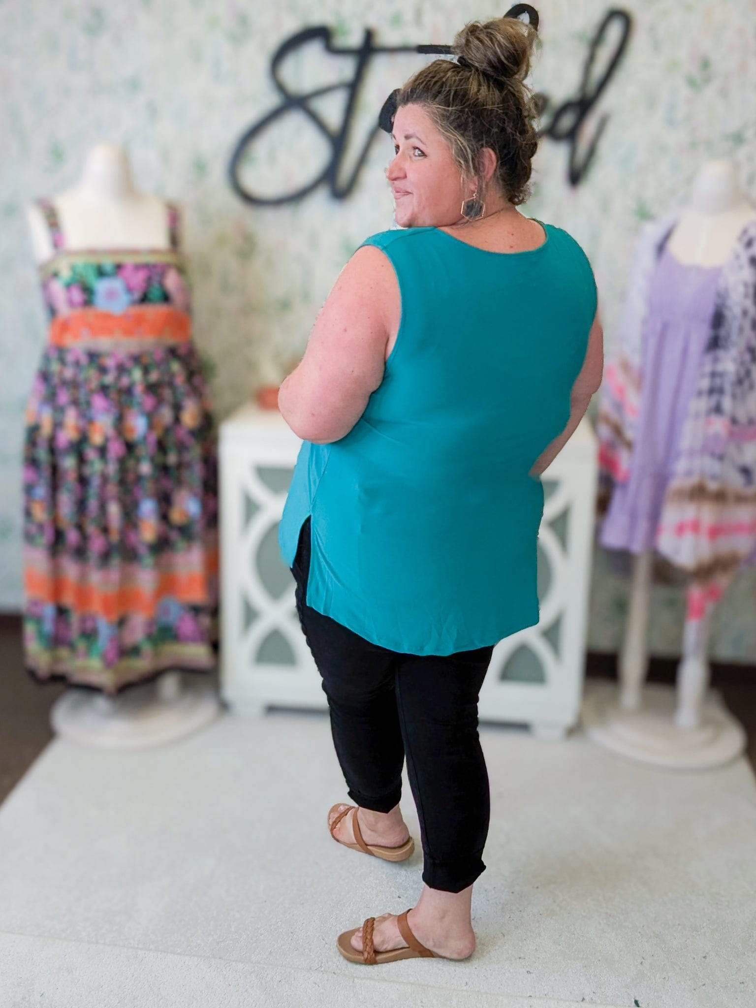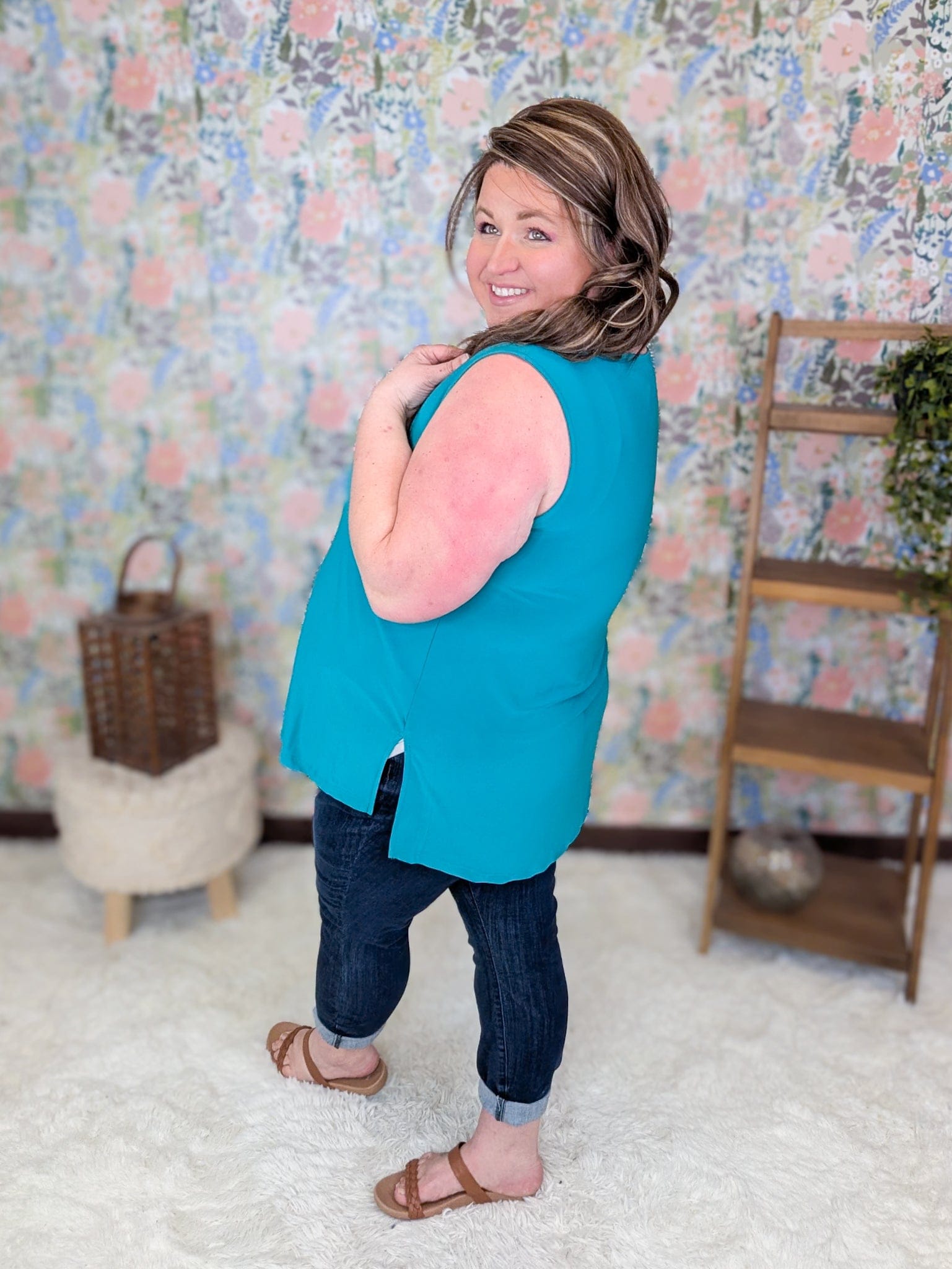 The Farryn brings that slinky, cool-to-the-touch feel with wide straps, full back coverage, and a soft slit neckline that gives a collared look—without the stiffness. Side slits and a slight high-low hem keep it moving with you, and that bold jewel teal? A total showstopper whether you’re dressing it up or keeping it casual.