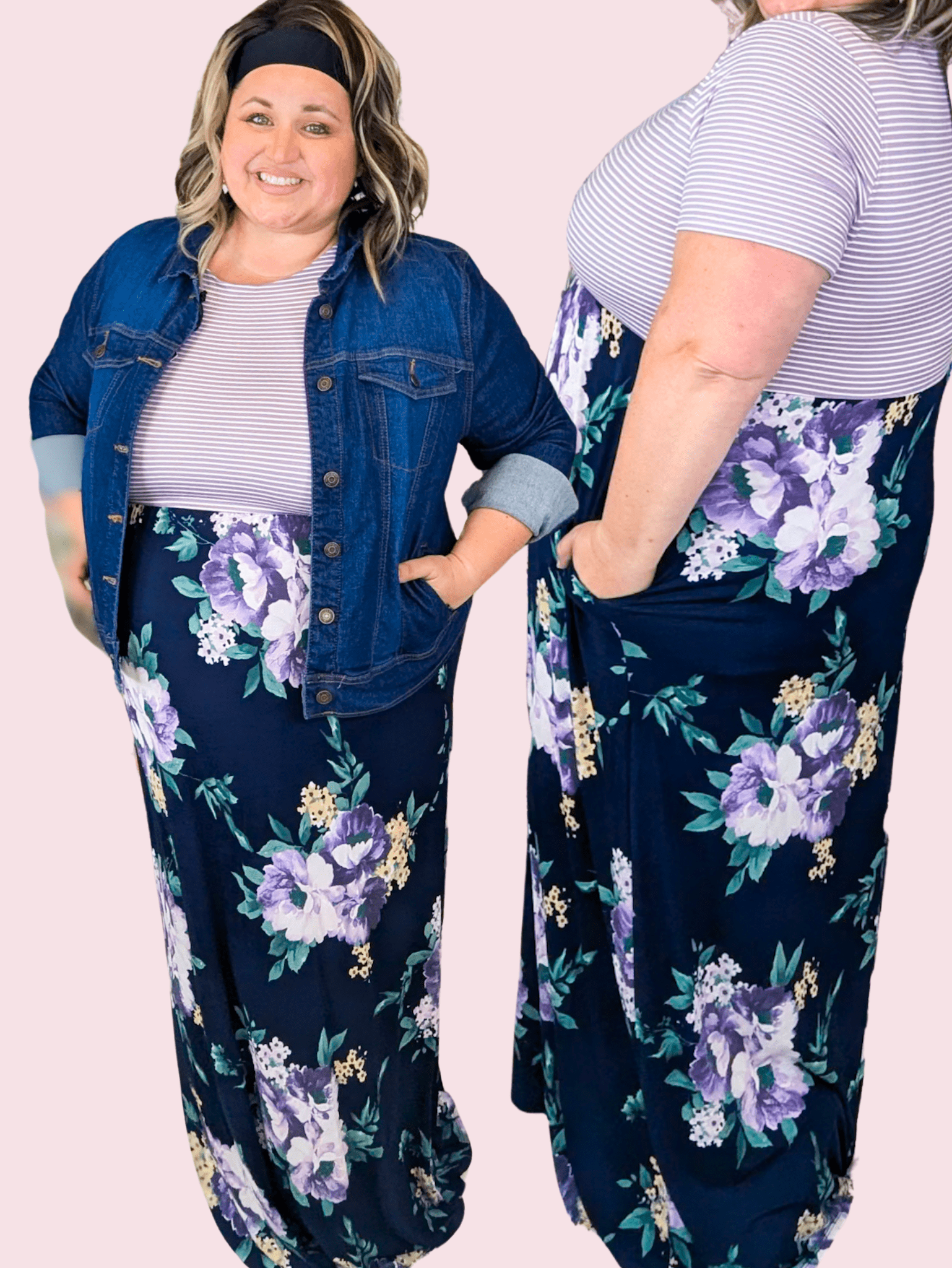 Looking for a maxi that feels effortless but still gives you shape? This one does it all. The soft striped top keeps it casual and flattering while the flowy floral skirt adds that beautiful movement we all love in a maxi. It’s the kind of dress you can throw on and instantly look put together, whether you're heading out for the day or dressing it up with a cute denim jacket.