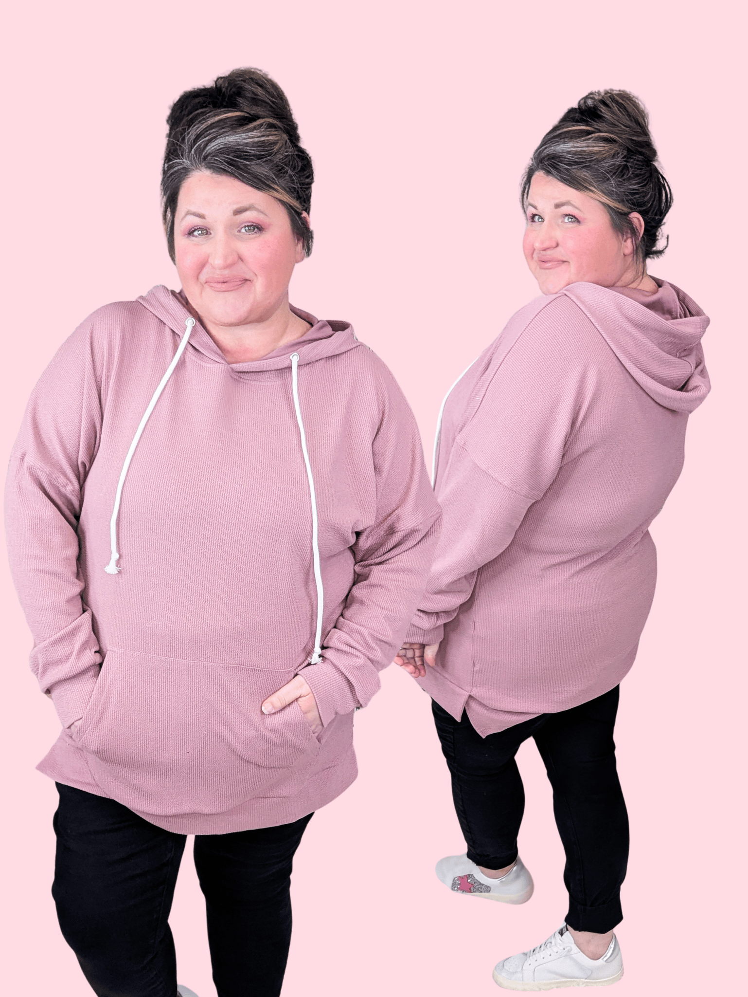 Want that effortlessly comfy feel and a flattering fit all in one piece? This ribbed hoodie is soft and slinky on the inside, stretchy all over, and lightweight enough for year-round wear. With a relaxed drop shoulder, high stretch, and a kangaroo pocket, it’s a throw-on-and-go style that feels anything but basic. The beautiful color works in every season, and the side slits give you the movement you want — whether you’re lounging, layering, or living your best comfy life.