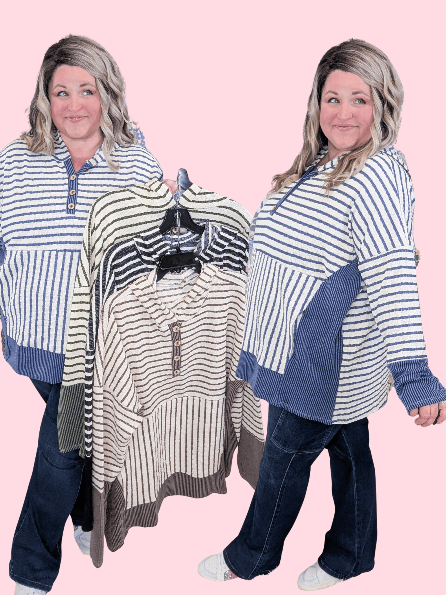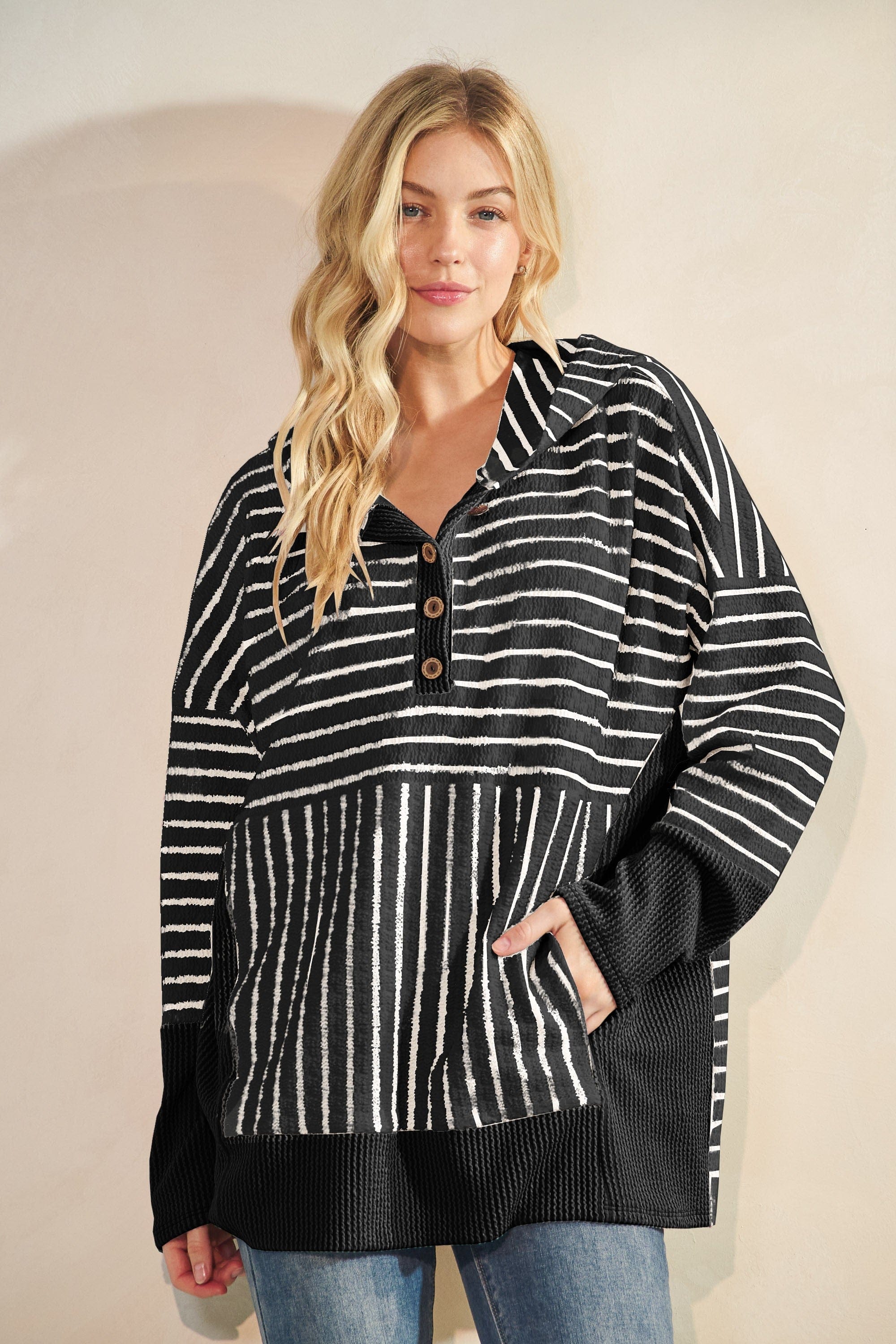 Ever notice how some casual tops just feel basic… and others make you look twice? This one is that second kind. The mixed stripe directions, ribbed texture, and those little urban ribbed accents make it feel way more special than your average mom hoodie. It’s comfy, yes. But it’s also the “wait, where did you get that?” kind of cute.