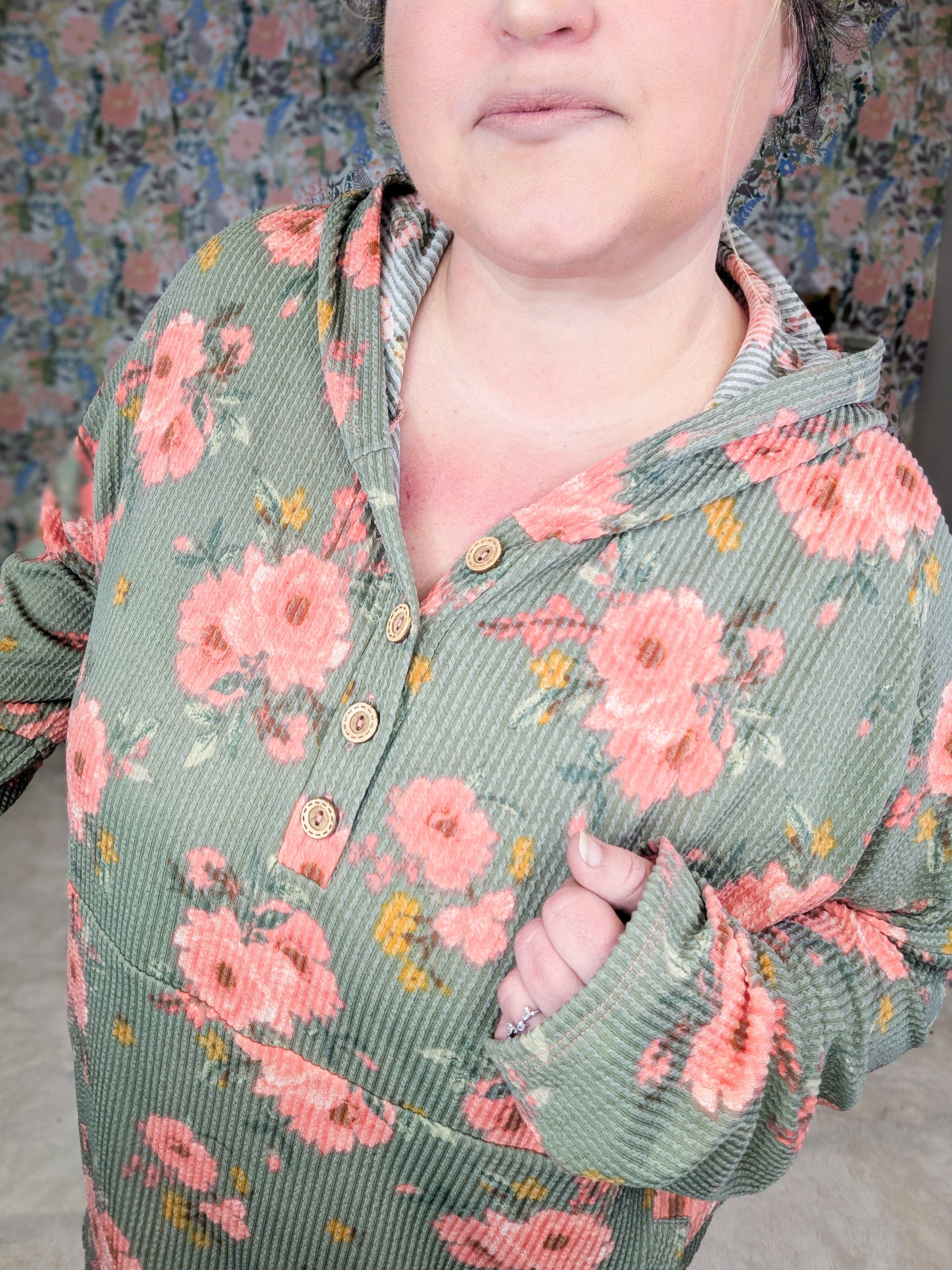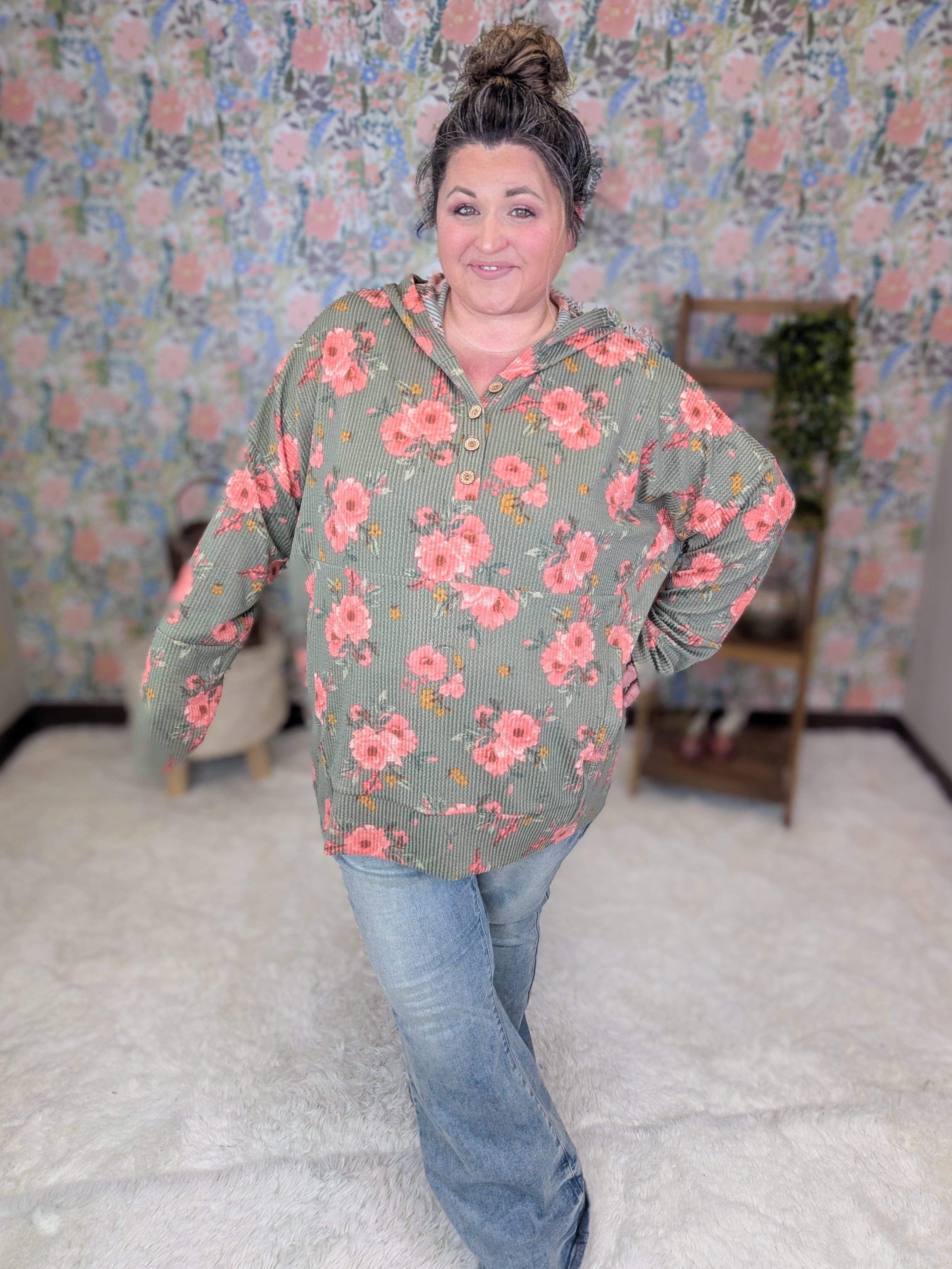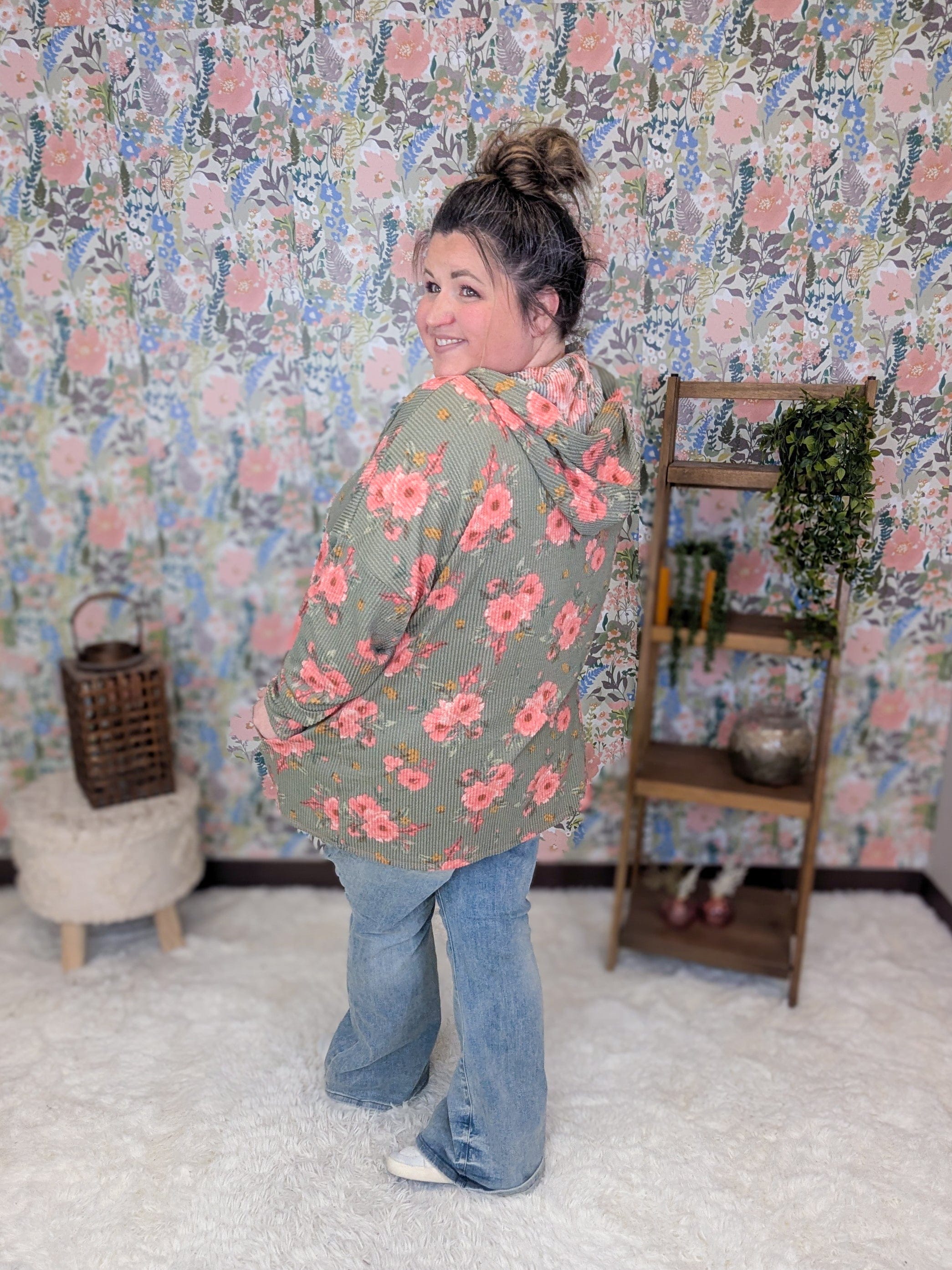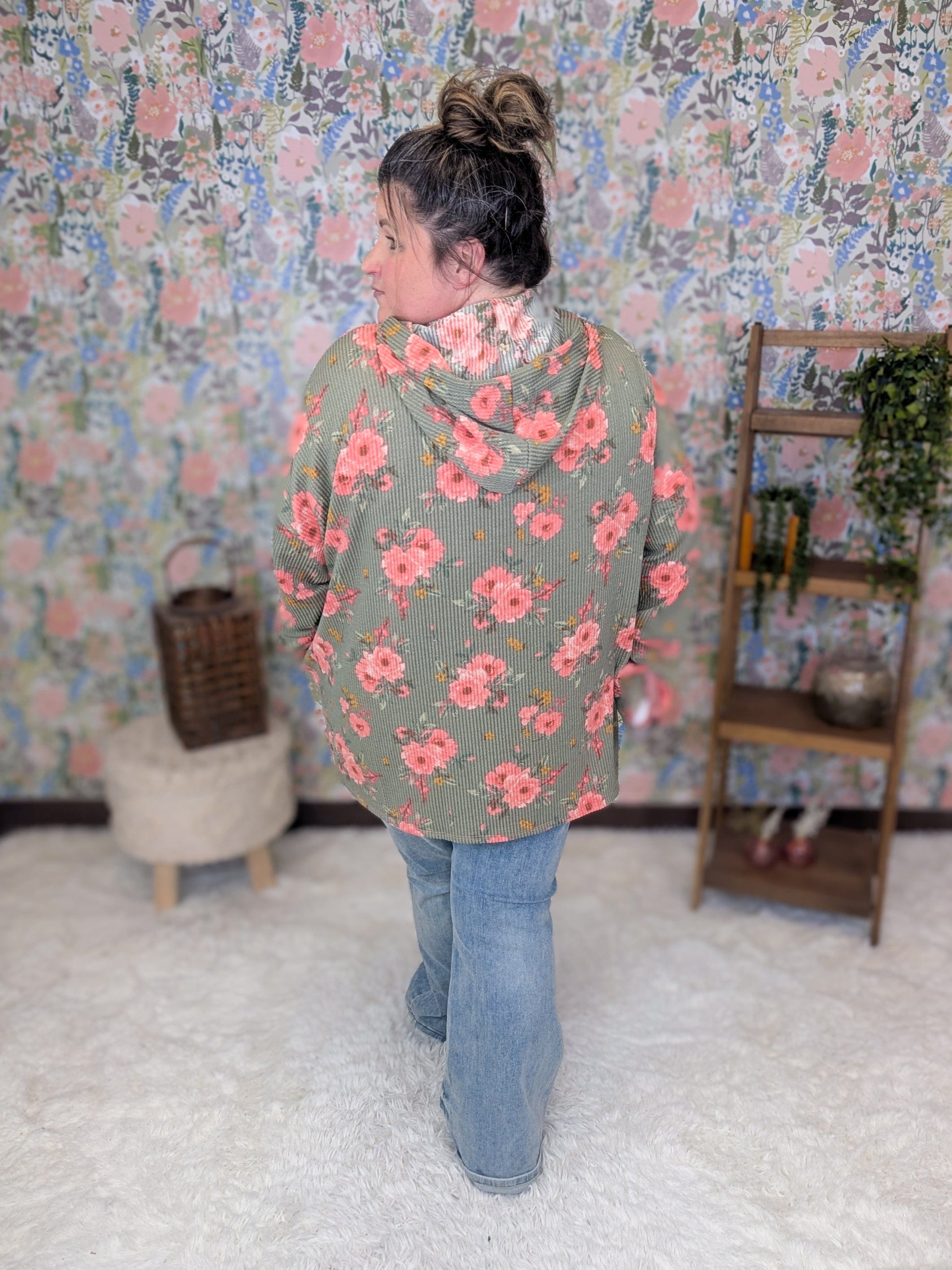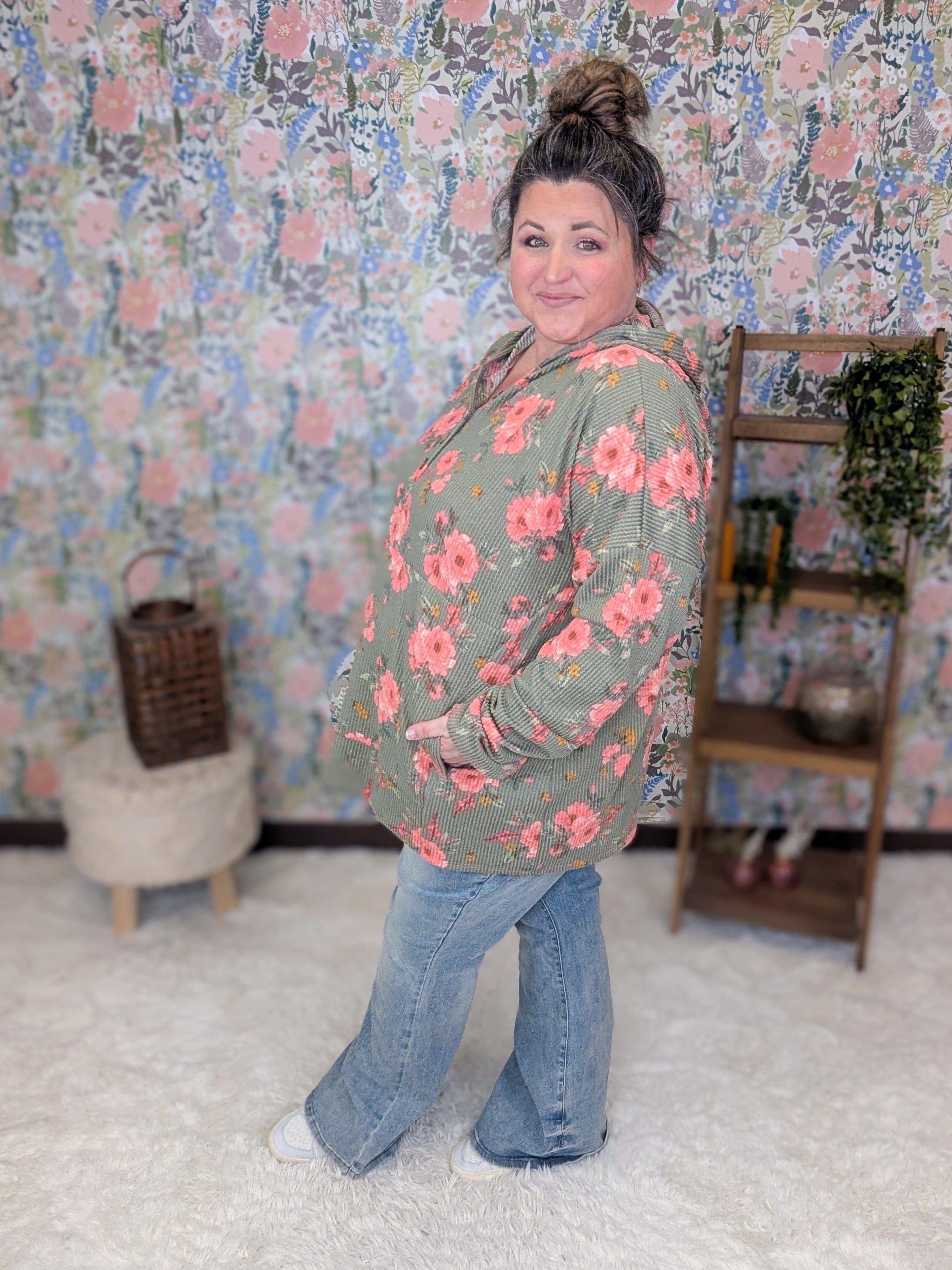 Want something comfy like your favorite sweatshirt but a little cuter and way more spring ready? This oversized floral pullover gives you that easy throw-on comfort without feeling heavy or bulky. The textured urban ribbed fabric adds just enough interest while staying soft and smooth inside, and the olive base with pink and coral florals keeps things feminine without going pastel. Hooded, stretchy, and perfectly lightweight, this is one of those grab-it-every-time pieces whether you’re heading out the door or settling in for the day.