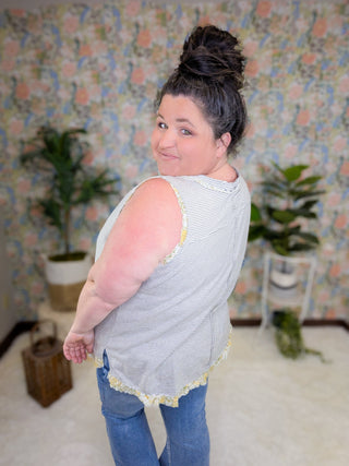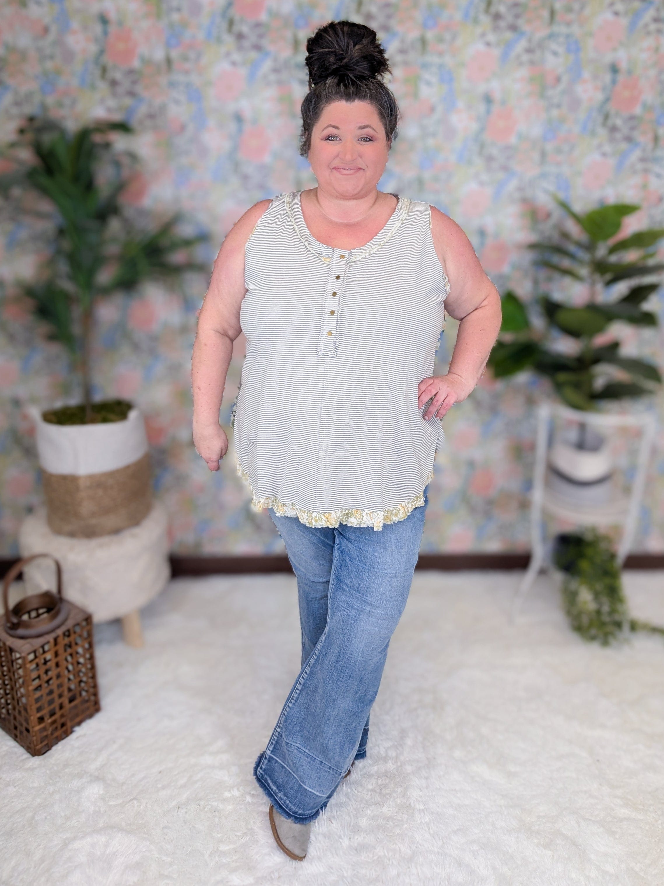 - Gray features a white stripe and green/yellow floral accent