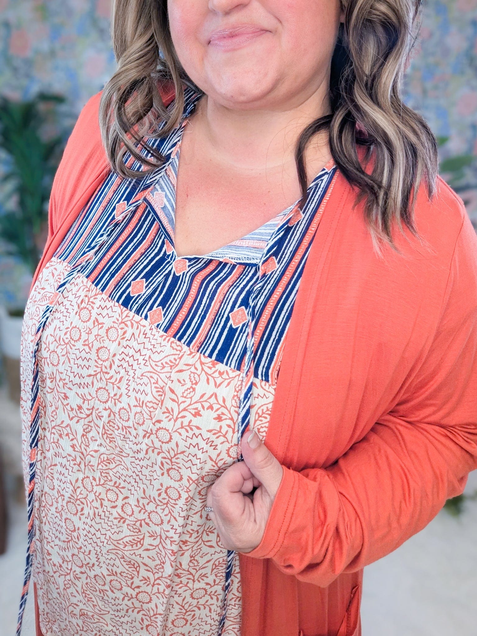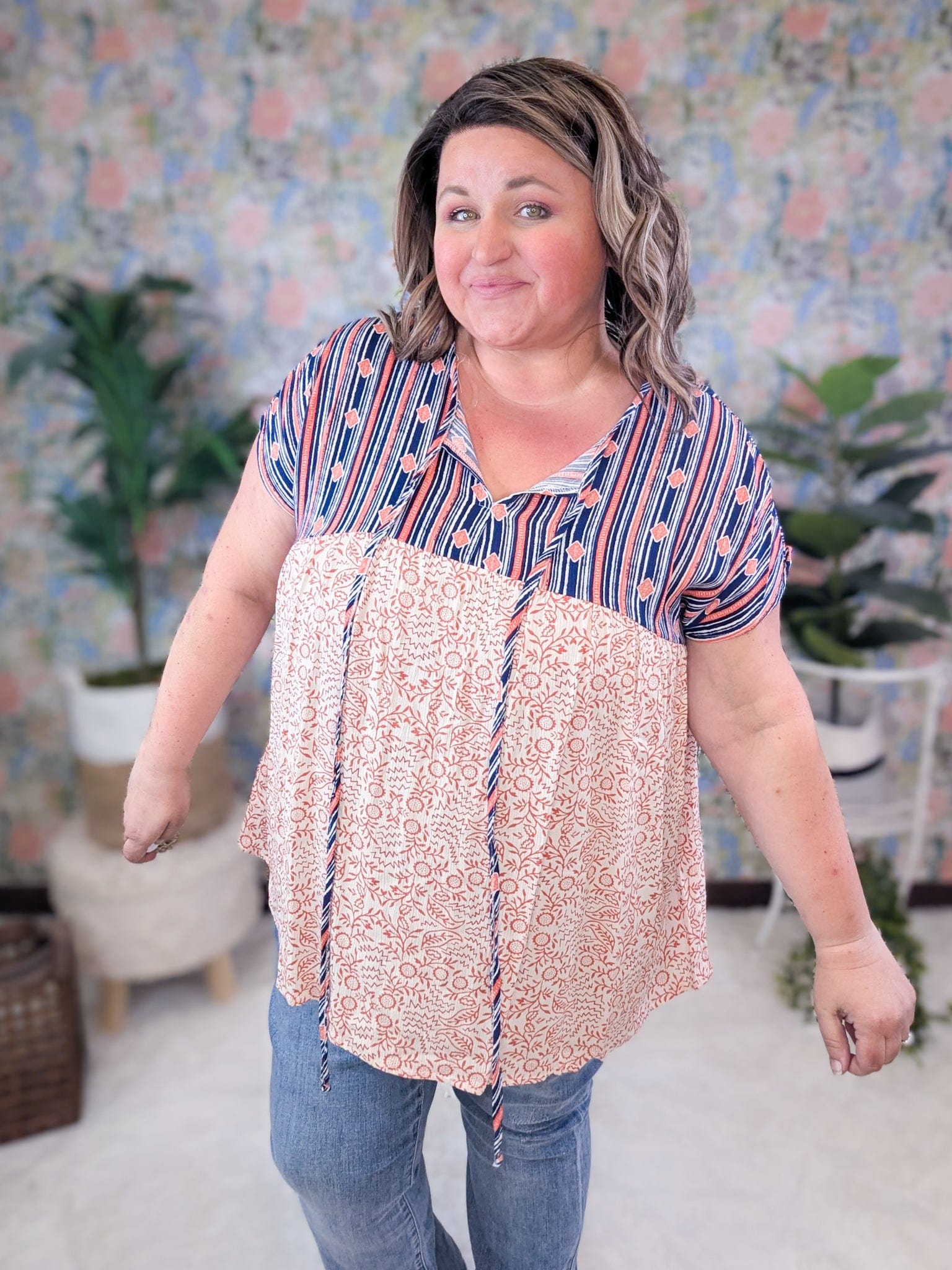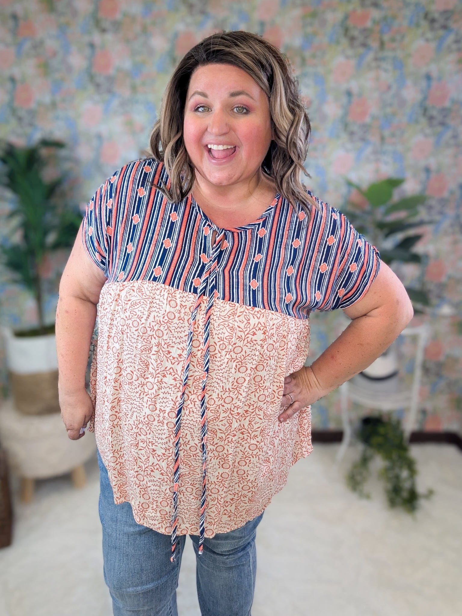 The Meri blouse is the perfect way to dip your toe into boho style without going full-on. The trending navy and orange palette makes it fresh and modern, while the flowy bodice and mixed prints keep it fun and easy to wear. Lightweight and airy, it skims over your shape without clinging — a total win for comfort and style in one.