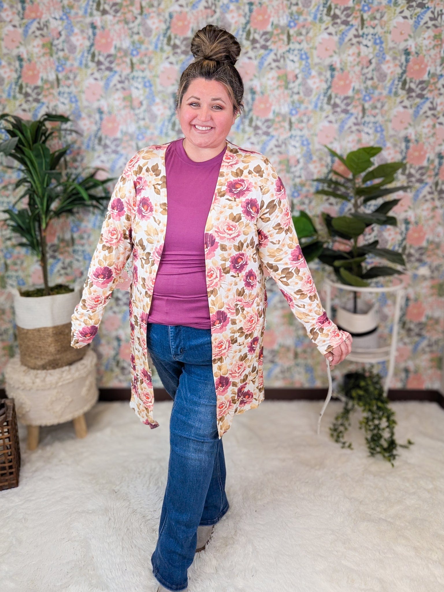 • Michele is wearing the Mulberry paired with our Tinley cardigan in Autumn Blossom
