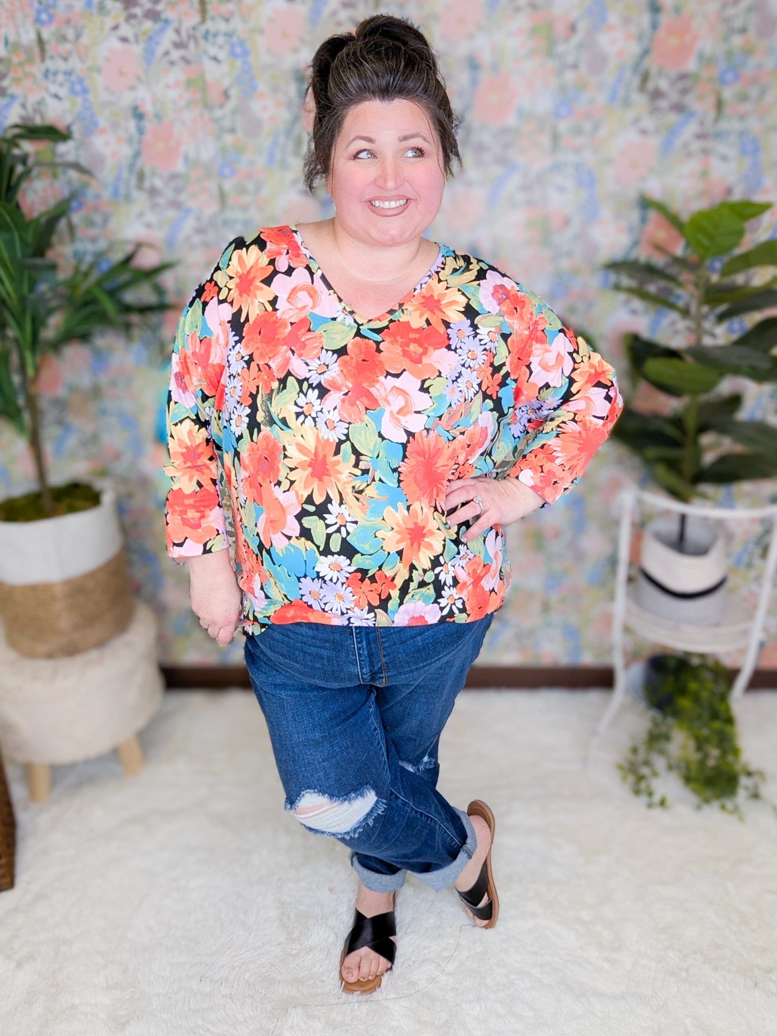 Looking for a top that combines comfort, style, and a pop of personality? This slouchy V-neck dolman sleeve top in bold florals is your new go-to. The relaxed fit and 3/4 sleeves keep you comfortable all day, while the vibrant floral print adds a touch of fun to your wardrobe. Whether you're running errands, meeting friends, or just enjoying some downtime, this top has you covered. Pair it with your favorite jeans or leggings, and you're ready to take on the day with confidence.