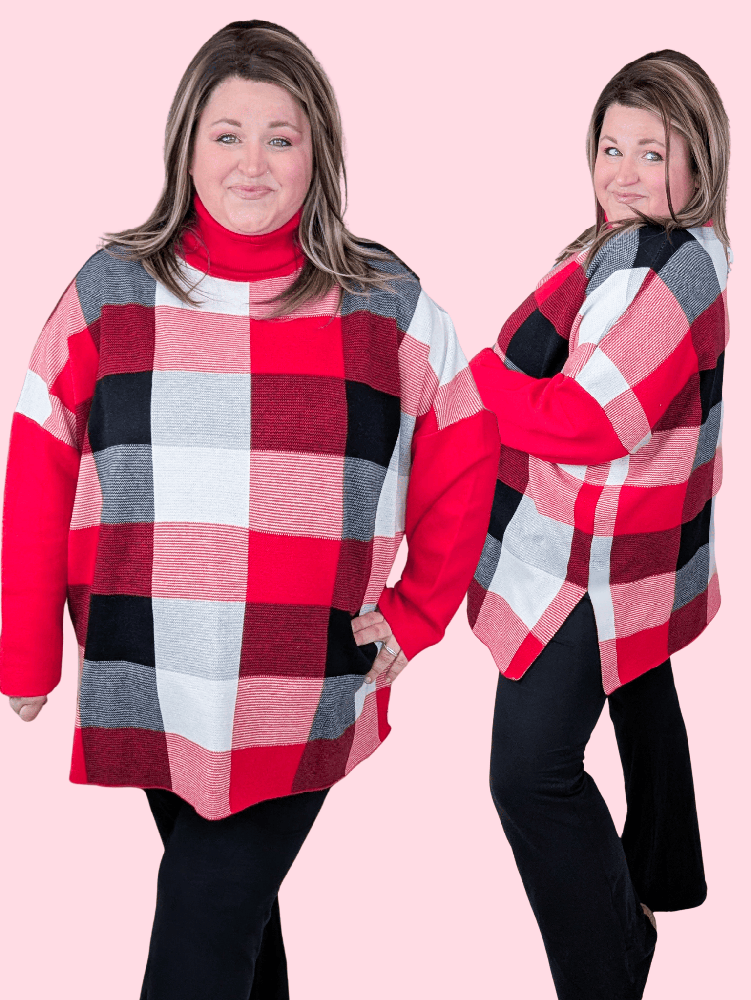 If you love a bold holiday plaid but don’t want anything clingy or stiff, this sweater is it. The luxe knit feels soft and stretchy with that perfect relaxed drape, and the funnel neck adds just the right amount of cozy without being bulky. The red, white, and black block plaid gives a timeless winter vibe — dress it up with black pants or keep it casual with leggings and boots.