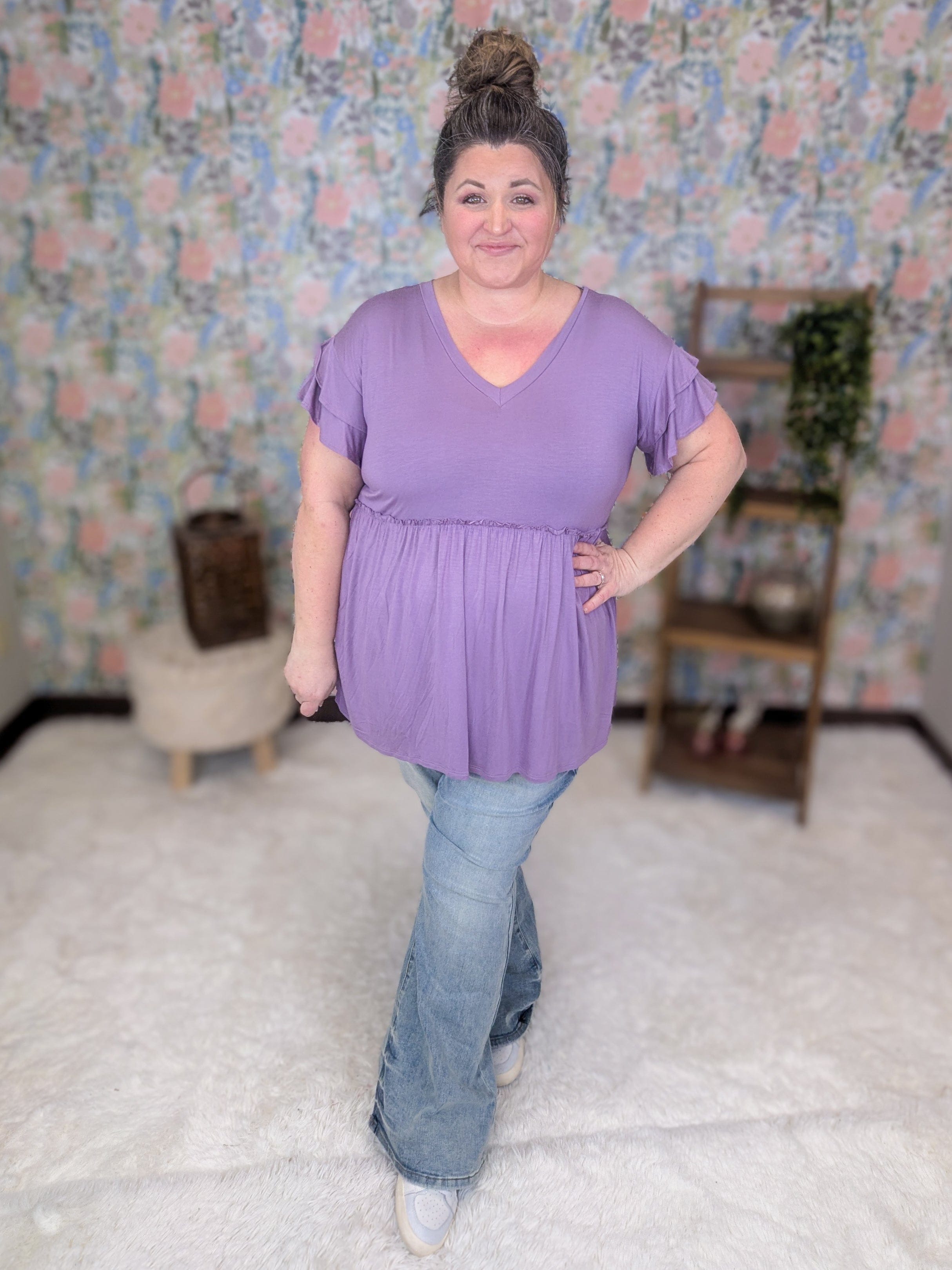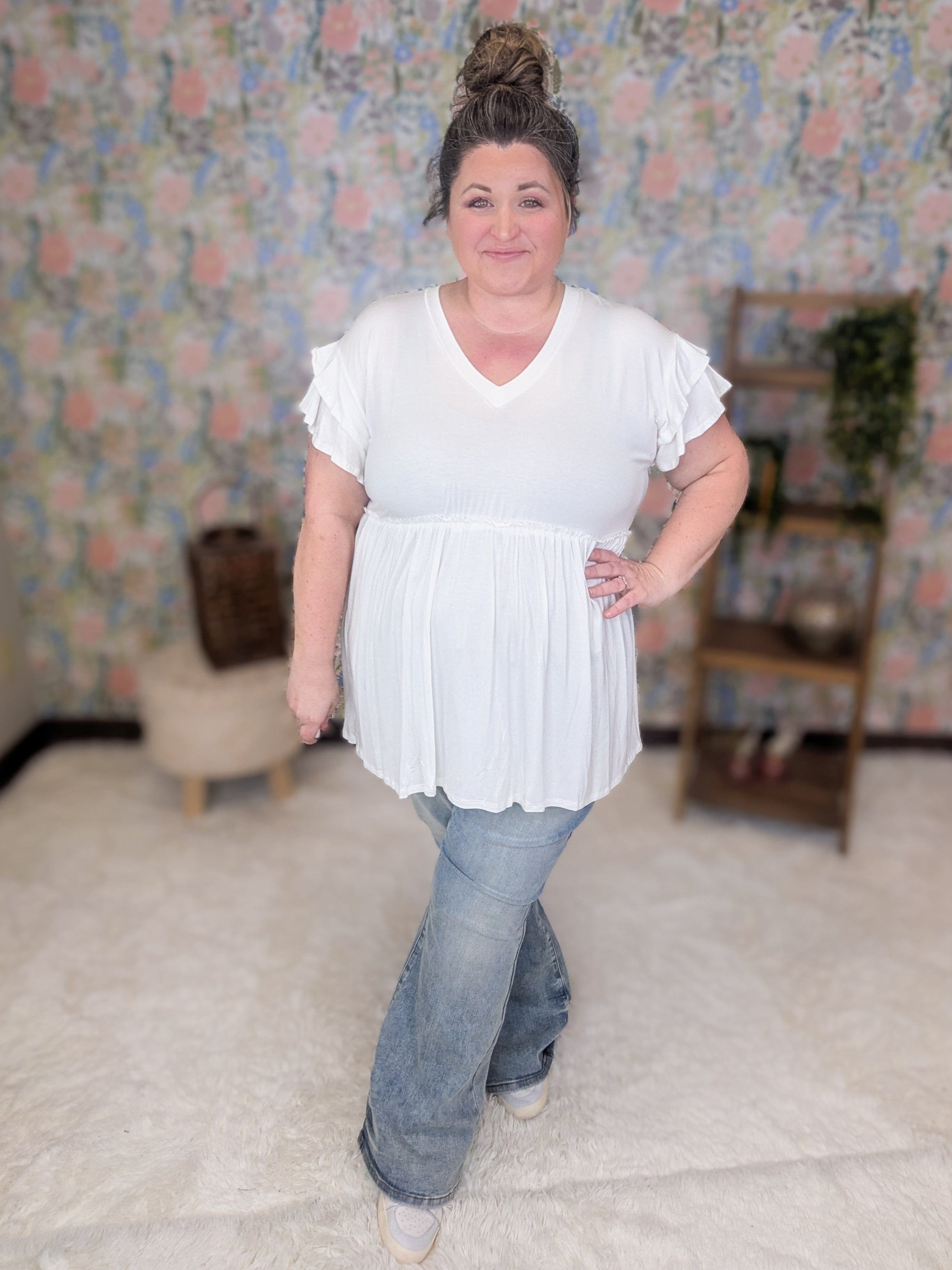 Want something soft and easy that still gives you shape? This little babydoll is one of those sneaky favorites that instantly looks flattering without any effort. The fitted bust and elastic waistline create a natural waist shape, while the flowy midsection keeps things comfortable and easy through the belly and hips. The double flutter sleeves add the cutest feminine touch without feeling fussy, and the luxe tee fabric makes it just as comfy as your favorite everyday top. Honestly, these are the kind you grab in more than one color because they just work.