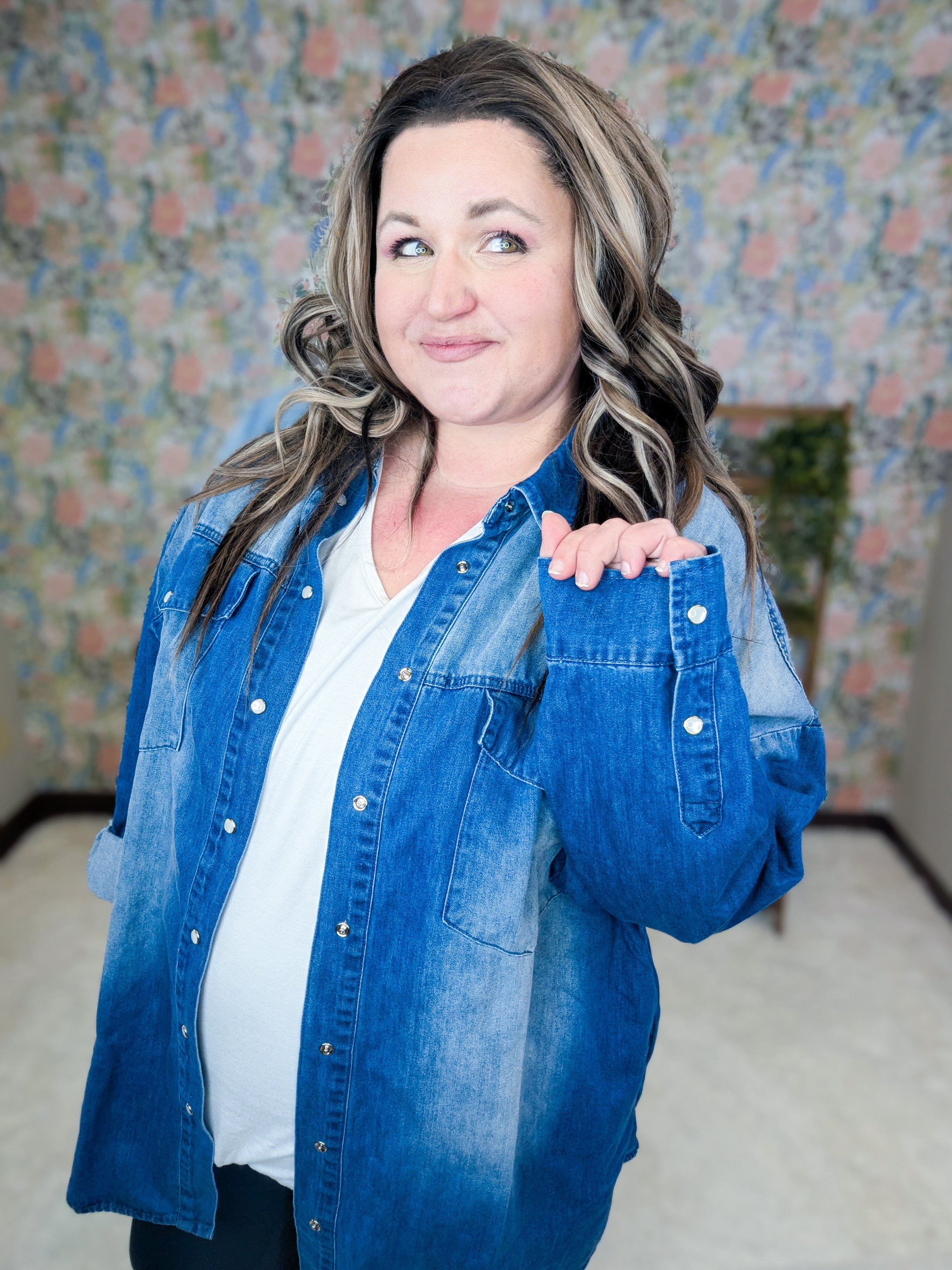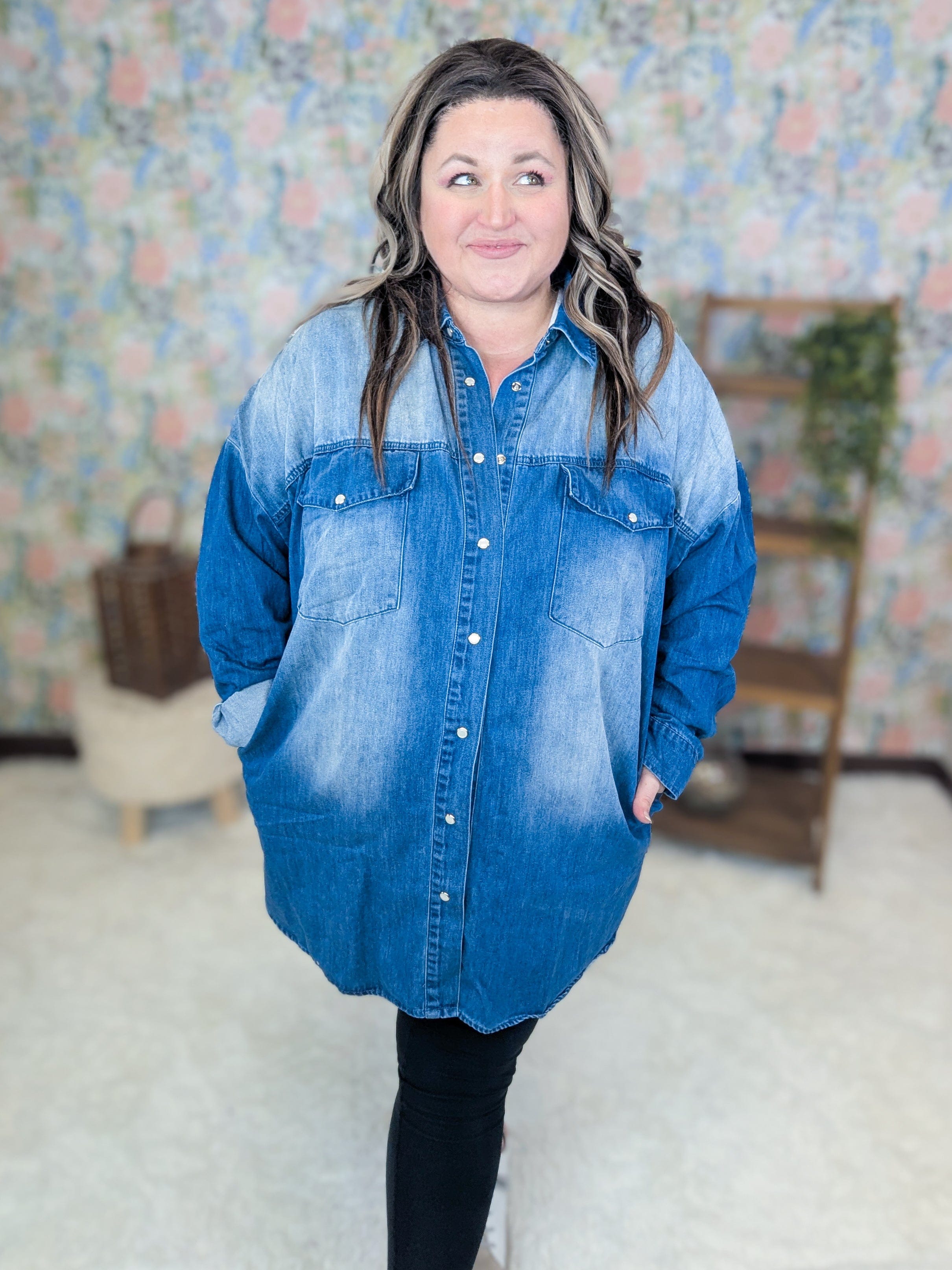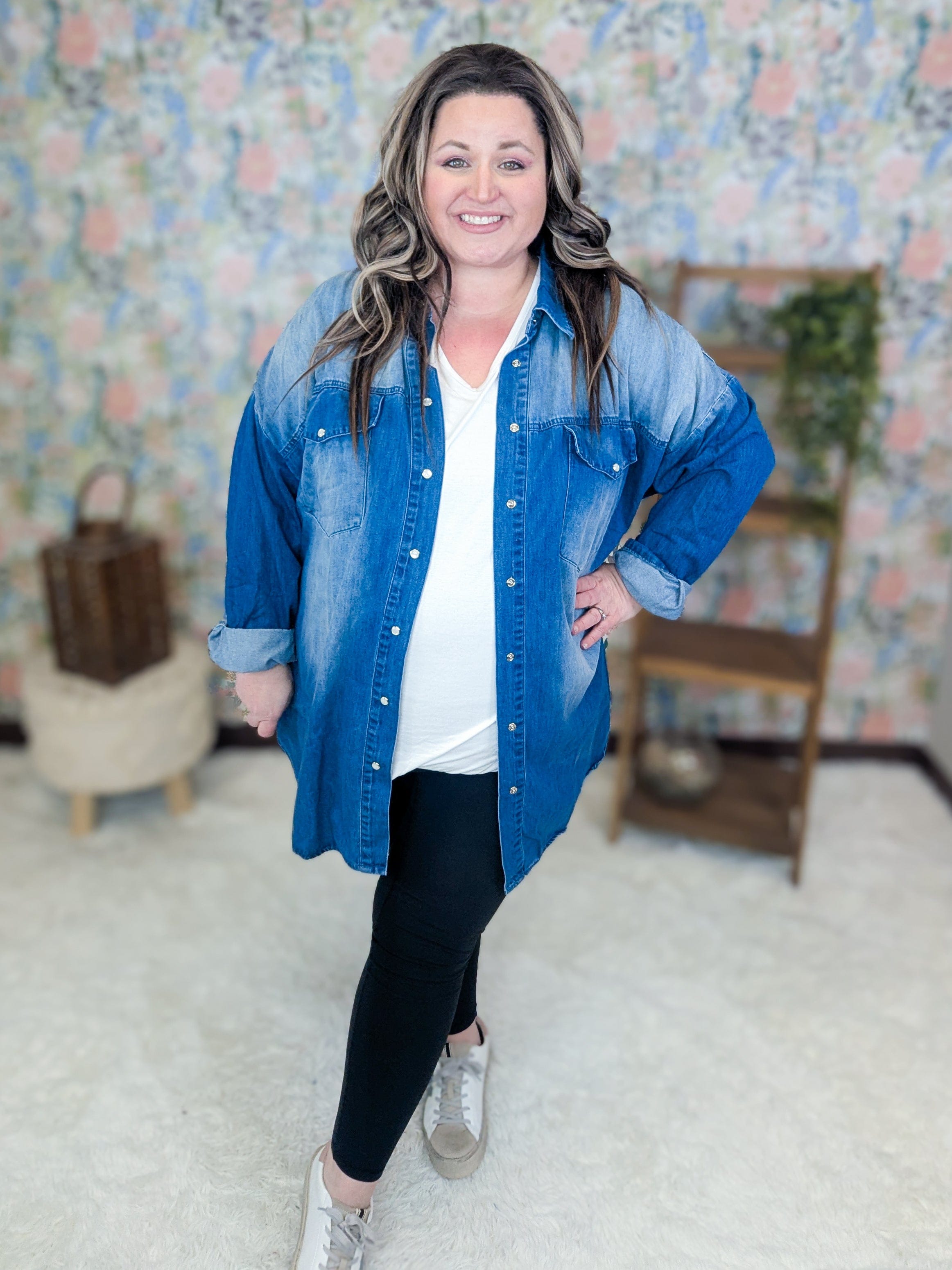 Looking for that perfect denim shirt you can actually move in? Same. We feel like we’ve been searching our whole lives for a denim button down that actually works with curves and this one finally nailed it. It has that soft worn-in denim feel, plenty of room where you need it, and the longer tunic length makes it an easy throw-on layer with leggings, tanks, or tees.