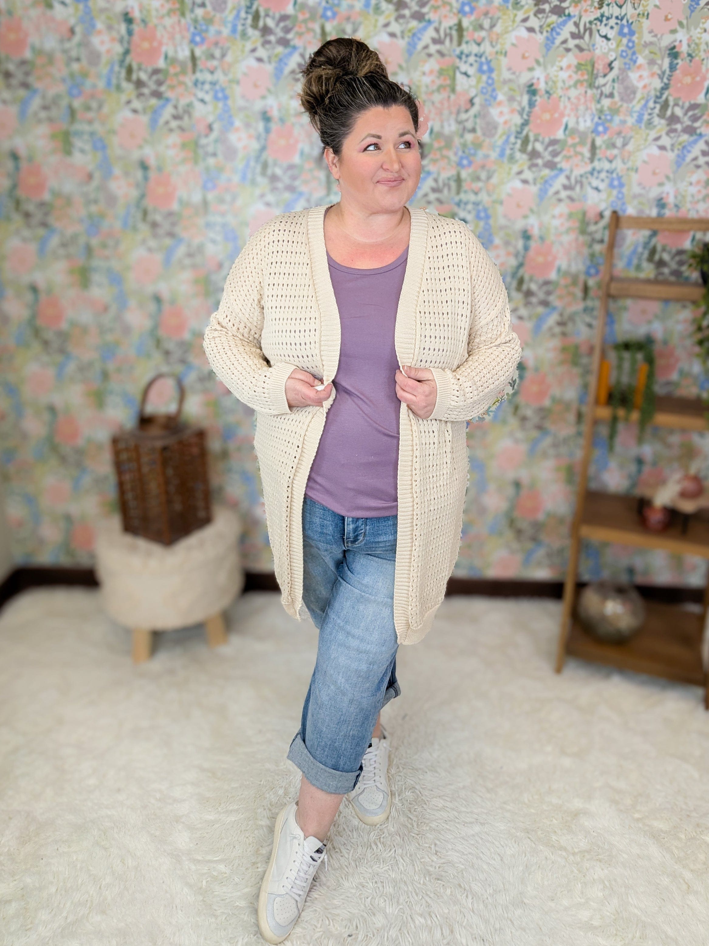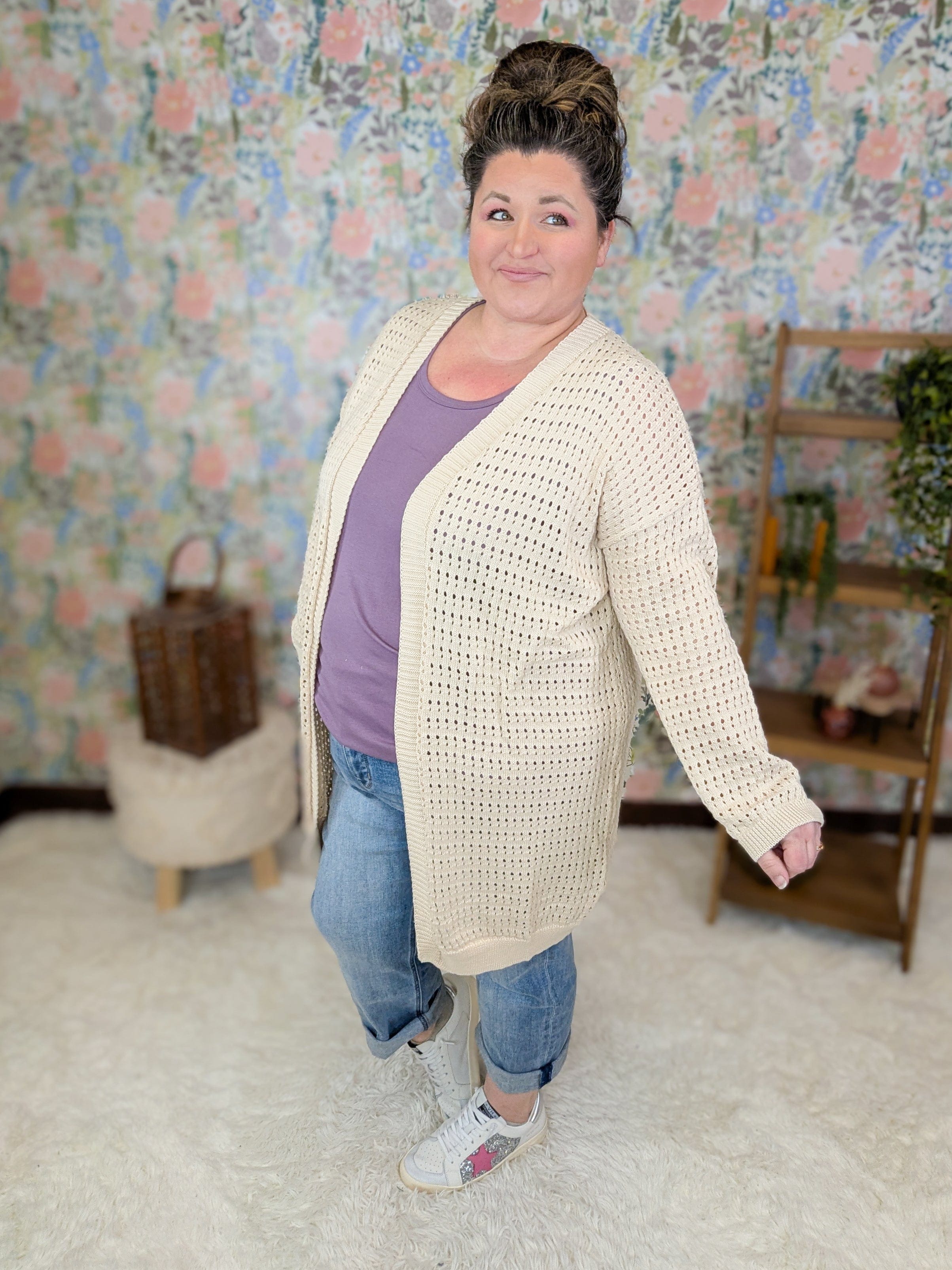 Lightweight layering season is officially here… and this is exactly the kind of cardigan we reach for when we want coverage without heat. The Nixie gives you that easy sweater look without feeling bulky or wintery. The airy open knit keeps things breathable while still giving arm coverage and a little texture over tanks, tees, and dresses. That creamy taupe neutral truly goes with everything. Toss it on with denim, leggings, work outfits, or even over sleeveless dresses when mornings start chilly but afternoons warm up fast.