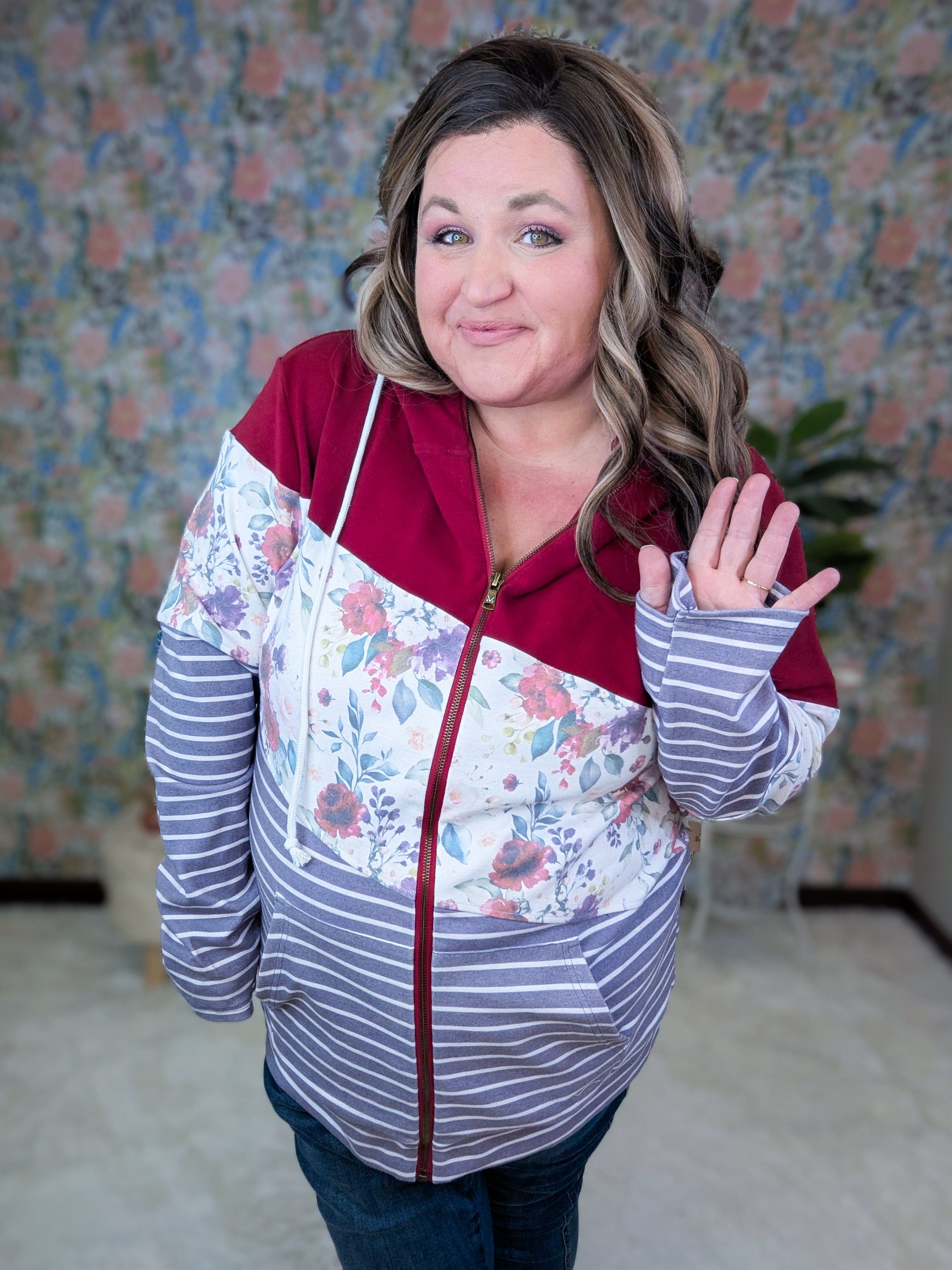This is how you dip your toe into floral without going full garden party. That ivory floral is hands down one of the prettiest we’ve ever had and it pops so perfectly against the rich burgundy and plum stripes. It’s a little girly, a little fun, and still very much an everyday hoodie you’ll actually wear. Basically, it’s giving cute upgrade to your usual zip-up without sacrificing comfort.