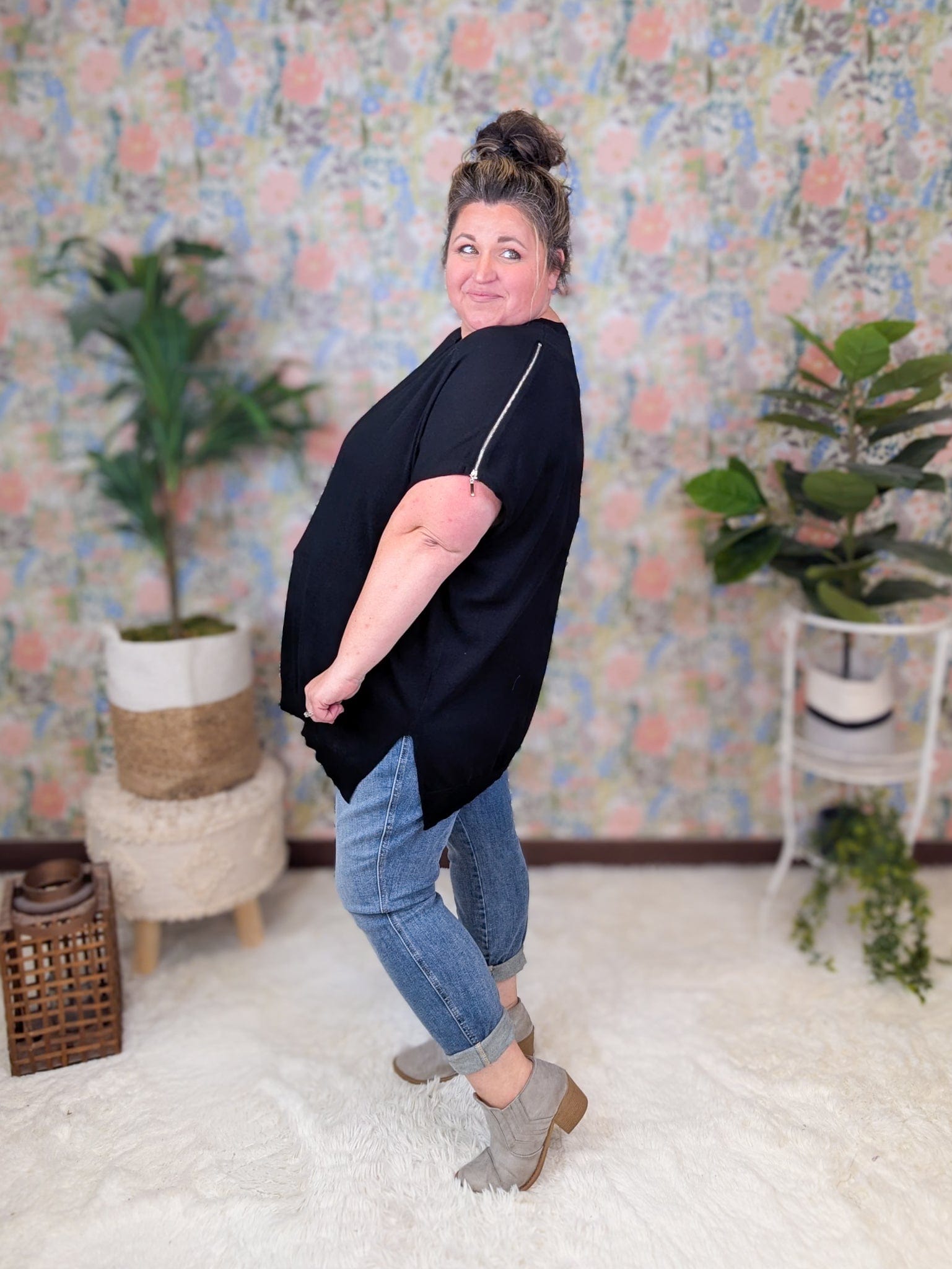 You know those little details that totally make an outfit? The zipper accents on this top are it. They give just the right touch of edge while keeping the look classy and easy to wear. The lightweight sweater knit feels soft and breathable — no overheating, no cling — just that perfect mix of comfy and polished. Whether you’re pairing it with trousers for work or jeans and booties for weekend plans, this one’s got the perfect balance of style and ease.
