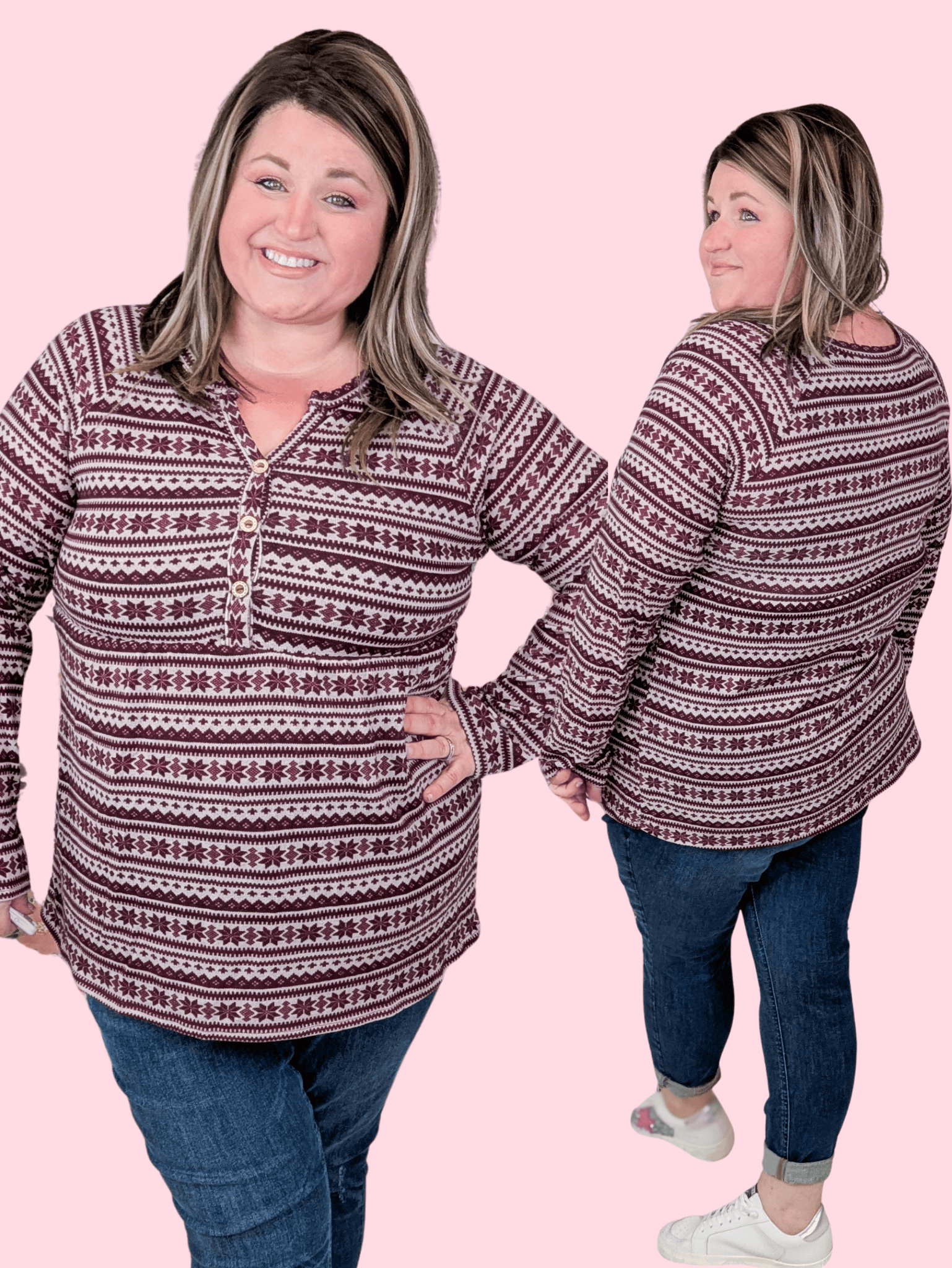 Looking for something festive but still totally wearable after the holidays? This one nails it. The dark burgundy snowflakes on a soft taupe base give all the winter vibes without being over the top. The babydoll waist adds that flattering, easy shape we all love, and the soft, stretchy fabric keeps it comfy all day long — whether you’re headed to work, a family get-together, or just doing your thing.