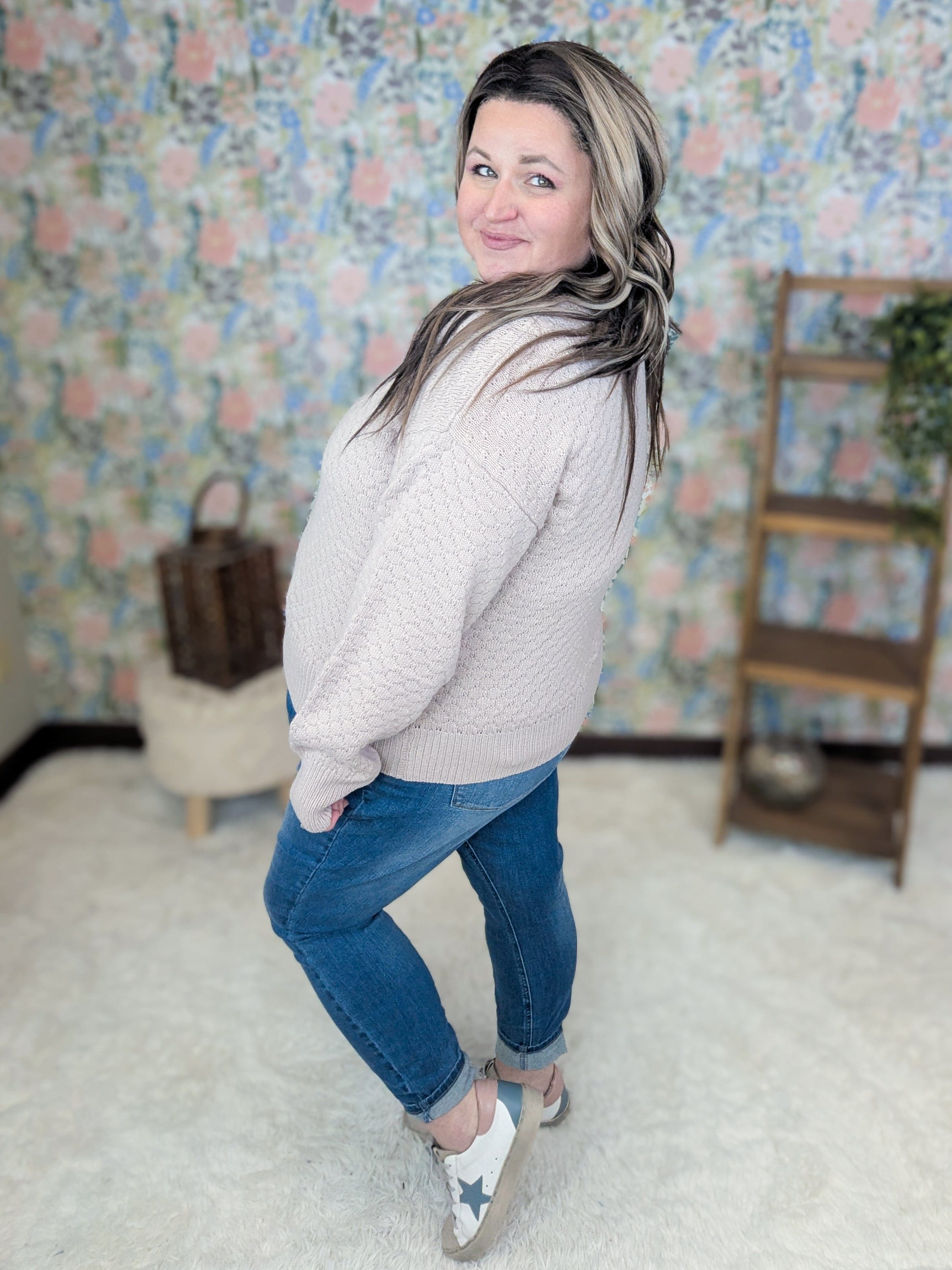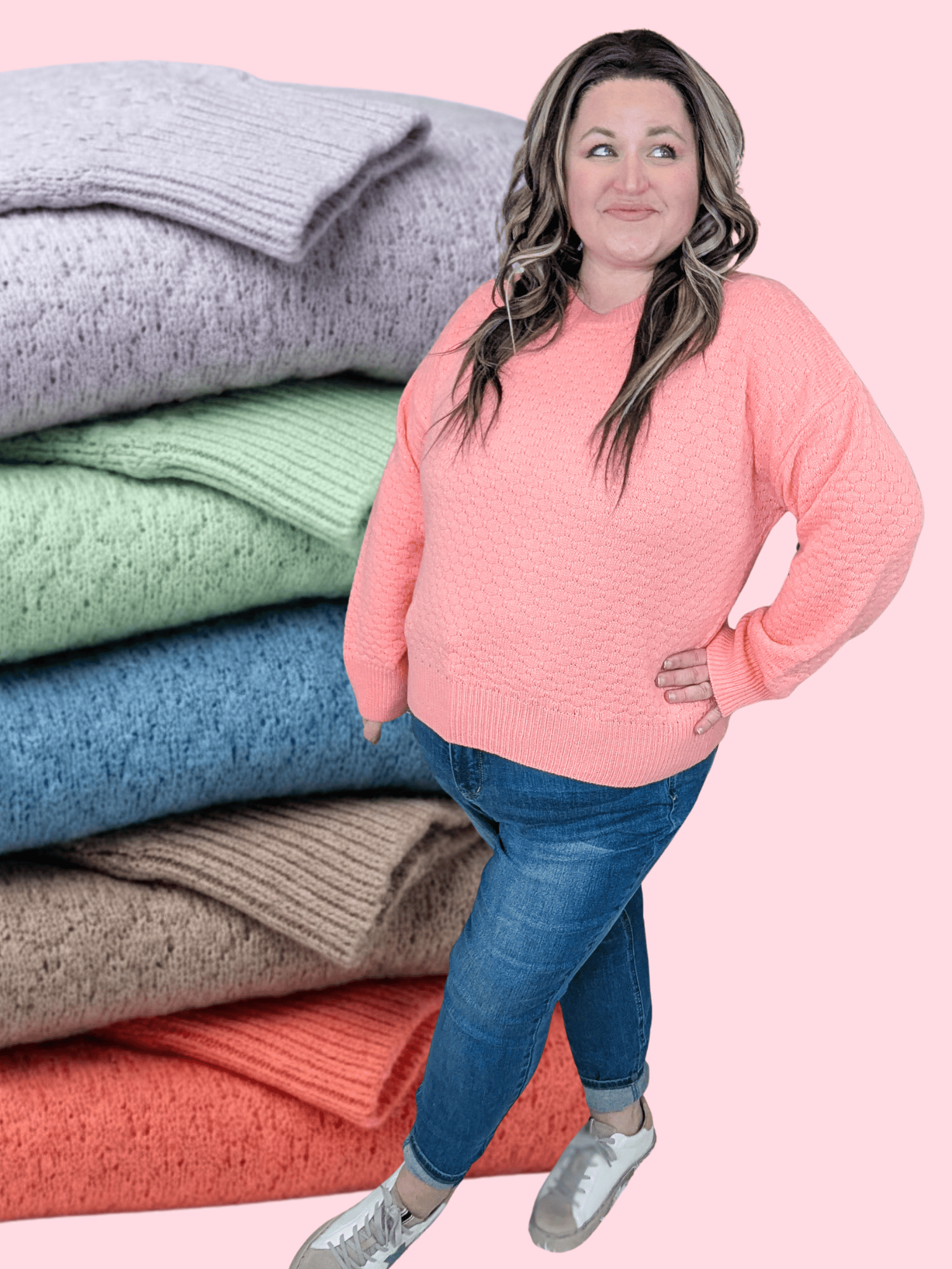 What if your favorite cozy sweater suddenly decided to be spring-ready? That’s exactly the vibe here. This one has the prettiest textured knit that adds just enough detail while still keeping things simple and easy to wear. It’s soft, stretchy, and comfy without feeling heavy, so you get that cozy sweater feel without overheating once the weather starts warming up.