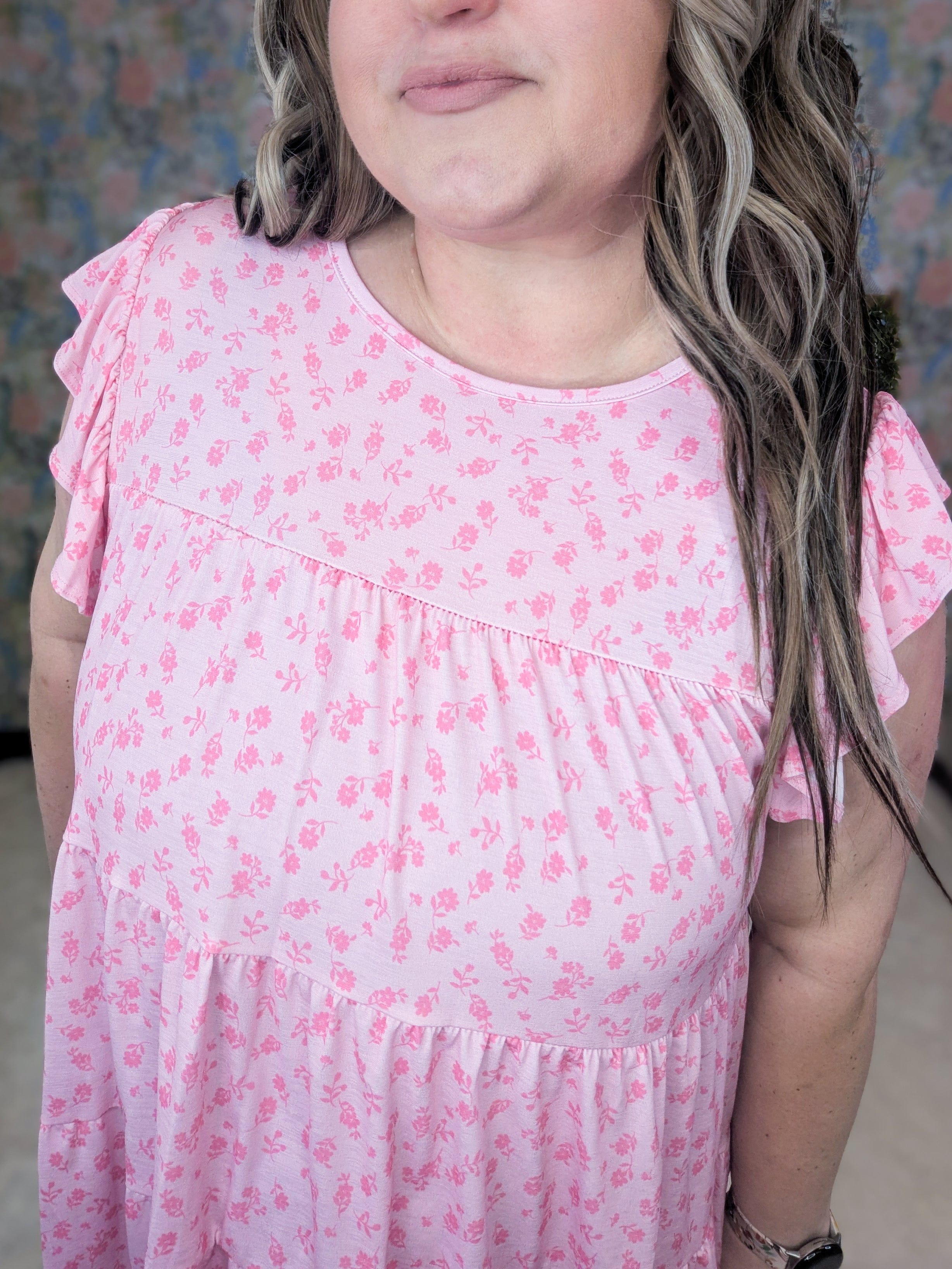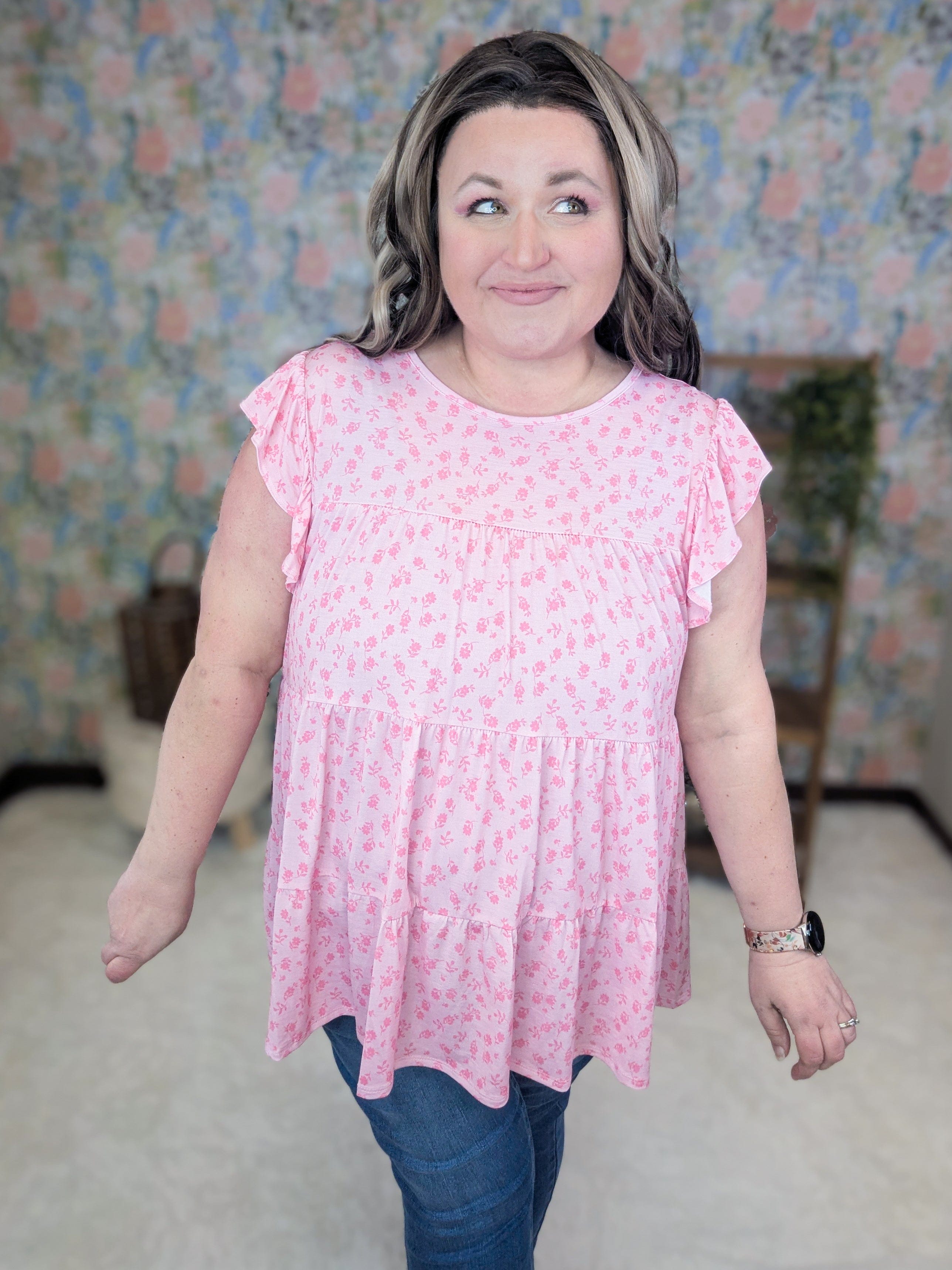 Miles Tiered Flutter Sleeve Top in Pink Ditsy Floral