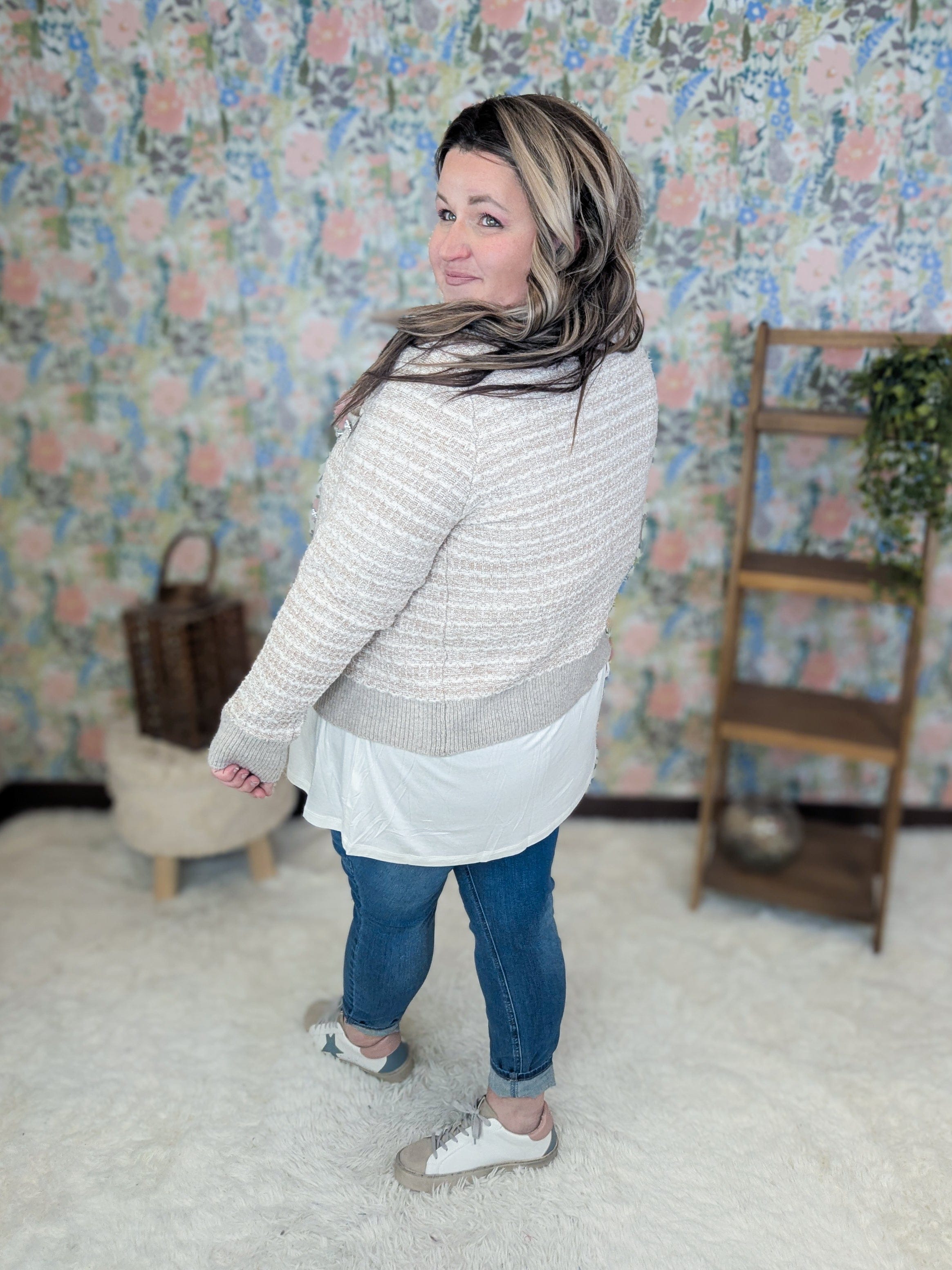 Have you noticed the classic “ladylike” cardigan trend popping up everywhere right now? This one gives that polished, timeless vibe without feeling stuffy. The tweed-inspired knit and gorgeous pearl buttons instantly dress up an outfit, but it’s just as cute thrown on over a simple tee and jeans. Wear it to work, style it over a little black dress for an elevated look, or keep it casual with your everyday basics.