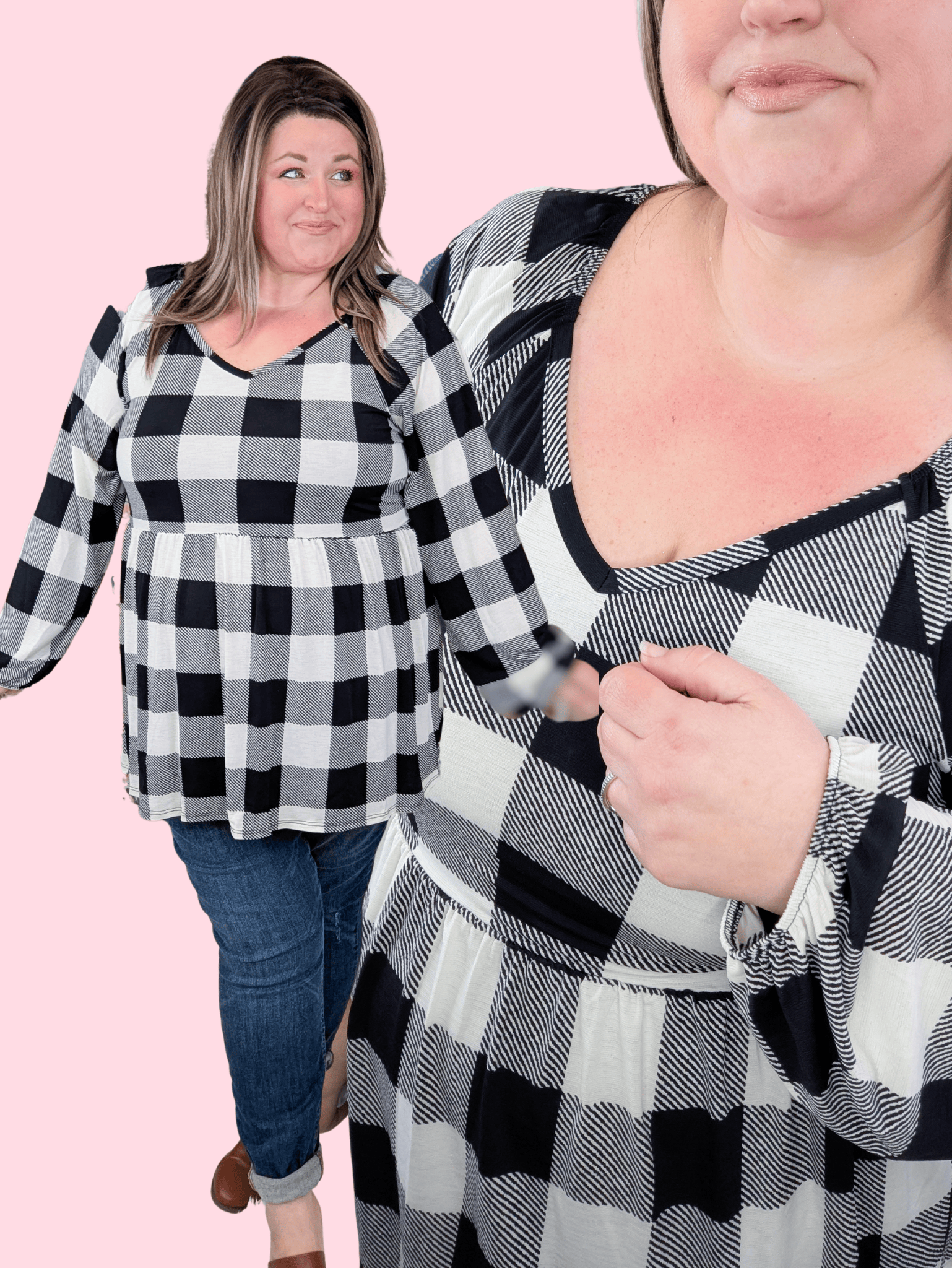 If you love a classic plaid moment but still want something soft, comfy, and flattering, this one’s your new go-to. The wrinkle-free Bulgari fabric feels amazing on and moves with you, while the elastic babydoll waist gives that easy shape without any squeeze. The v-neckline is ultra-flattering (we’re obsessed with this cut!), and the flowy fit makes it perfect for work, weekend, or family photos.