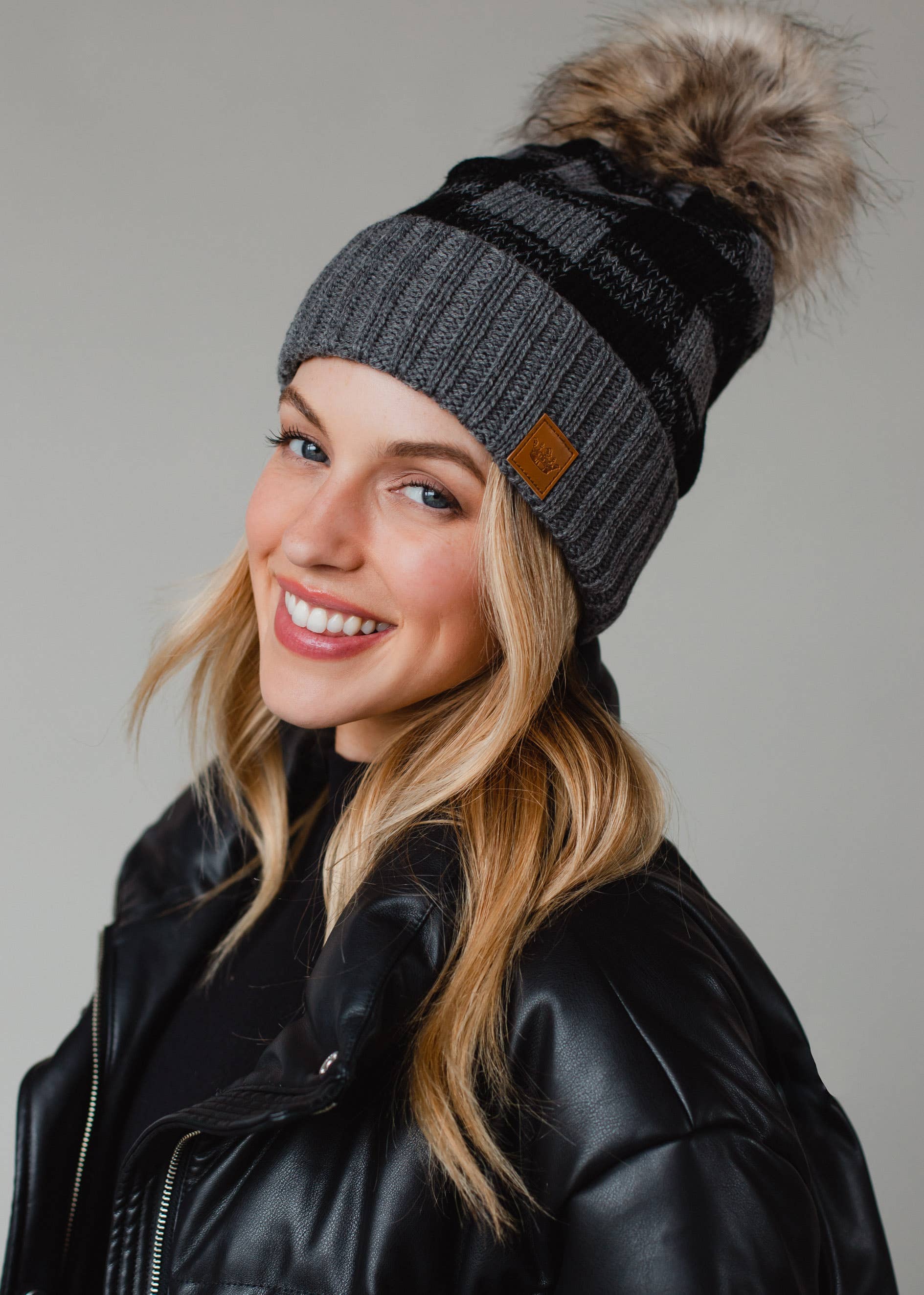 • Gray and black buffalo plaid stocking cap