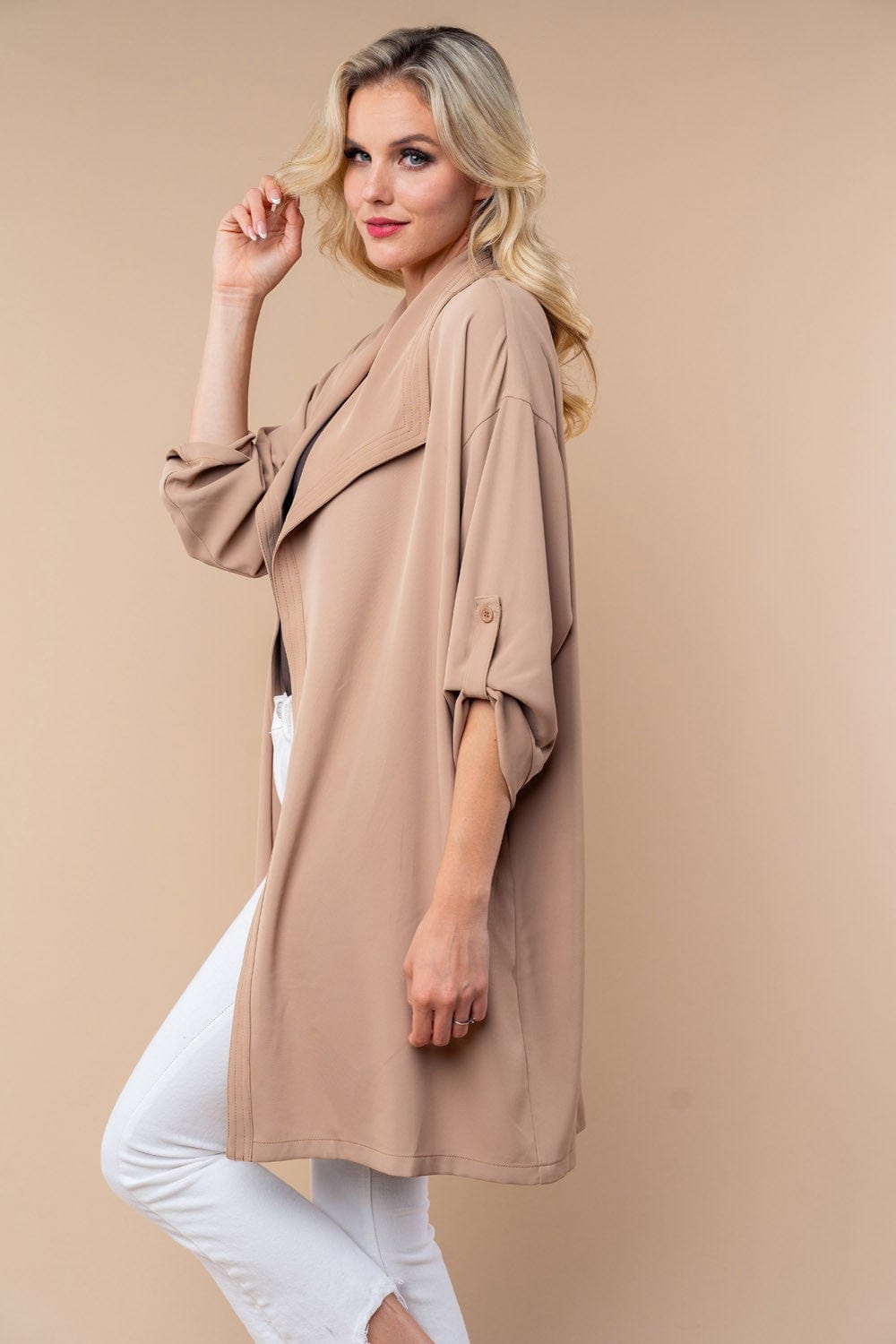 When you want that effortless “I just threw this on but somehow look wildly put-together” vibe, this piece delivers. It has that cool trench-coat energy without the stiffness or bulk, and the drapey fabric gives it a luxe, expensive feel without trying too hard. One of those magical layers that instantly elevates leggings, jeans, or a simple dress… aka the kind of outfit cheat code we love.