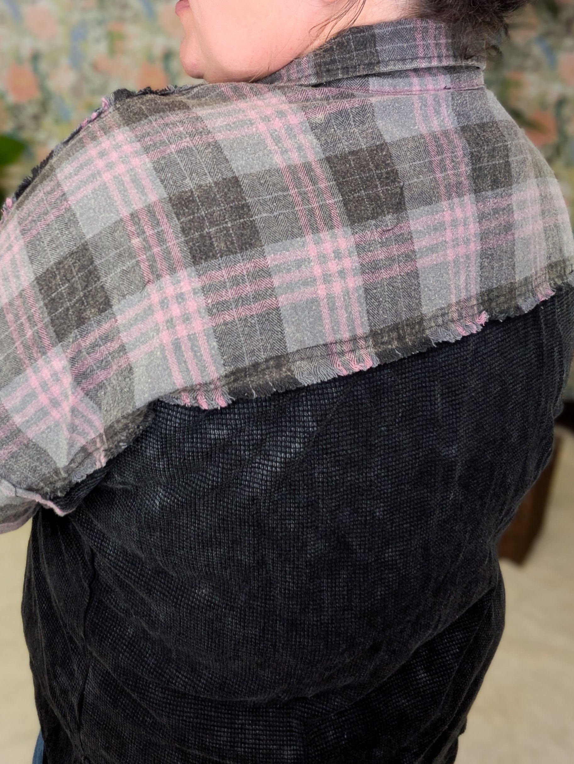 Finally — the plaid button down that actually fits! The Calla has all the cute plaid vibes without the shoulder pulling, chest gapping, or stiff fabric we’ve all suffered through. With its clever mix of plaid flannel in the front and back and mineral-washed thermal knit at the sides and arms, you get the classic plaid look with the stretch and comfort you really want. It’s the perfect answer to “why can’t plaid be cute and comfy?”