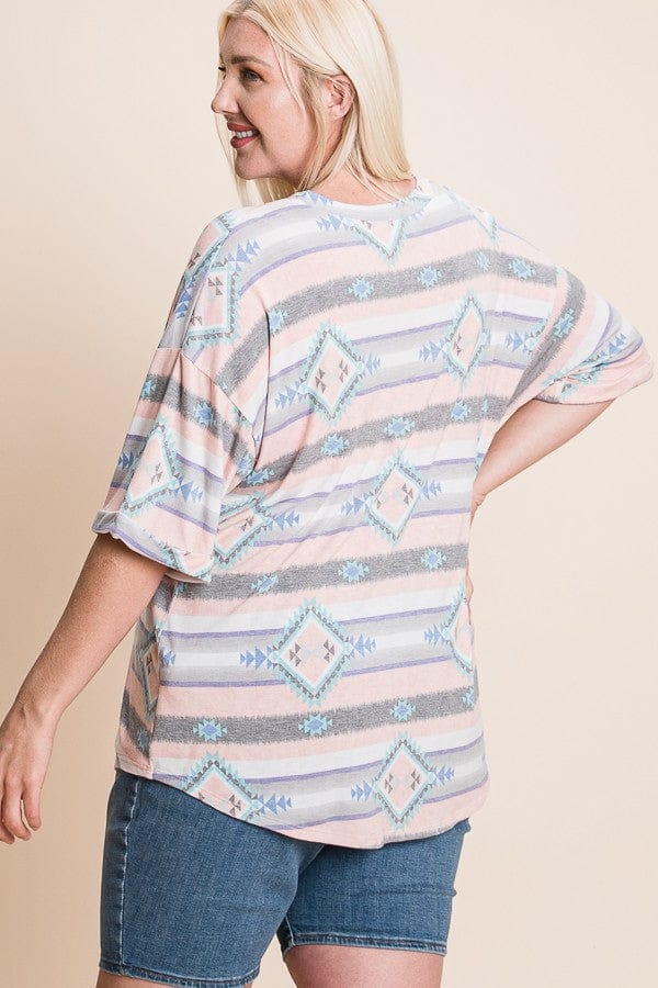 Ready for a fresh print that doesn’t just blend in with all your spring florals? This aztec is that fun, slightly unexpected pop that still feels totally wearable. It gives you color and personality without being loud, and the relaxed shape, elbow sleeves, and easy drape make it one of those tees you’ll reach for on repeat.