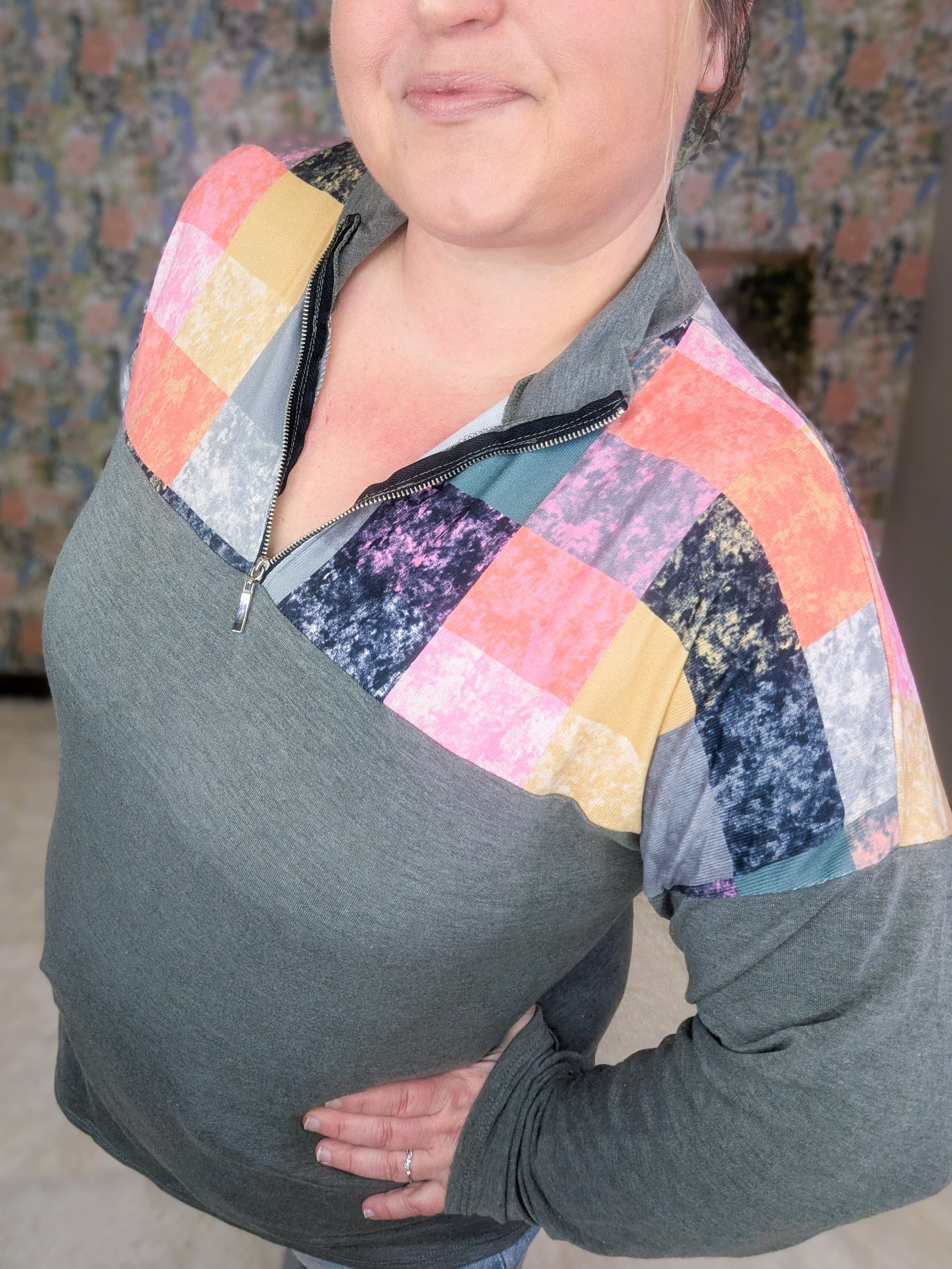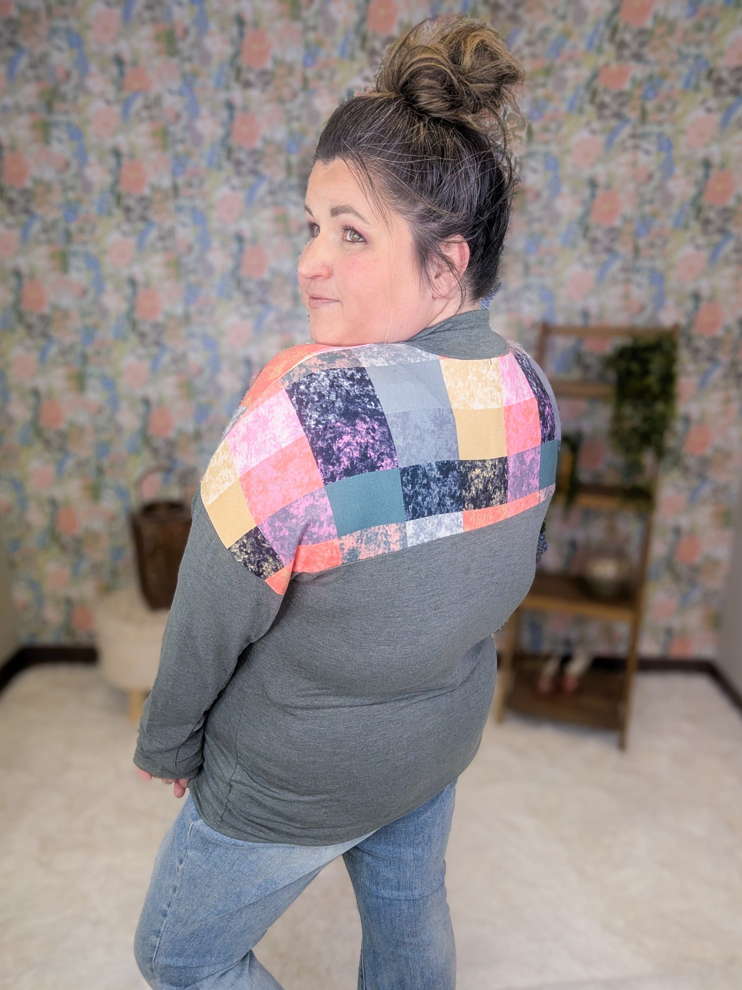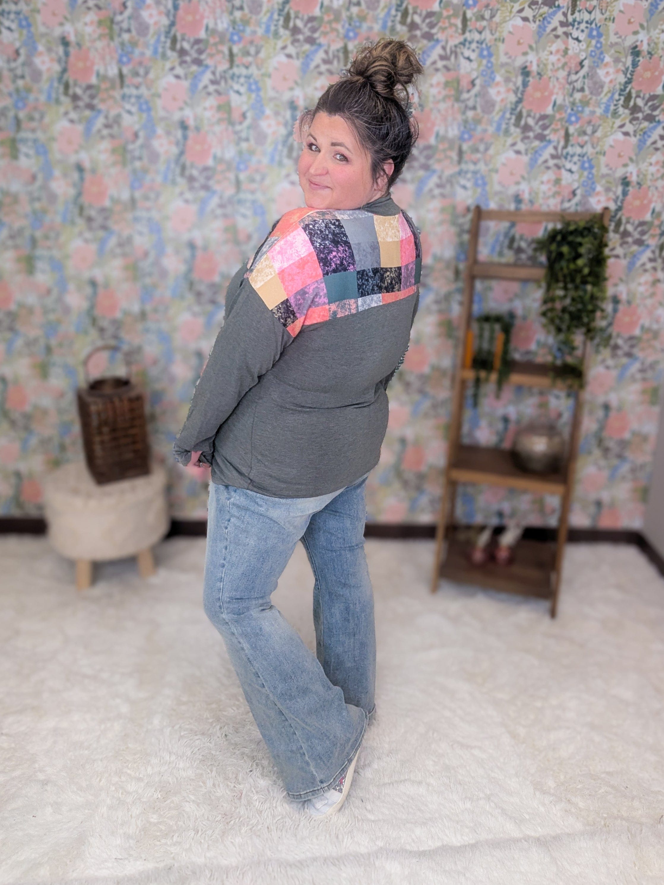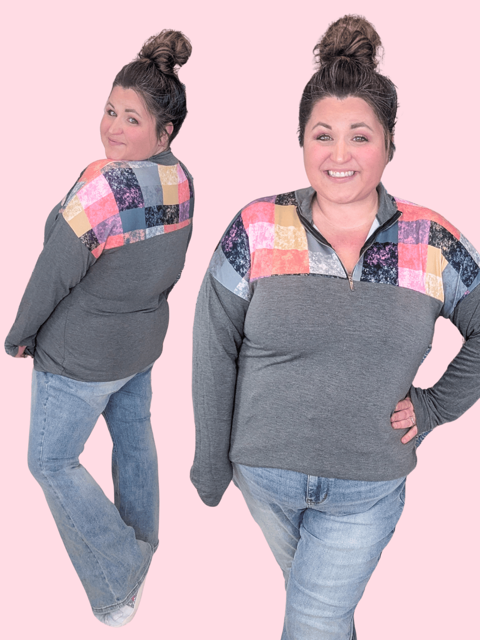 Want something colorful without feeling loud or over the top? This one gives you the perfect pop right where it counts. The geometric paint-splatter panels add fun personality up top while the soft heathered base keeps it easy, wearable, and perfect for everyday life.