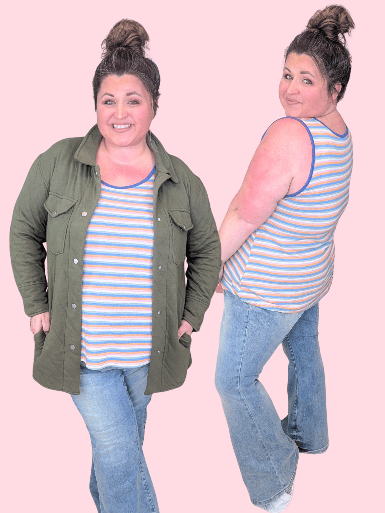 Looking for something fun that isn’t another floral but still feels totally spring ready? This retro stripe tank brings all the personality without trying too hard. The scoopneck shape gives you that flattering, easy fit up top while staying flowy through the midsection, and the denim blue piping pulls everything together for a polished little pop. It layers like a dream under jackets and shackets but is just as cute worn solo when the weather warms up.