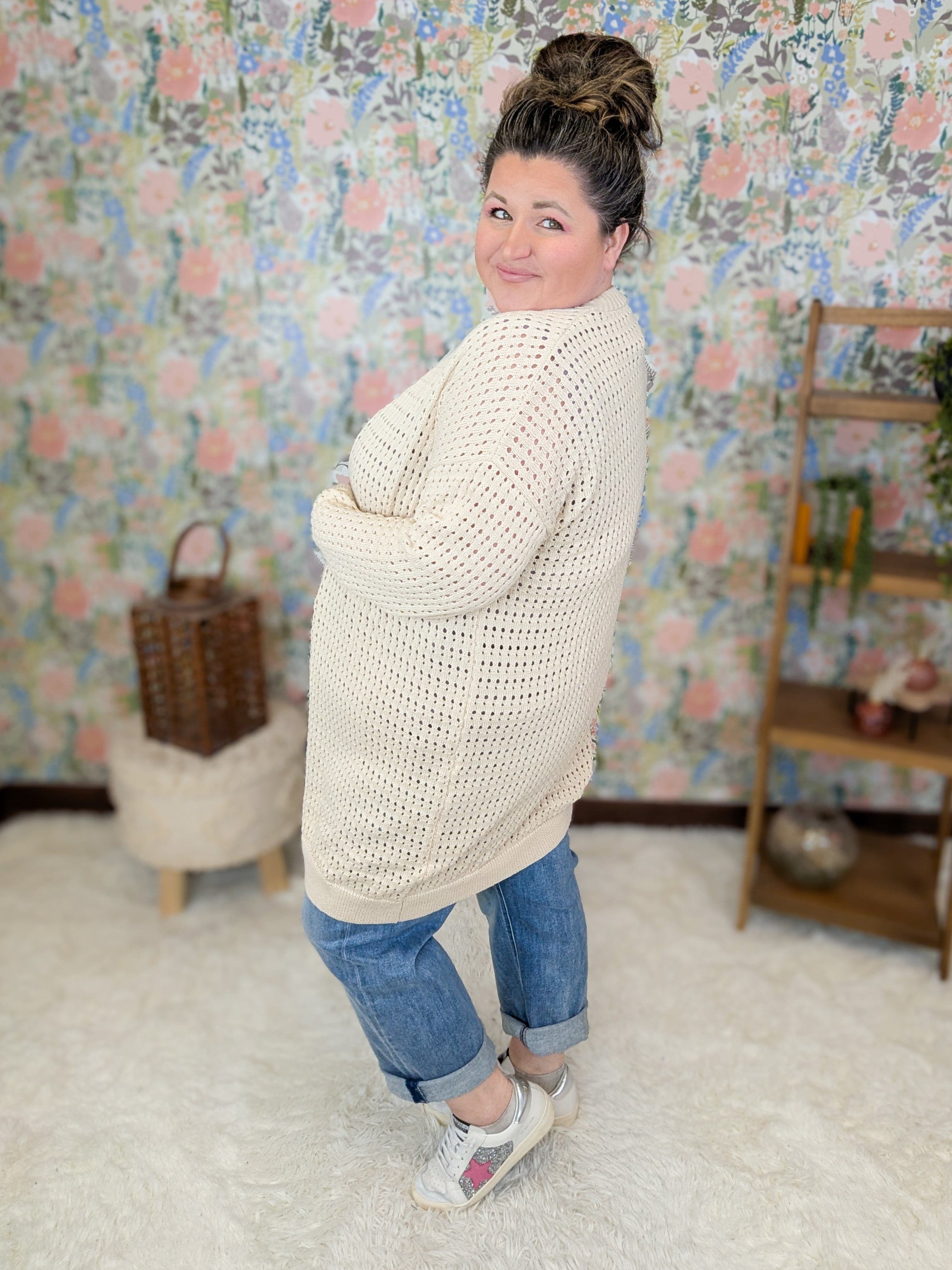 Lightweight layering season is officially here… and this is exactly the kind of cardigan we reach for when we want coverage without heat. The Nixie gives you that easy sweater look without feeling bulky or wintery. The airy open knit keeps things breathable while still giving arm coverage and a little texture over tanks, tees, and dresses. That creamy taupe neutral truly goes with everything. Toss it on with denim, leggings, work outfits, or even over sleeveless dresses when mornings start chilly but afternoons warm up fast.
