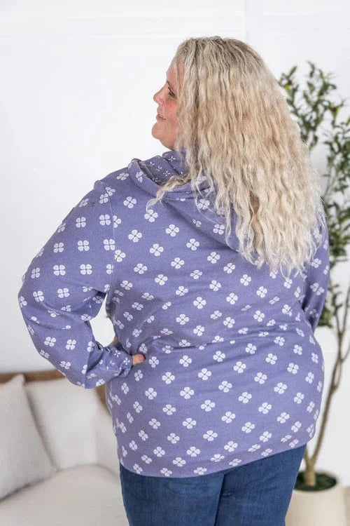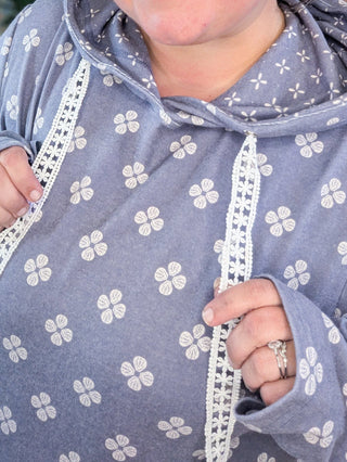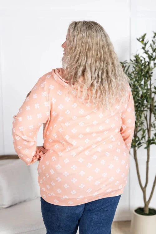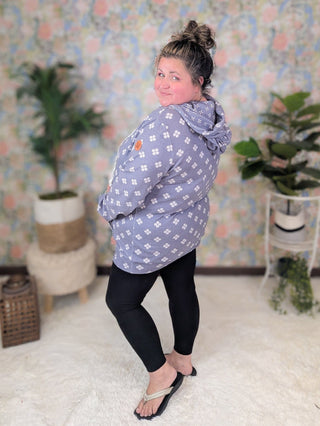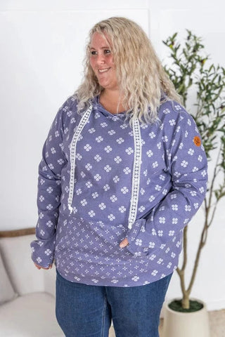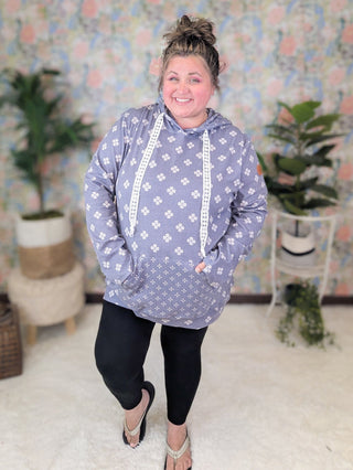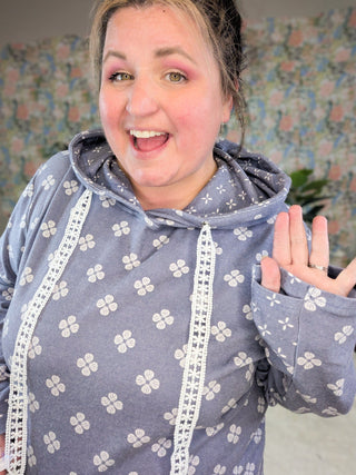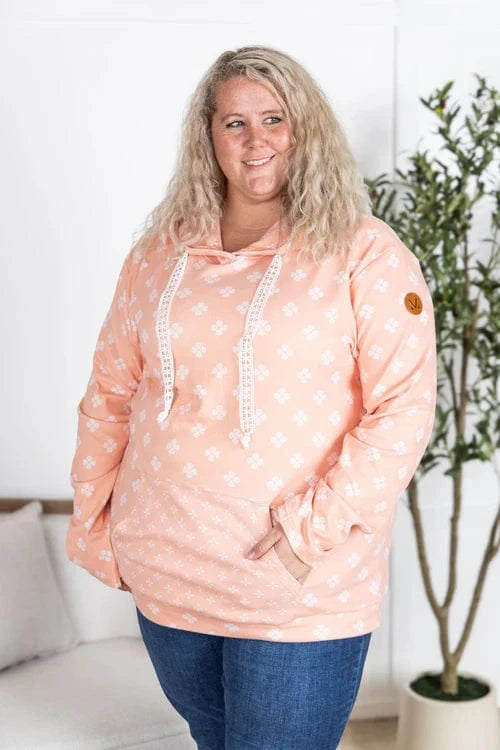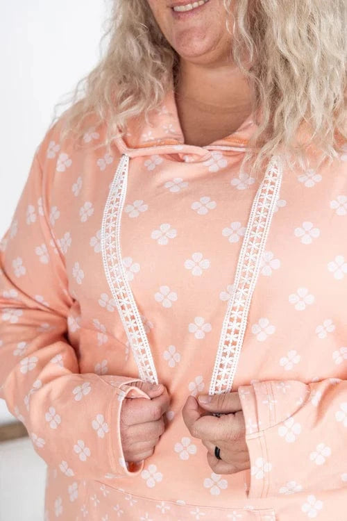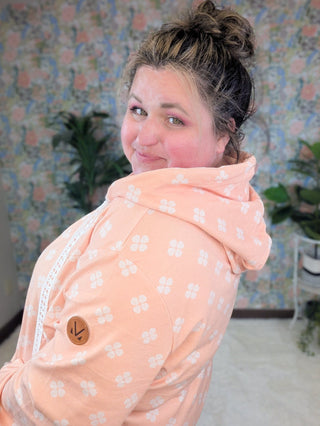 This PHC pullover brings all the comfy vibes with our summer-weight triple stretch fabric—light, breathable, and stretchy from top to bottom (yes, even the band). The sketched floral print adds a soft, feminine touch, while those white lace drawstrings totally steal the show. With thumbholes, a kangaroo pocket, and a pop of contrast floral inside the hood, and on the kangaroo pocket-- it’s equal parts cute and functional. Choose peachy coral or faded navy—both perfect for year-round wear.