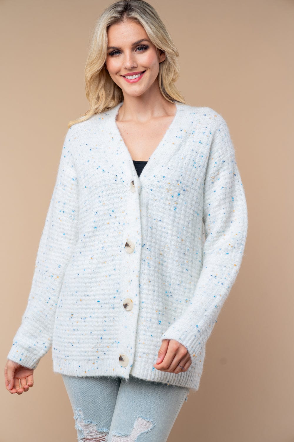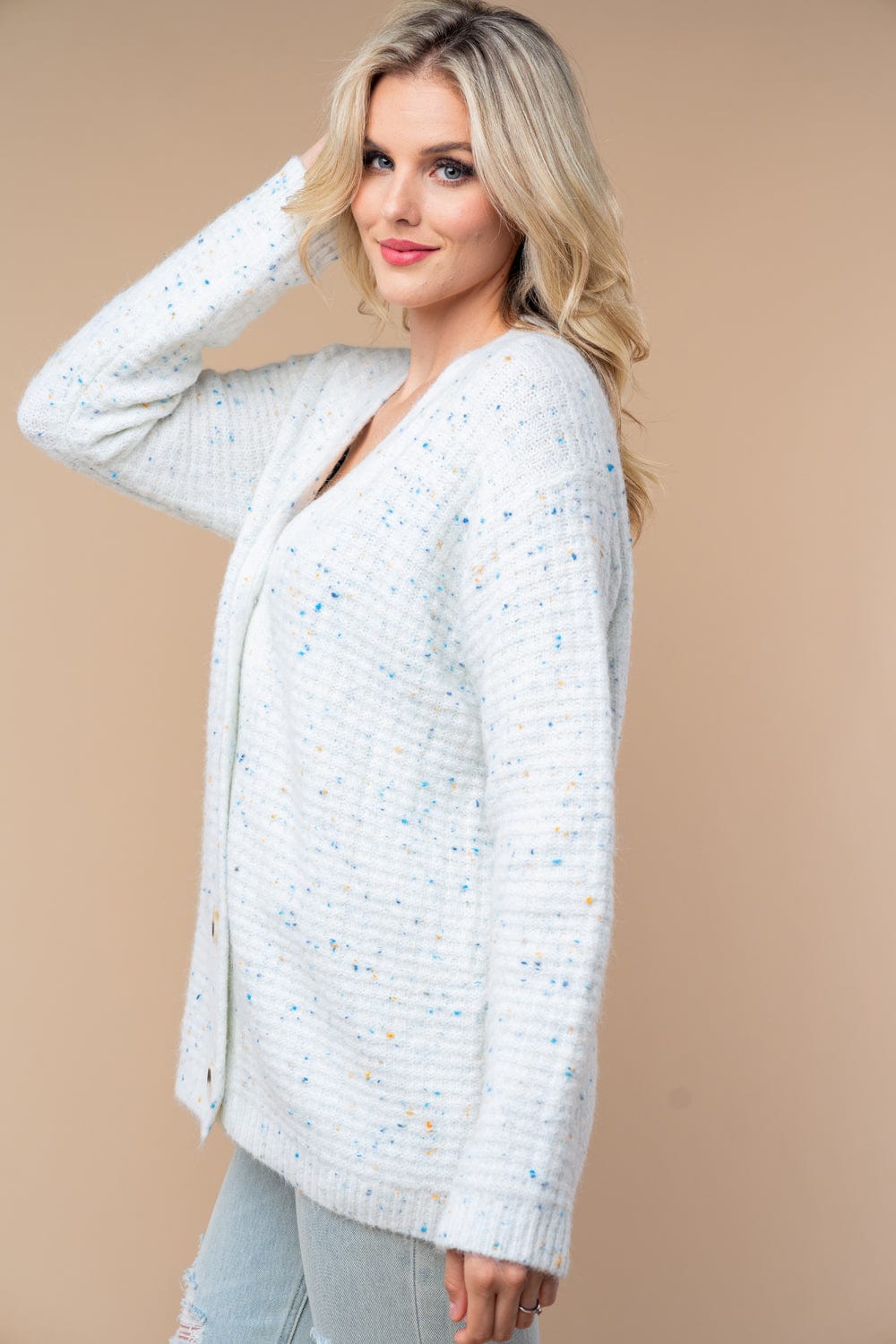 You know that one cardigan you keep by the door because it instantly makes any outfit better? This is that girl. A true sweater knit with the prettiest quilted texture up close, oversized buttons, and the dreamiest little pops of turquoise, royal blue, and golden yellow sprinkled through the ivory base like confetti. It’s cozy but not itchy, perfectly throw-on-and-go for spring, and looks just as good tossed over a bright tank as it does layered up for cooler days.