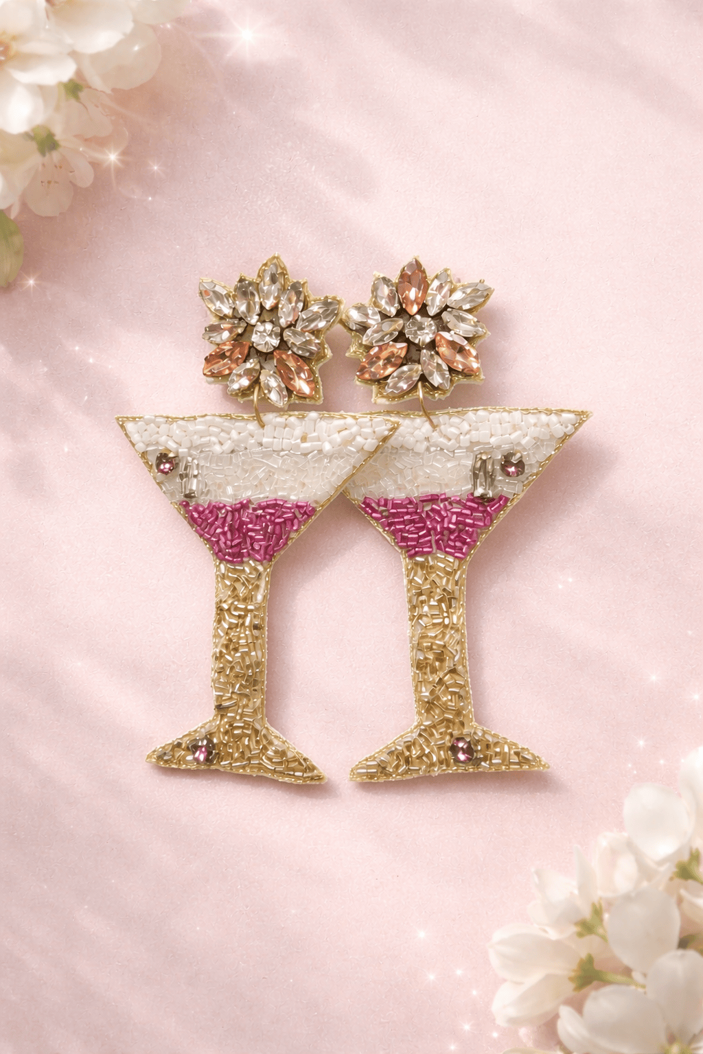 Hand-beaded champagne glass earrings featuring a pink “pour” detail and a stunning gem cluster floral stud at the top. A little glam, a little fun, and perfect for making a statement.