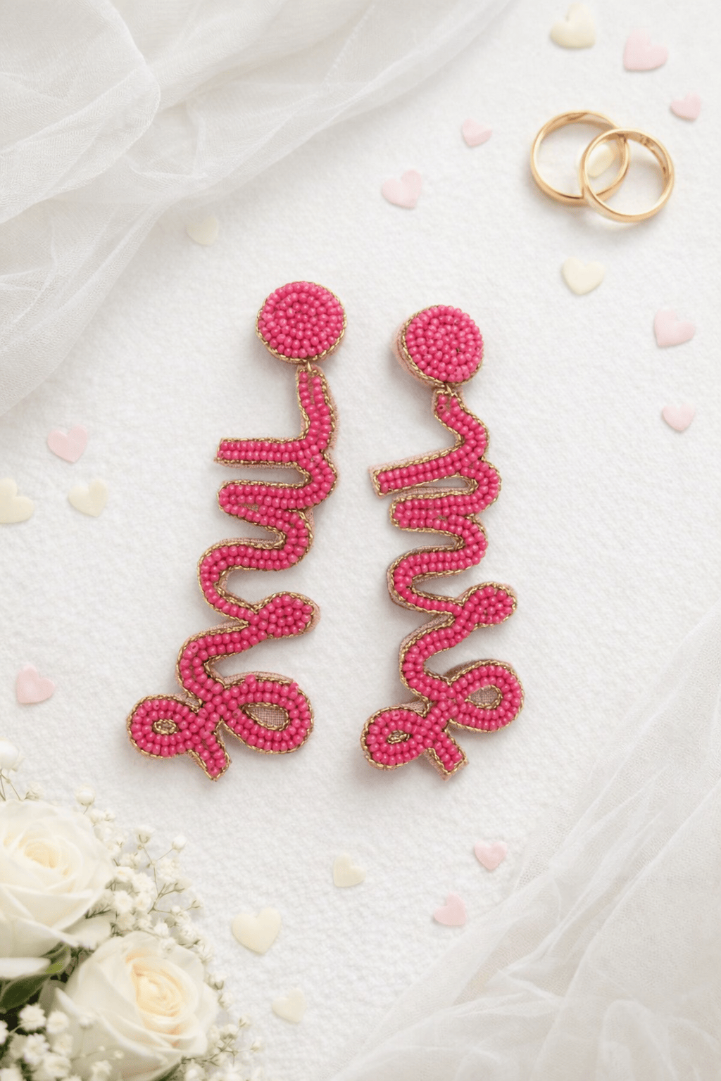 Hand-beaded pink “MRS” earrings with gold trim detail and a round beaded stud top. Bold, fun, and perfect for celebrating the bride in style.
